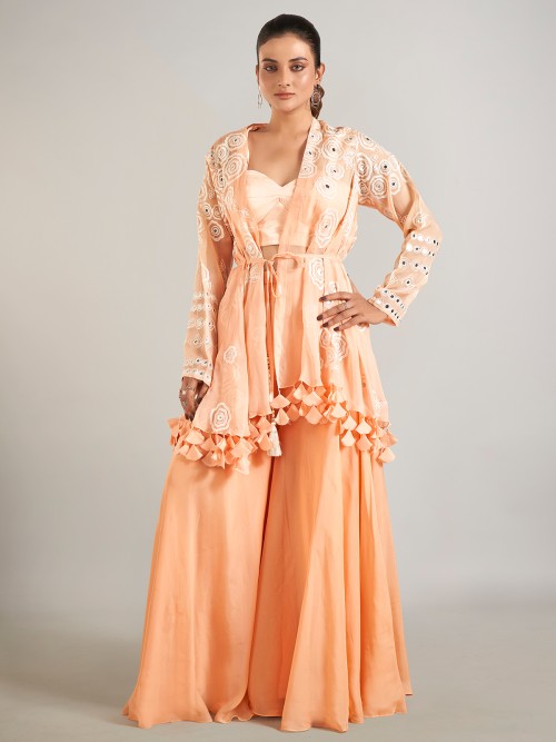 Stand out from the crowd with this peach jacket-style palazzo suit. Made from georgette fabric, it is beautifully adorned with thread and aabla work, making it a perfect pick for any event.