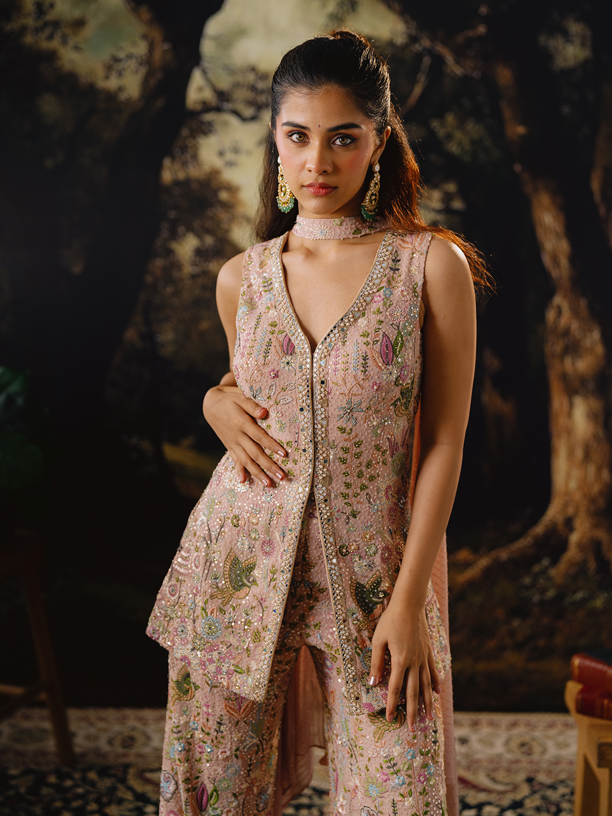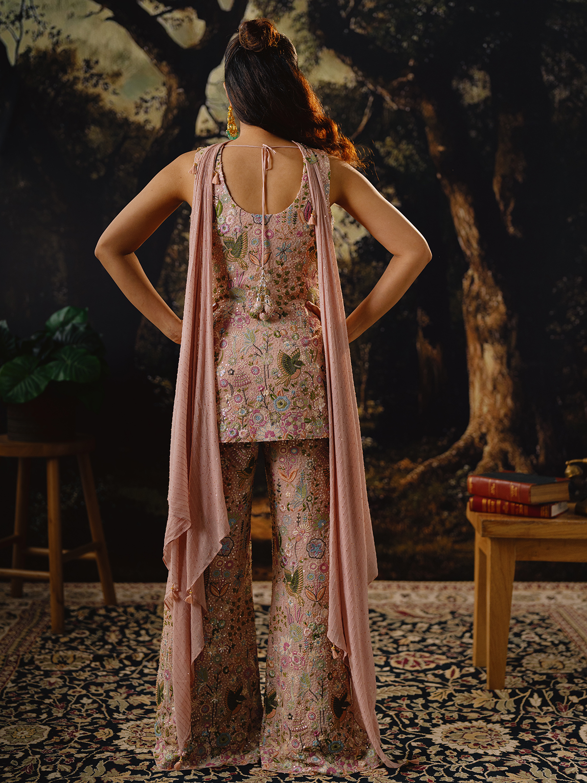 Soft and graceful, this peach georgette palazzo suit reflects delicate beauty with intricate craftsmanship. The sleeveless V-neck kurti is enriched with mirror, cutdana, thread, sequins, beads and zardosi work that enhances its festive allure. Paired with a flared palazzo, this elegant outfit is ideal for wedding festivities and receptions.
