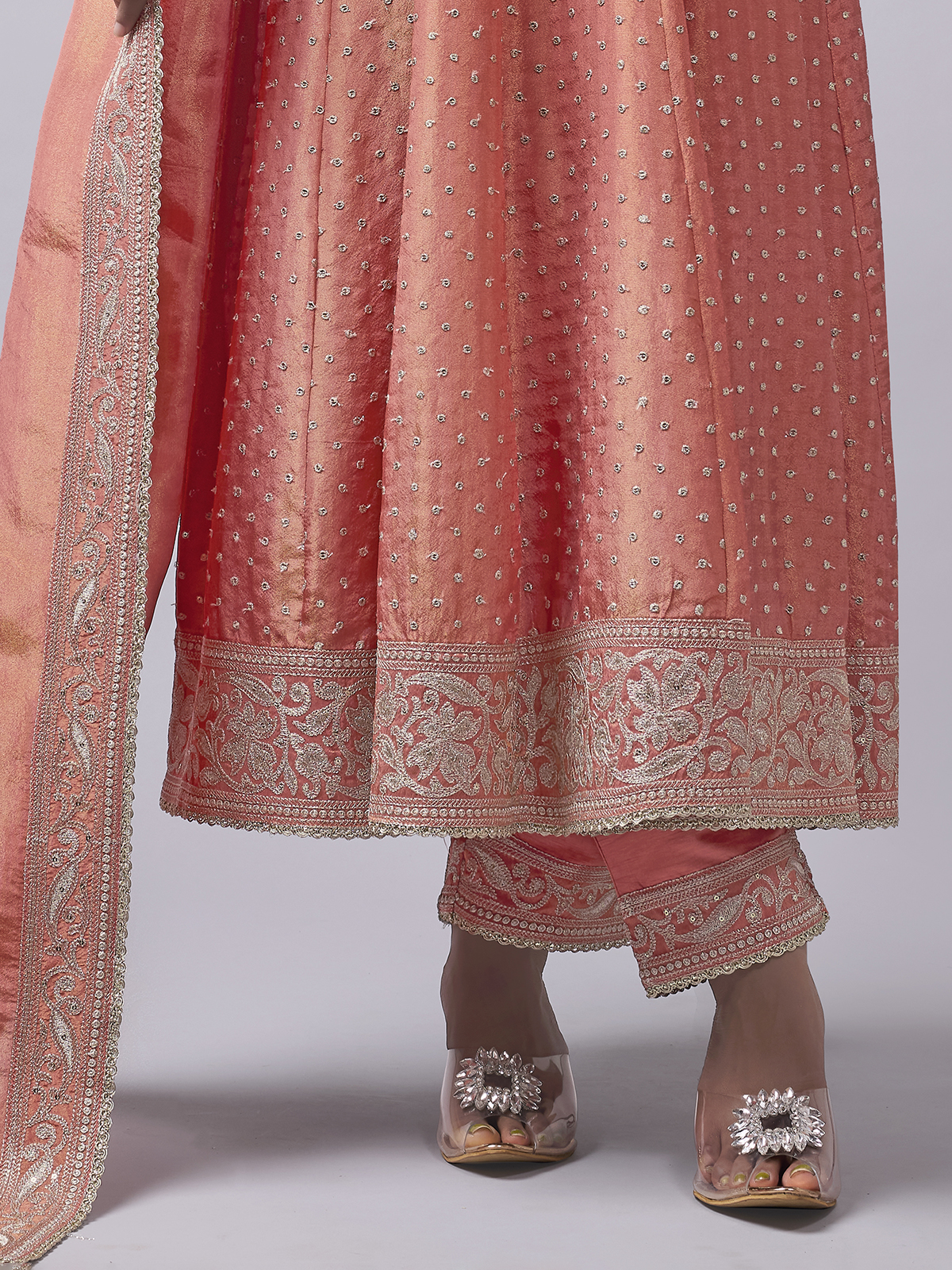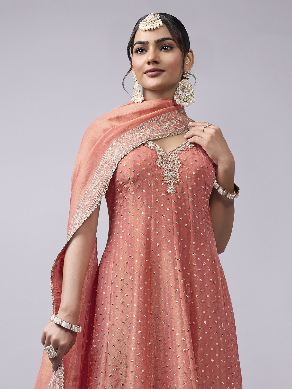 The peach silk anarkali showcases soft, flowing movement and a serene festive charm. Resham and sequins glisten gently along the sweetheart neckline and sleeveless pattern, lending artistic radiance. Paired with tailored pants and a matching dupatta, the outfit brings together subtle shimmer, modern poise, and timeless elegance.