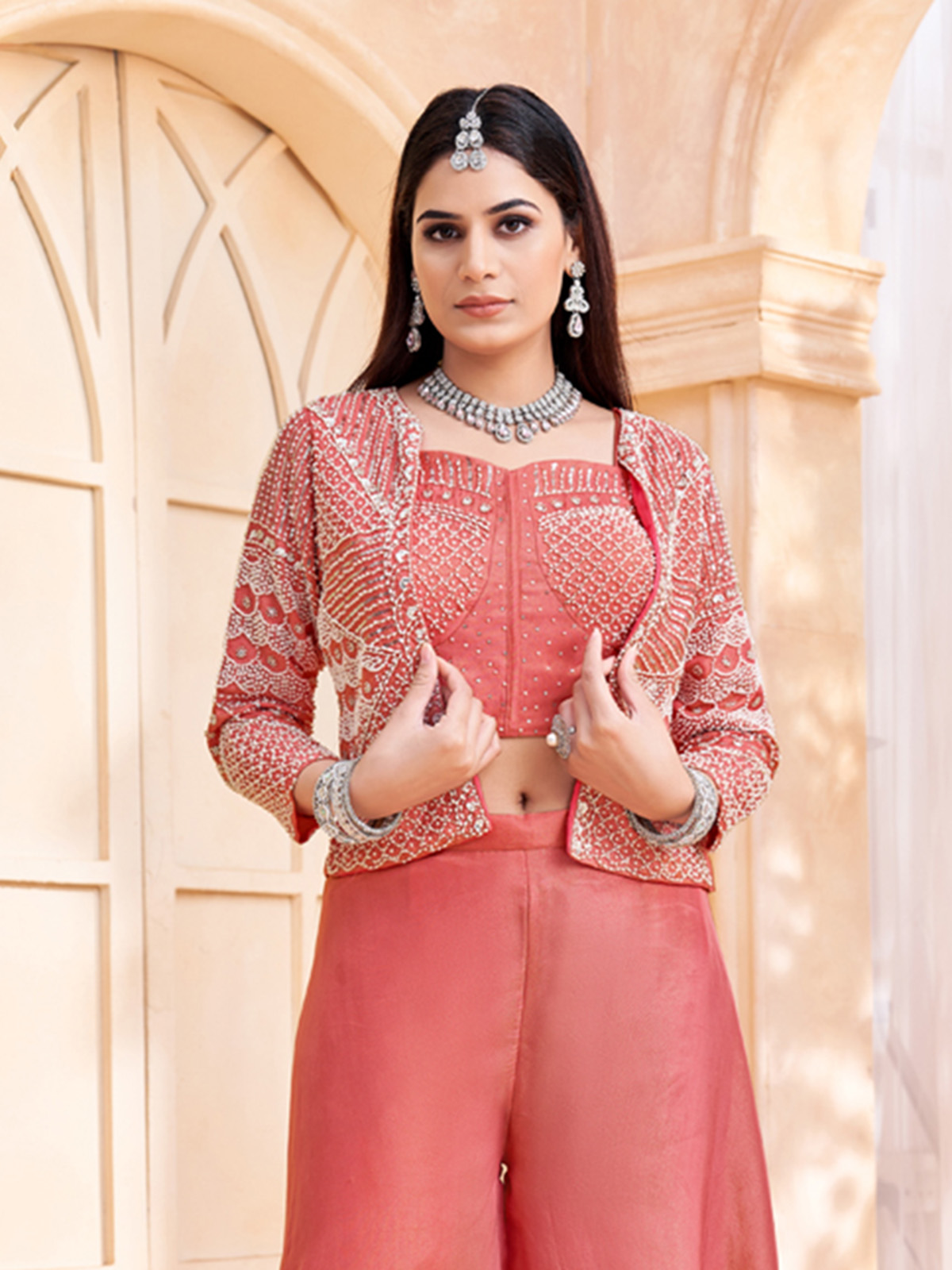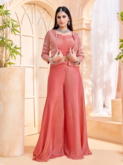 Peach Silk Designer Jacket Style Palazzo Suit For Festive