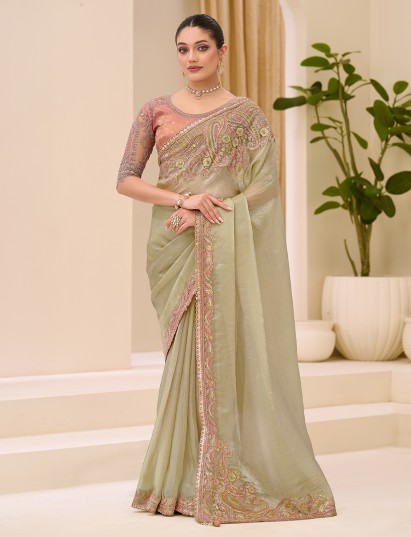 Soft peach hues bring delicate charm to this silk designer palazzo suit crafted for elegant celebrations. The stylish jacket style kurta is enhanced with shimmering cutdana, beads and sequins that highlight the graceful silhouette. Paired with flowing palazzo pants, the ensemble blends contemporary design with traditional elegance, making it perfect for weddings, festive gatherings and glamorous receptions.