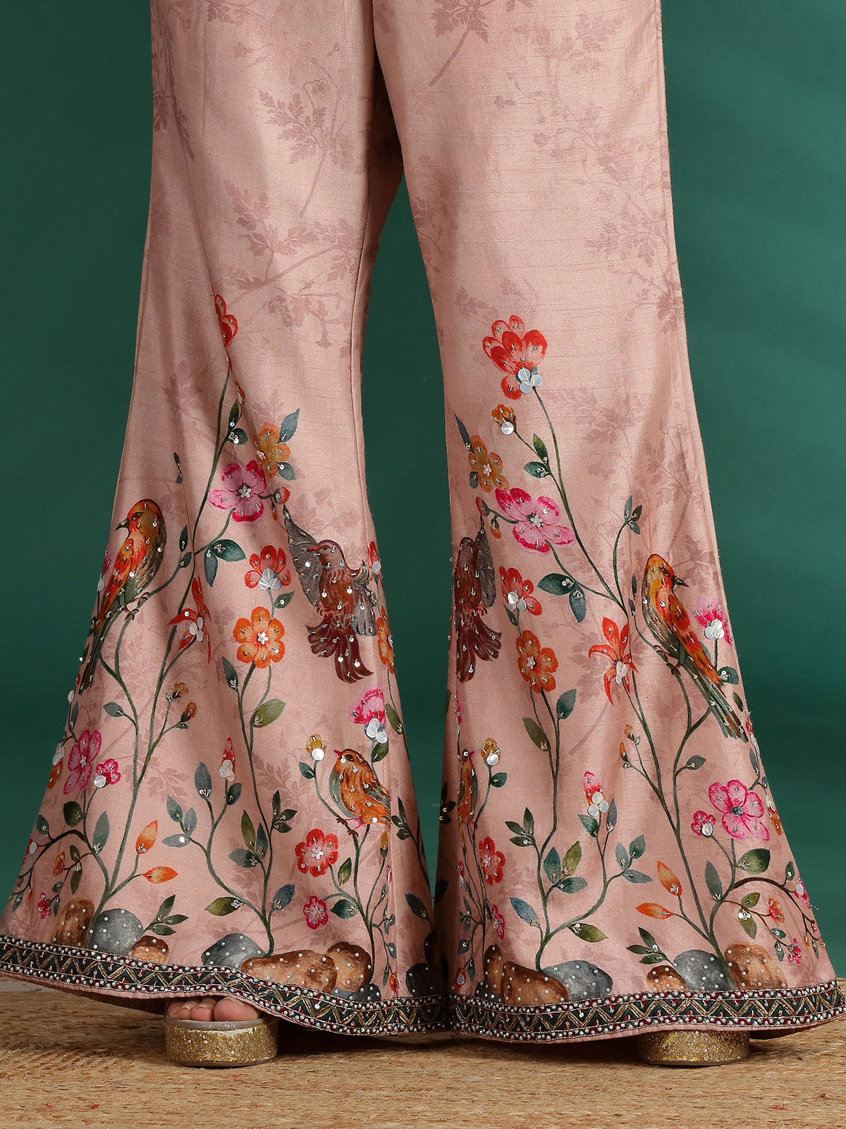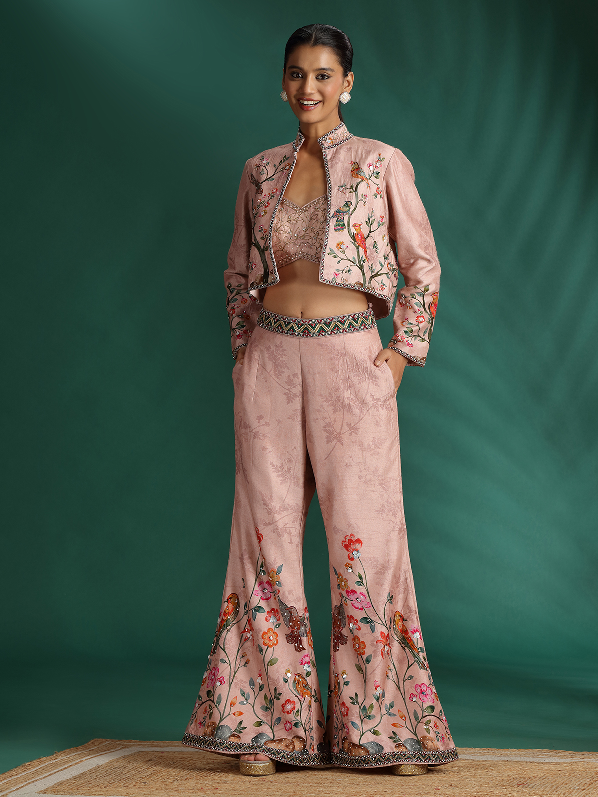 Radiate refined elegance in this peach silk palazzo suit, featuring a contemporary jacket-style silhouette with graceful prints. Adorned with cutdana, sequins, and bead embellishments, it blends modern sophistication with festive allure—an ideal ensemble for receptions, weddings, and celebratory gatherings filled with timeless charm.