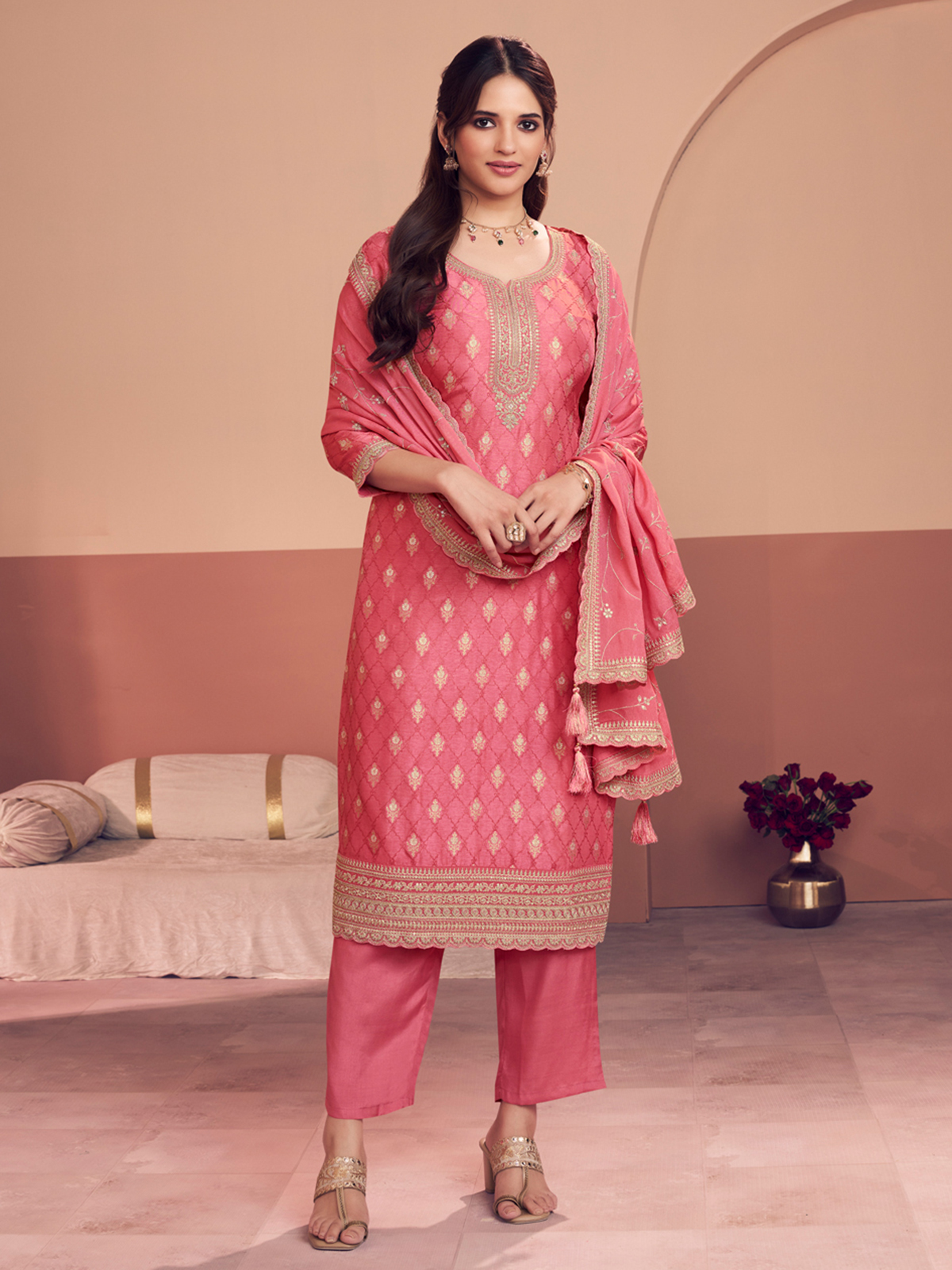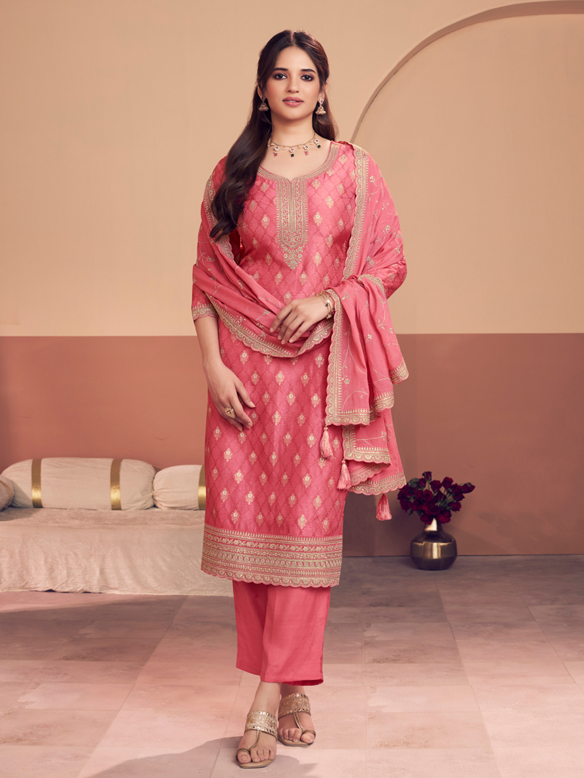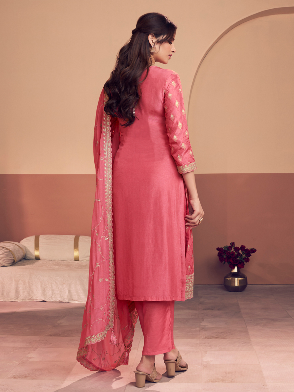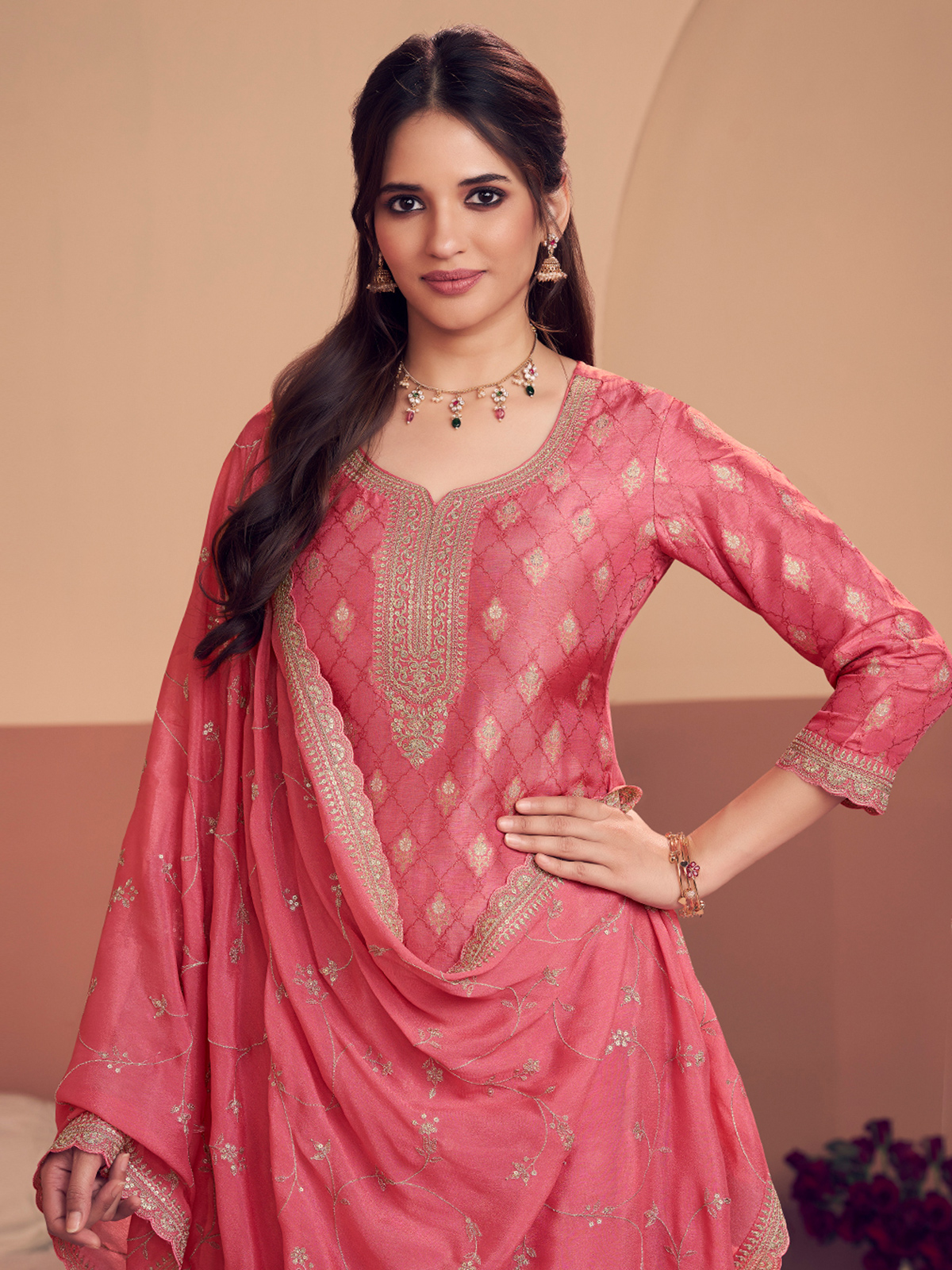 Radiate soft festive elegance in this beautiful peach silk salwar suit designed for graceful ethnic styling. The kurta features delicate resham, sequins, and zari work that adds subtle sparkle and traditional charm. Styled with a round neckline and quarter sleeves, it is paired with pants and a matching dupatta, making it a perfect choice for festive occasions, weddings, and sangeet events.