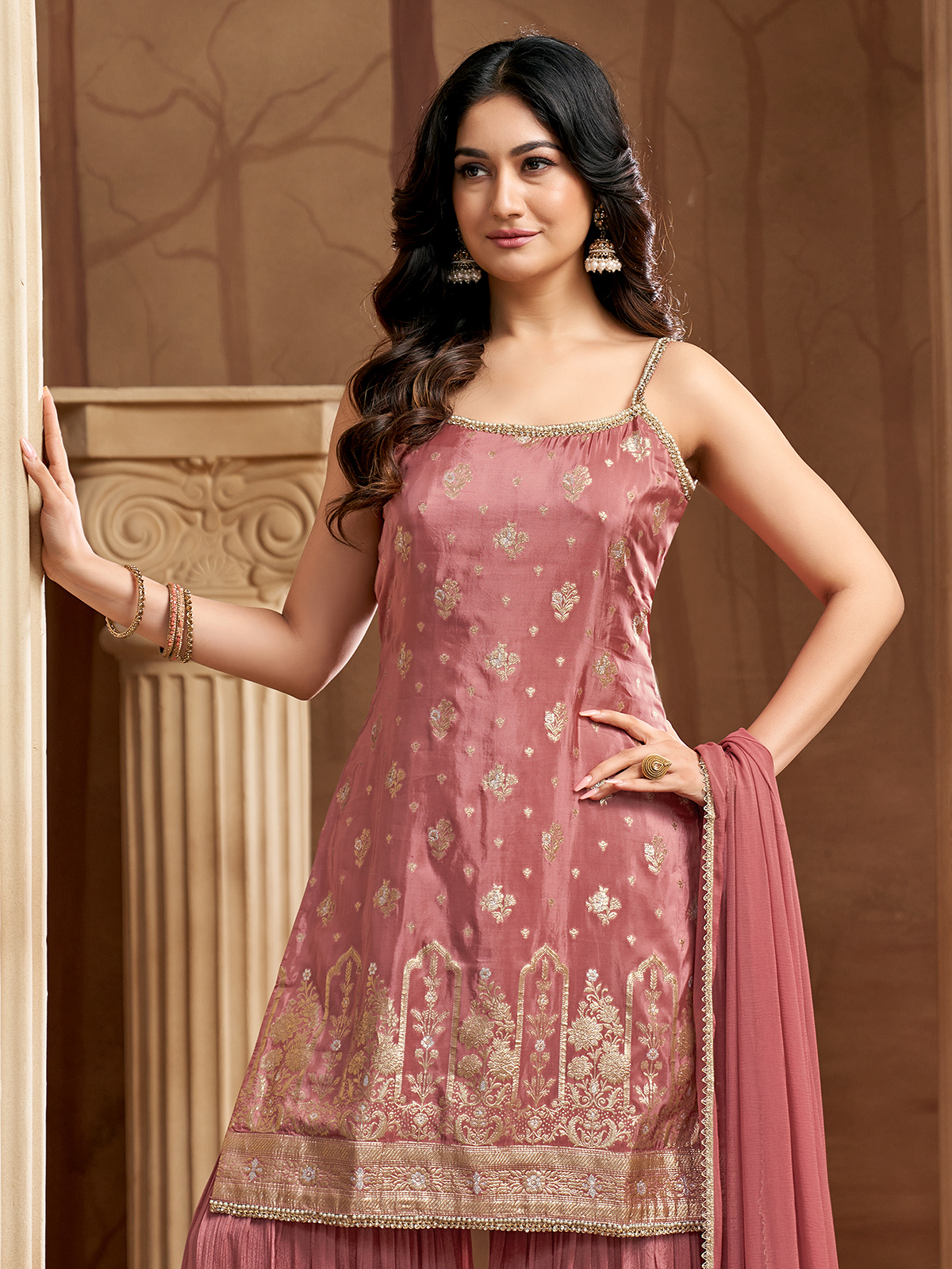 Soft elegance defines this peach silk sharara suit, glowing with cutdana, pearls, and diamond highlights. Styled with a round sleeveless neckline, it balances refinement with festive flair. The dupatta adds traditional richness, making it an exquisite option for weddings, Diwali, and joyous occasions.