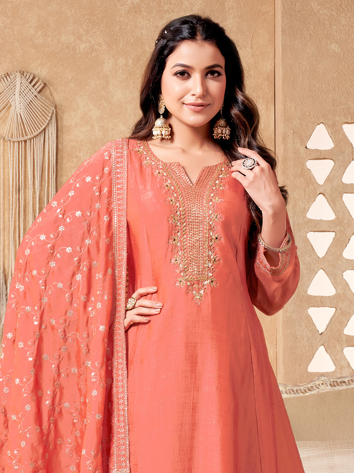 Crafted in peach silk, this suit highlights embroidery, sequins, beads, cutdana, mirror and zardosi work. Designed with a sweetheart neckline and quarter sleeves, it includes a dupatta and pant, ideal for festive and wedding events.