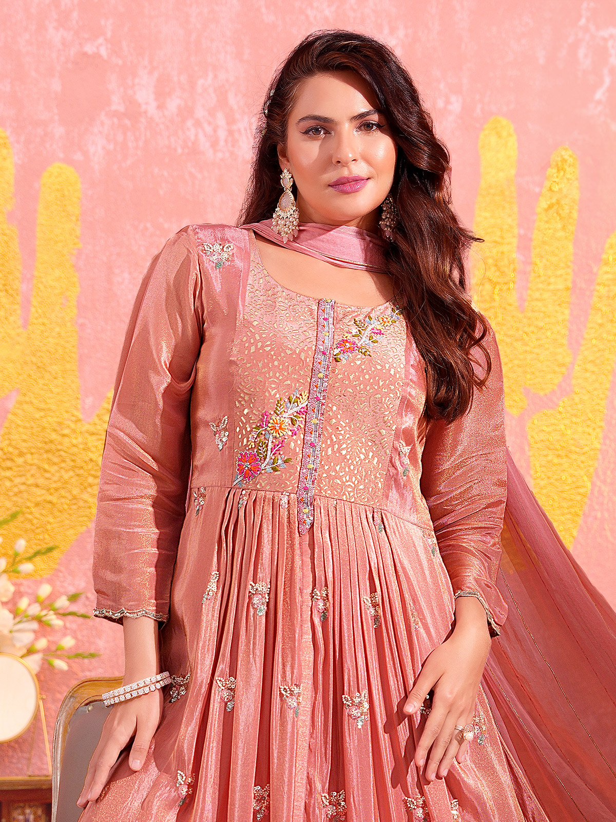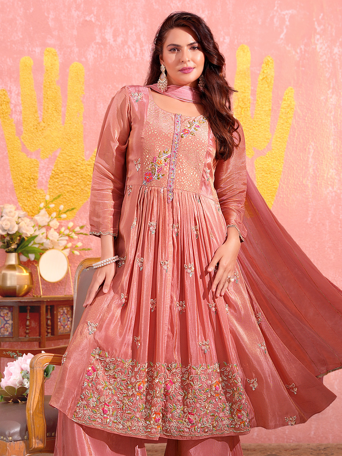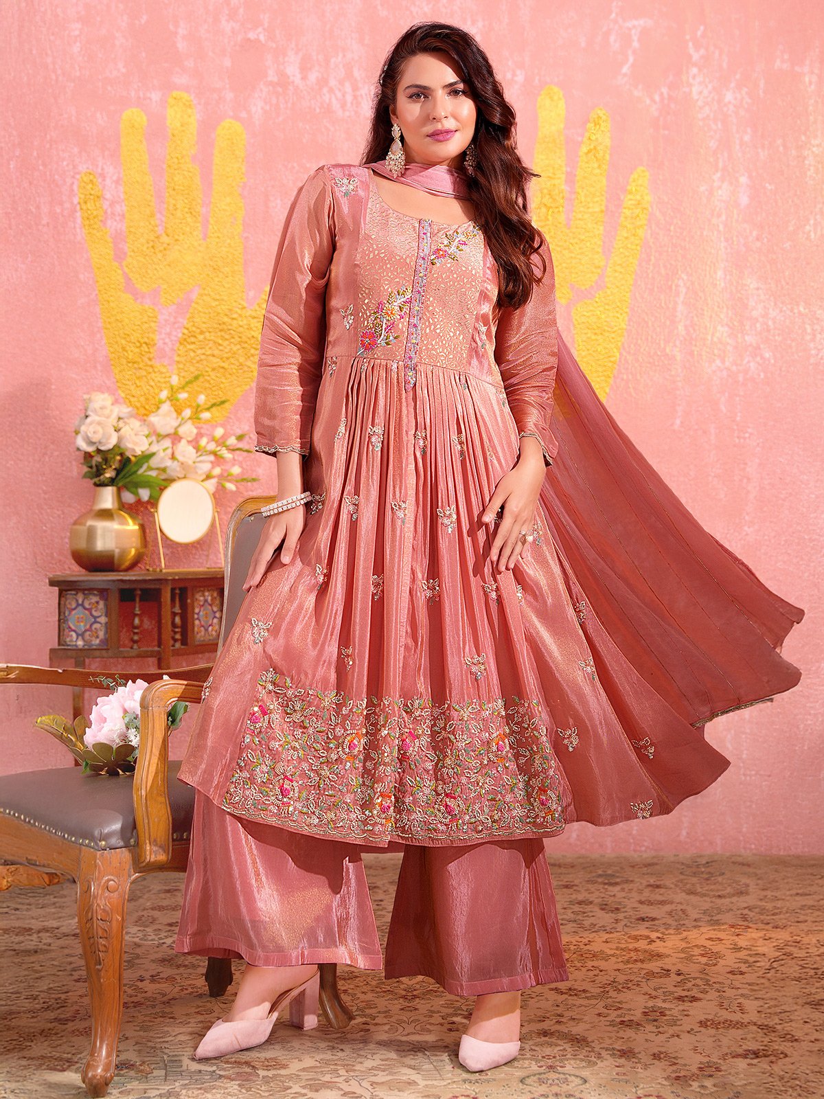 Peach Tissue Silk Pakistani Palazzo Suit With Embellished Detailing