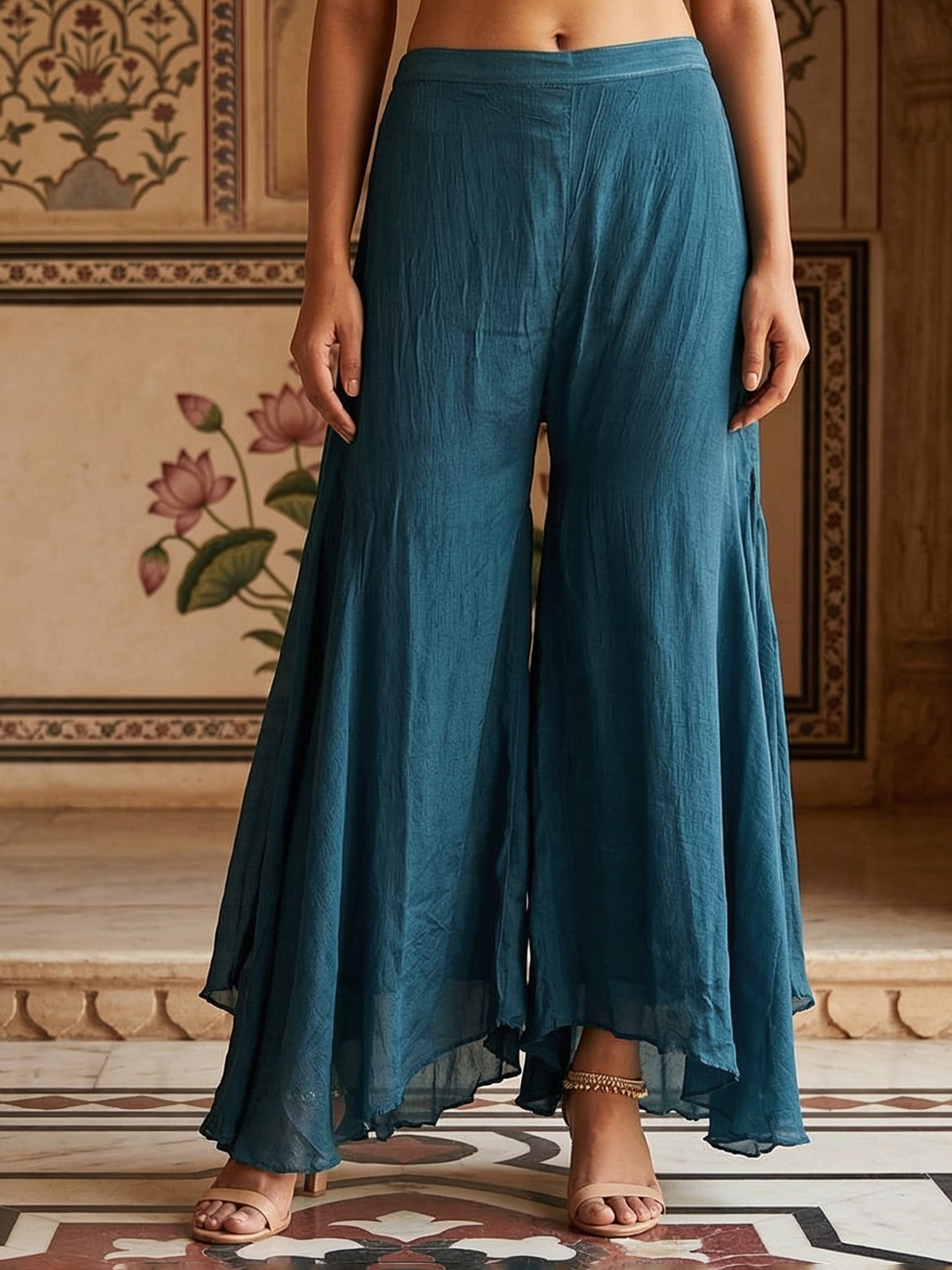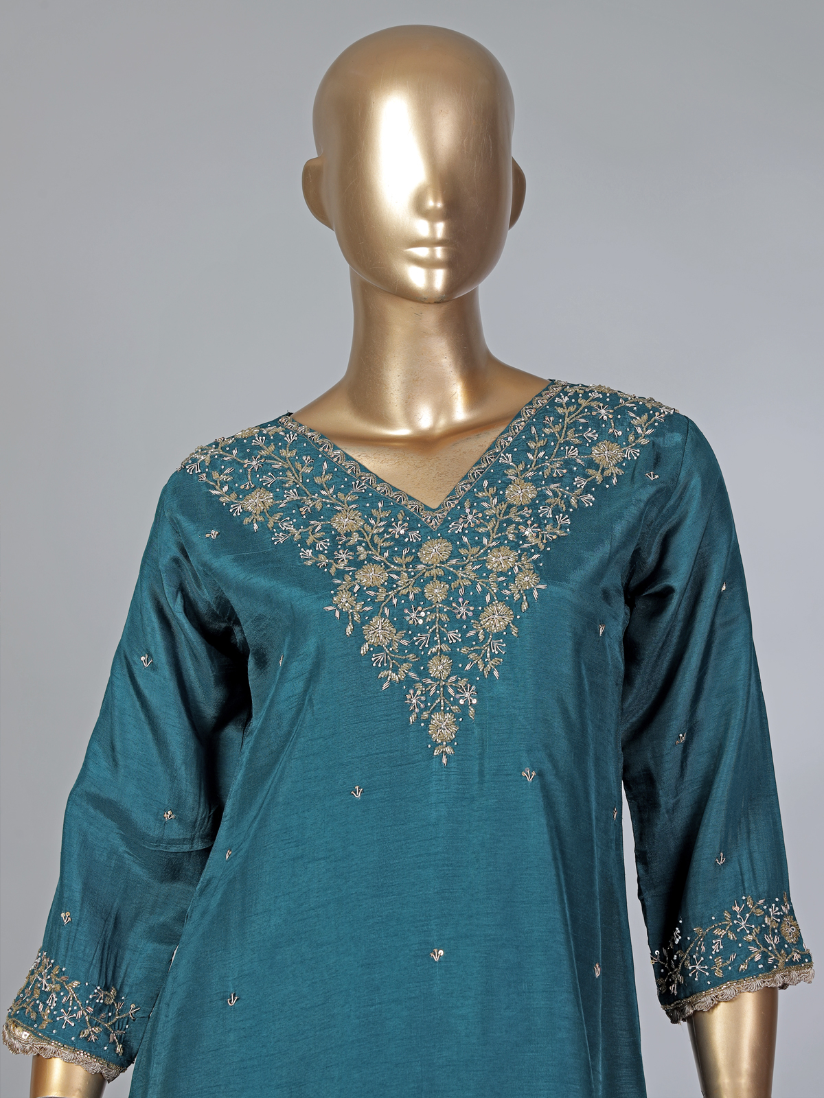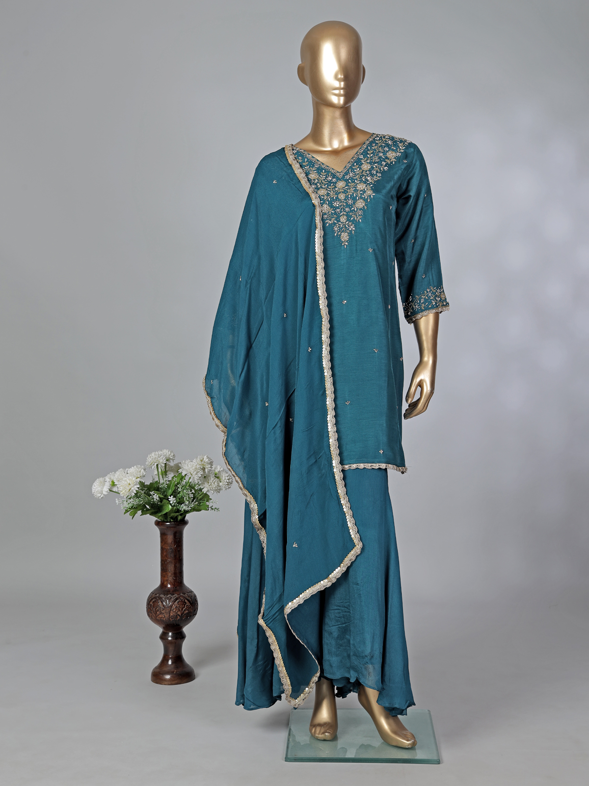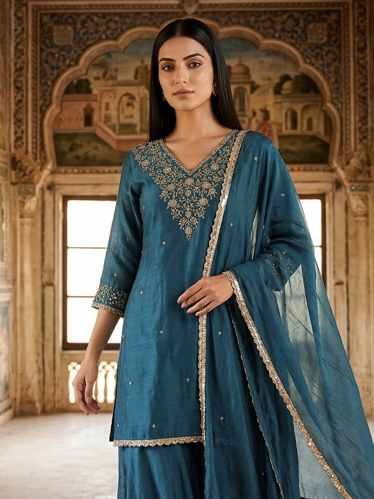 Regal and elegant, this peacock green silk palazzo suit features intricate cutdana, sequins, beads and zardosi detailing. The V neckline and quarter sleeves create a flattering silhouette, paired with a flowing palazzo and dupatta, ideal for festive celebrations.