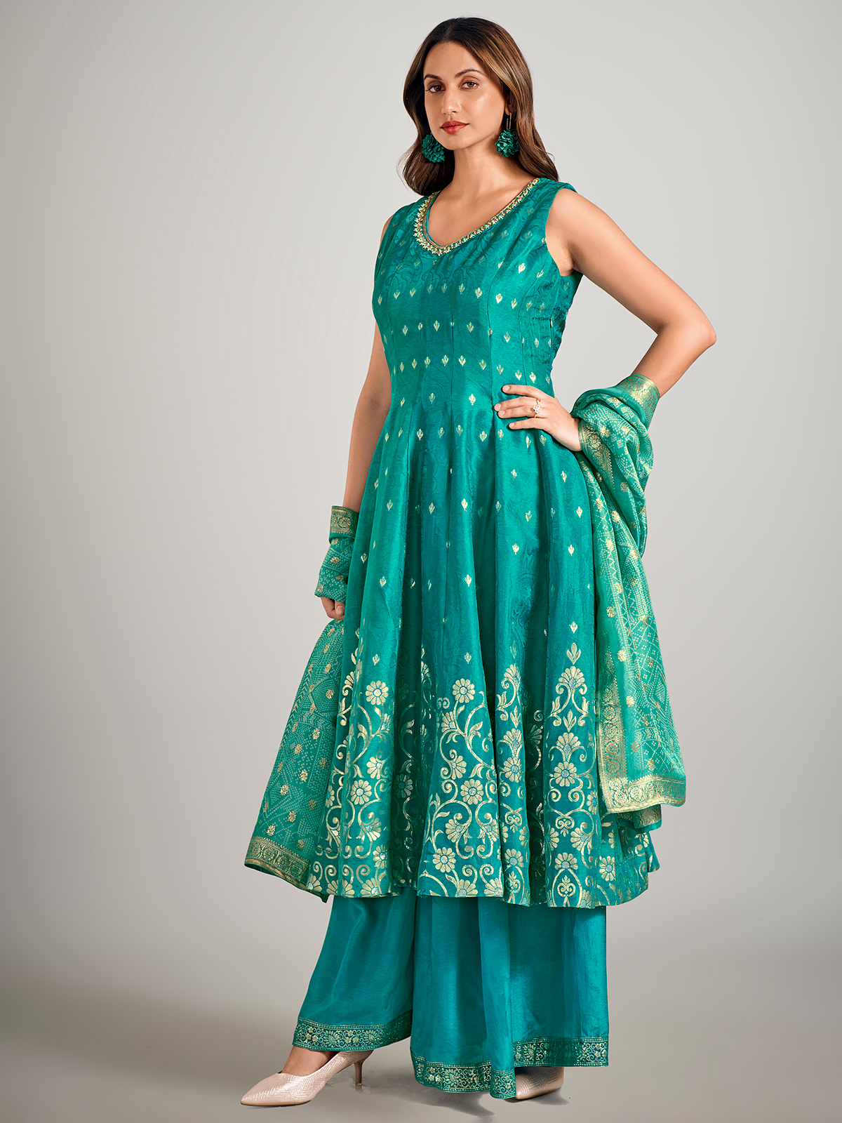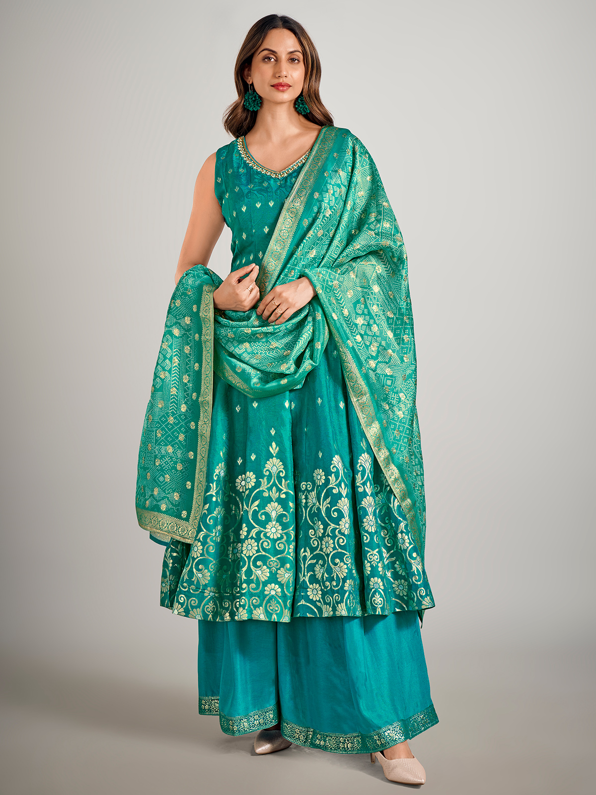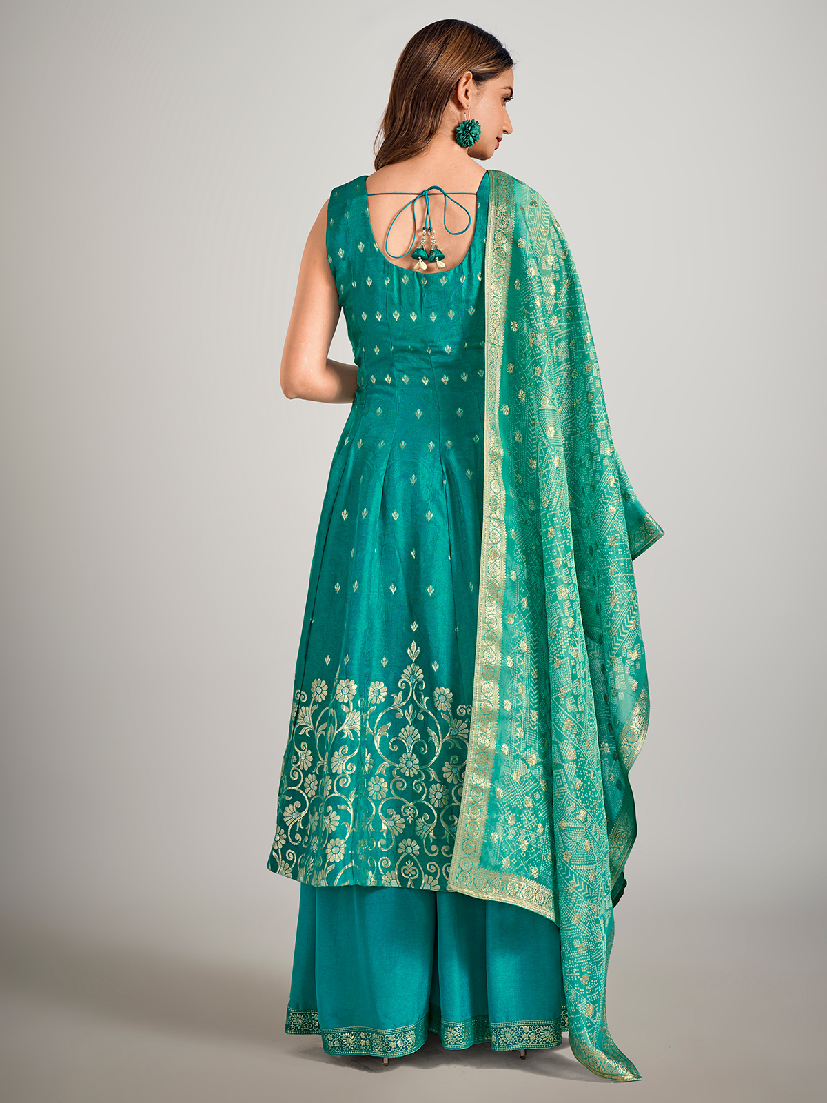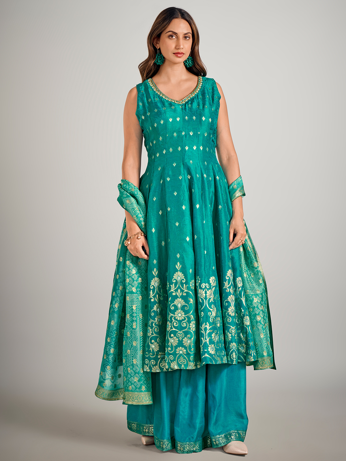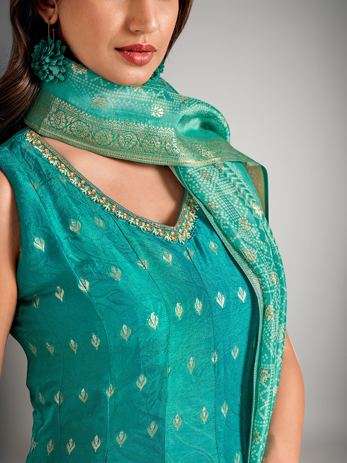 This gorgeous cutdana, sequins, beads, pearls, zardosi, and zari work decorate this peacock green silk palazzo suit, which is ideal for wedding celebrations. Its sleeveless style and U neck give it a cute and modern vibe. comes with a dupatta.