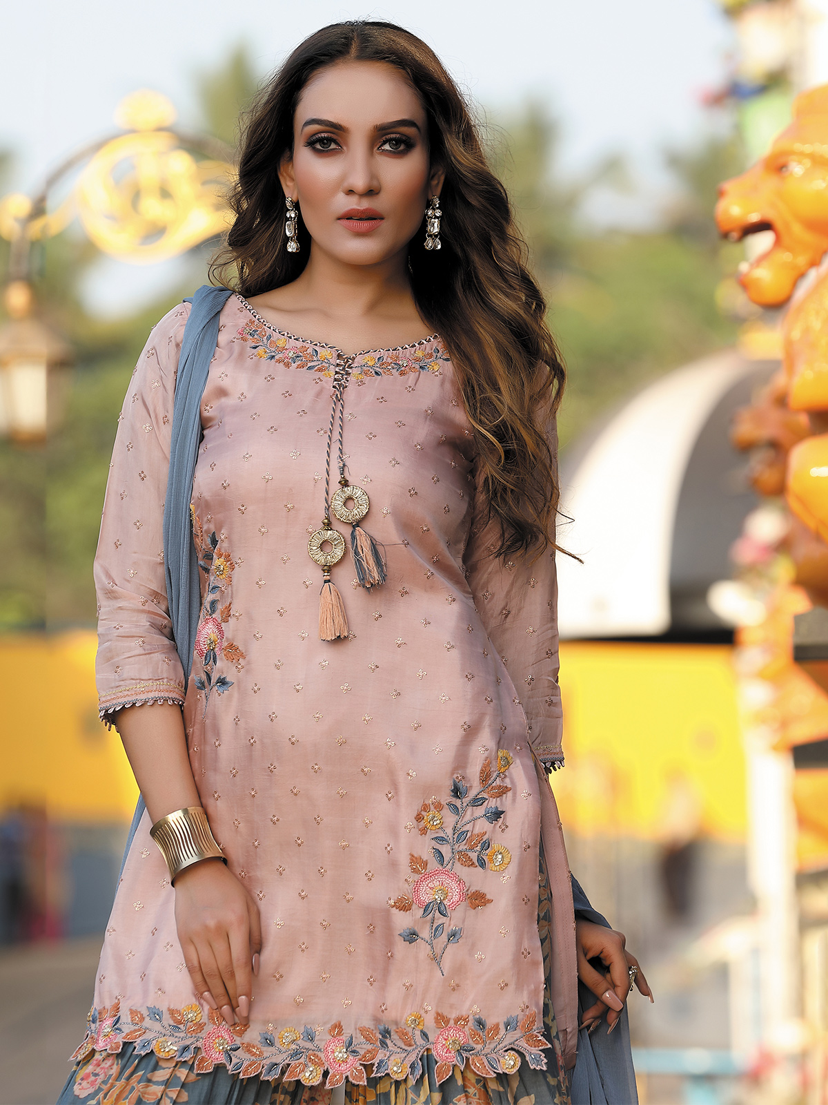 Blending timeless elegance with a touch of vintage appeal, this pink and grey silk sharara suit is beautifully enhanced with delicate embroidery and shimmering sequin work. Designed with a round neckline and quarter sleeves, it is paired with a matching dupatta, making it perfect for festive and special occasions.