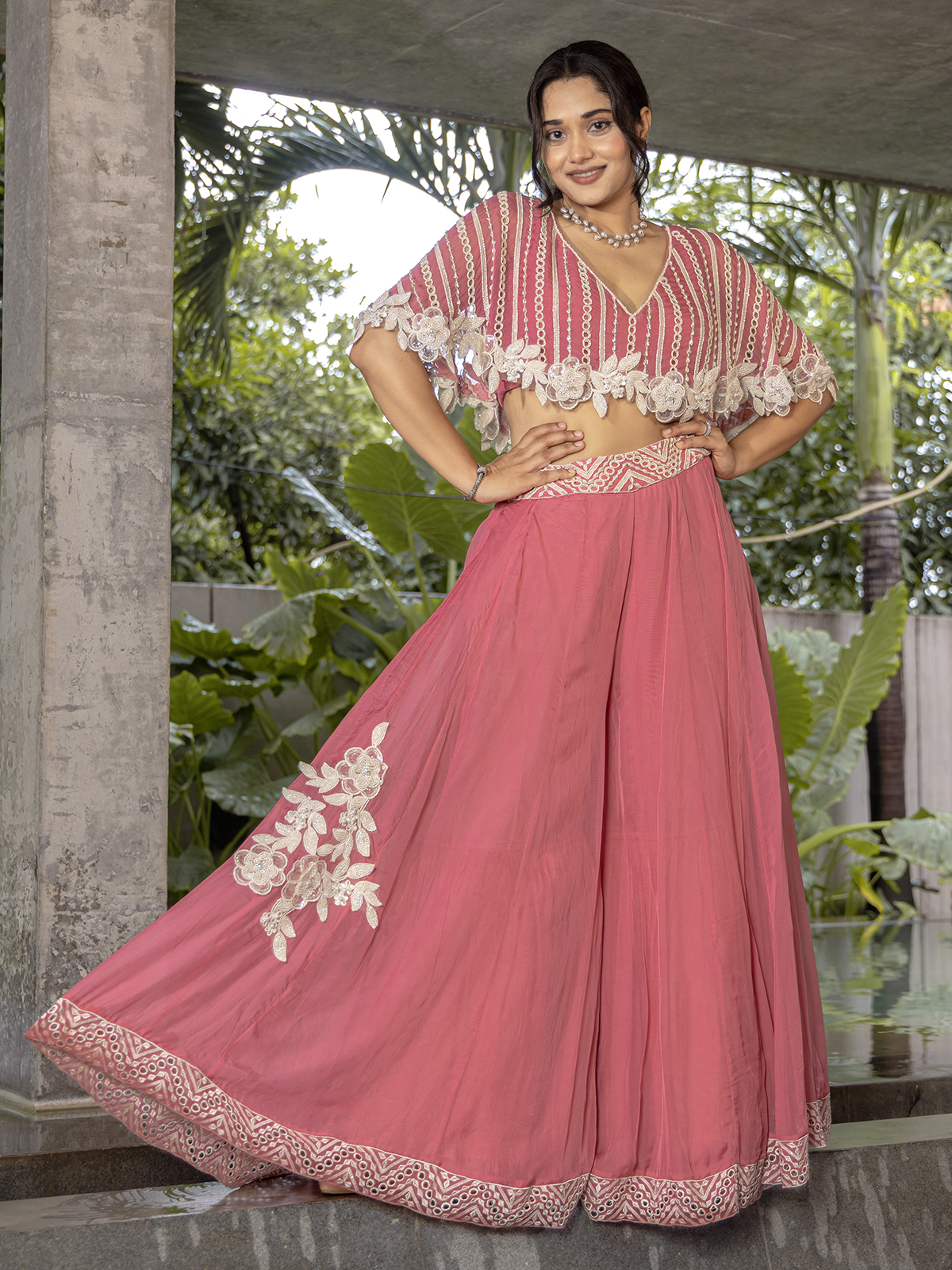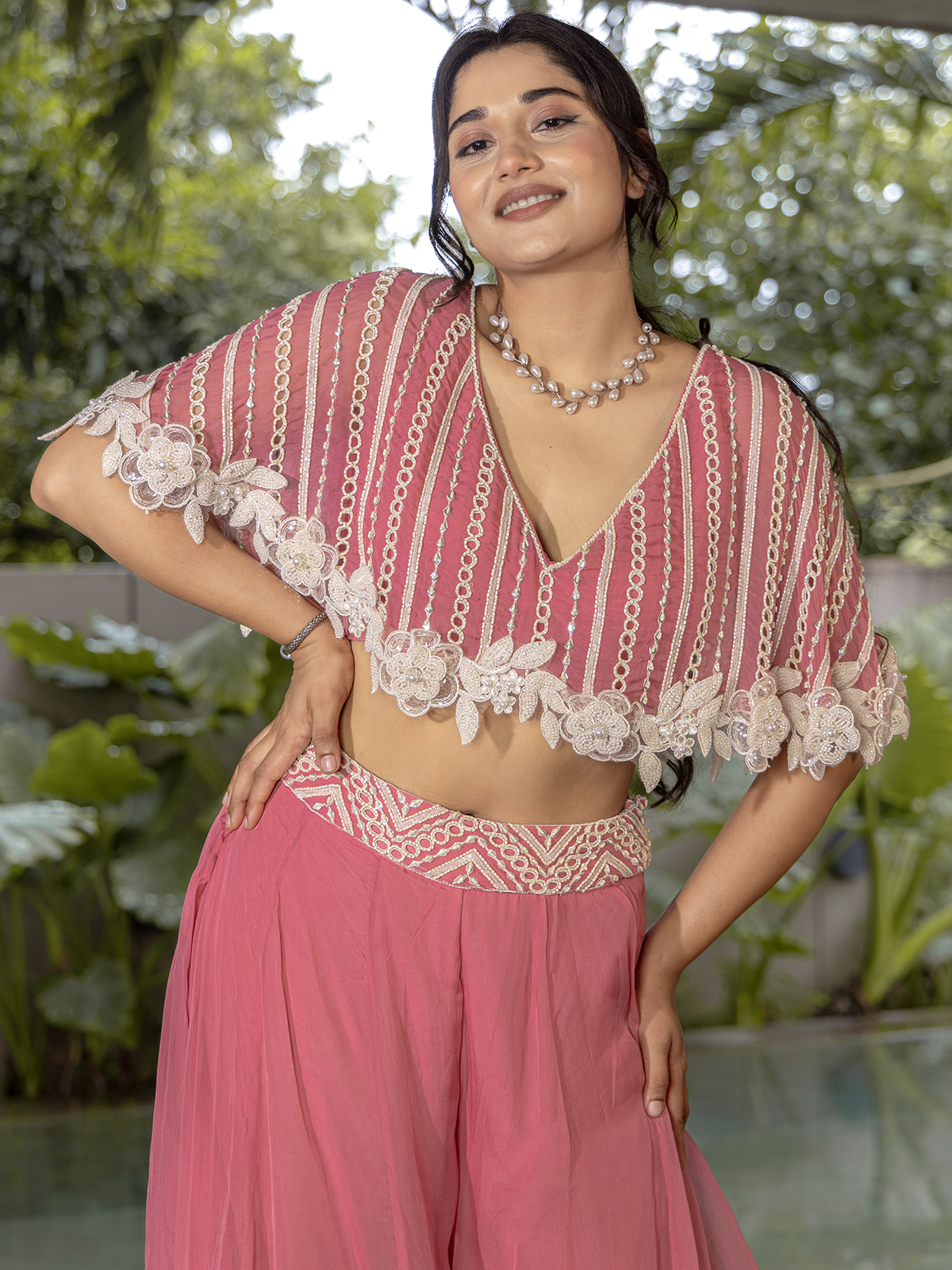 Gorgeous in every detail, the pink palazzo suit is tailored from soft crepe silk and adorned with intricate cutdana, resham, beads, and cutwork embellishments. The V neckline top paired with flowy palazzos strikes the perfect blend of tradition and modern flair.