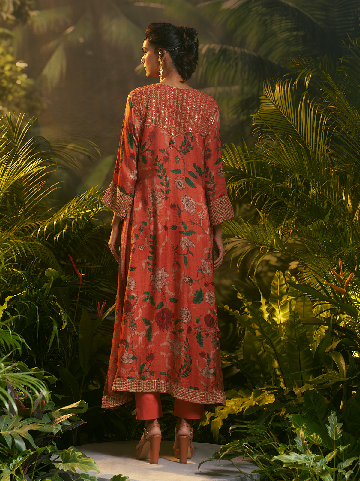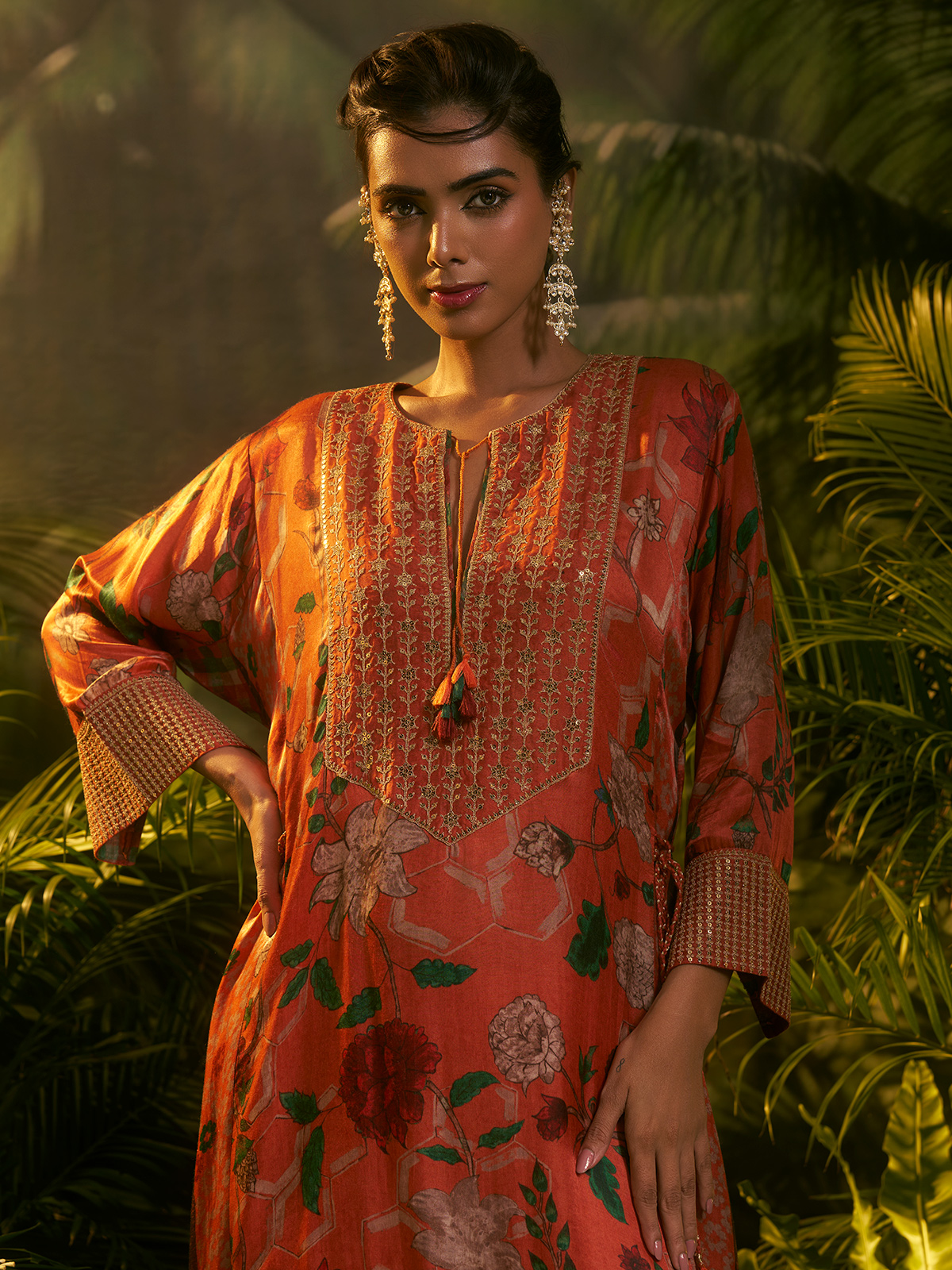 Soft elegance flows in this pink silk pant suit, radiant with festive charm. Resham and sequins highlight its printed fabric, adding delicate brilliance. A keyhole neckline with quarter sleeves completes its refined look, making it a graceful attire for joyous occasions and gatherings.