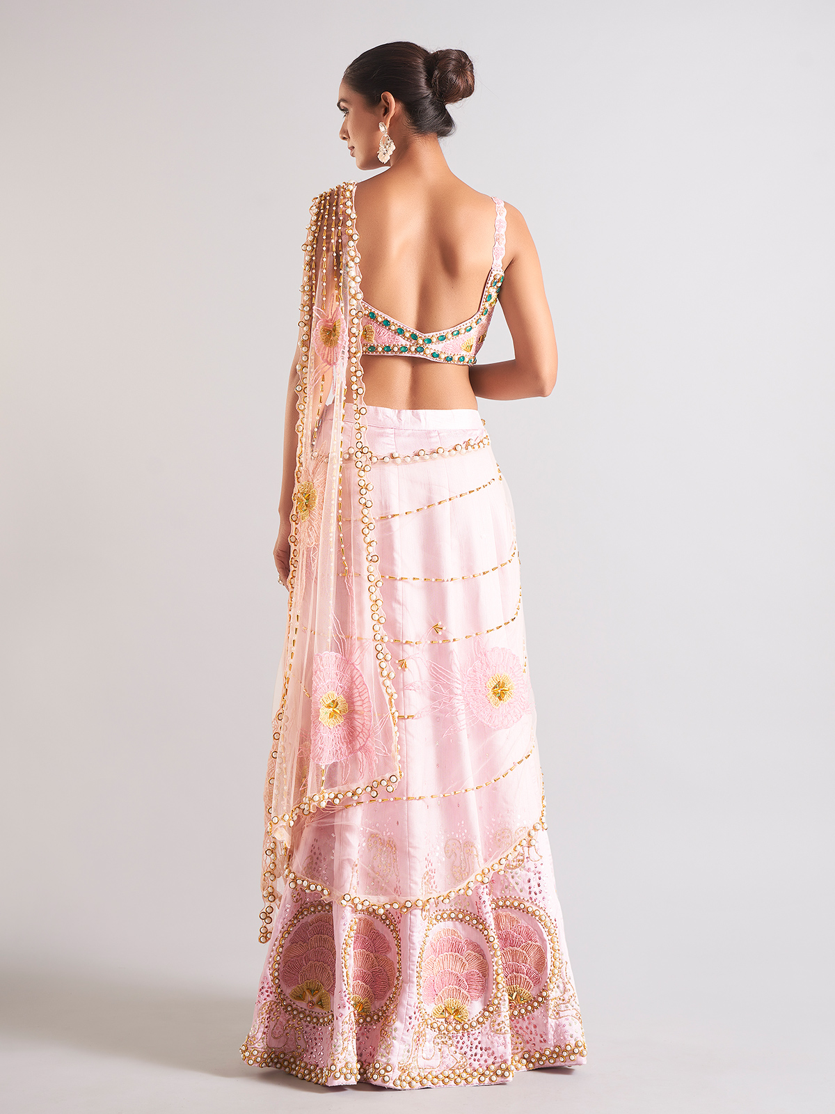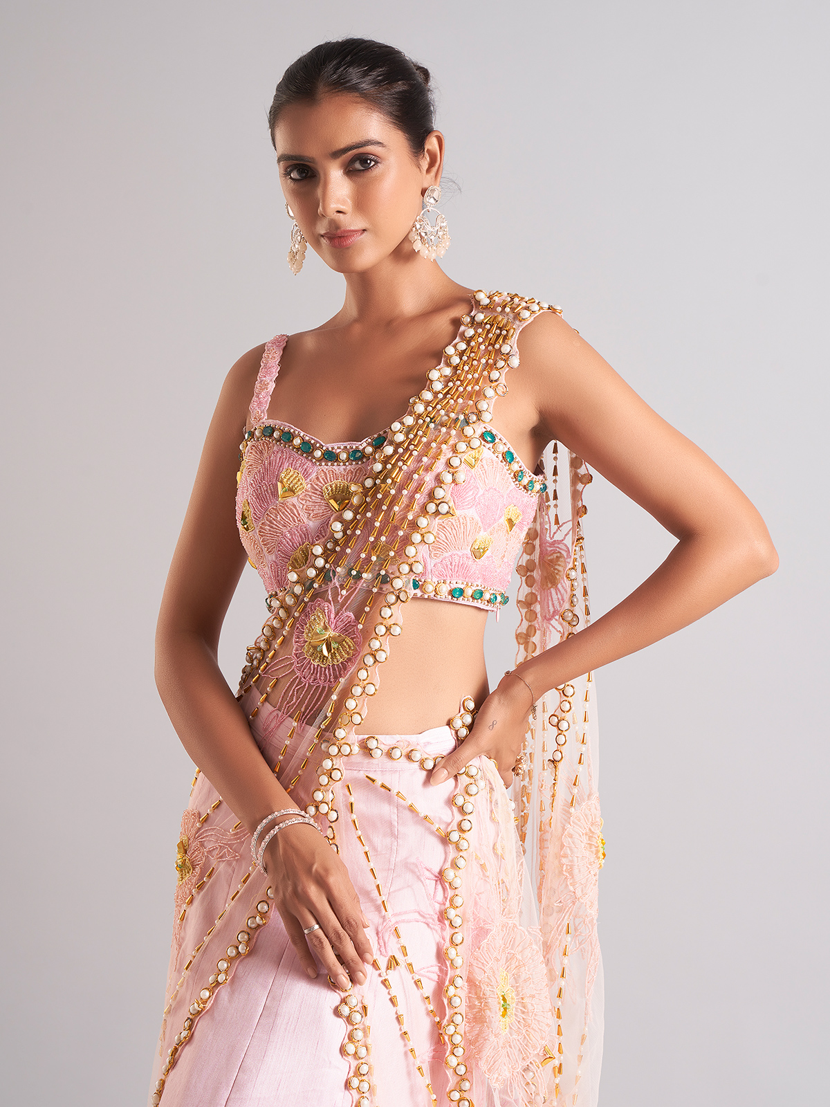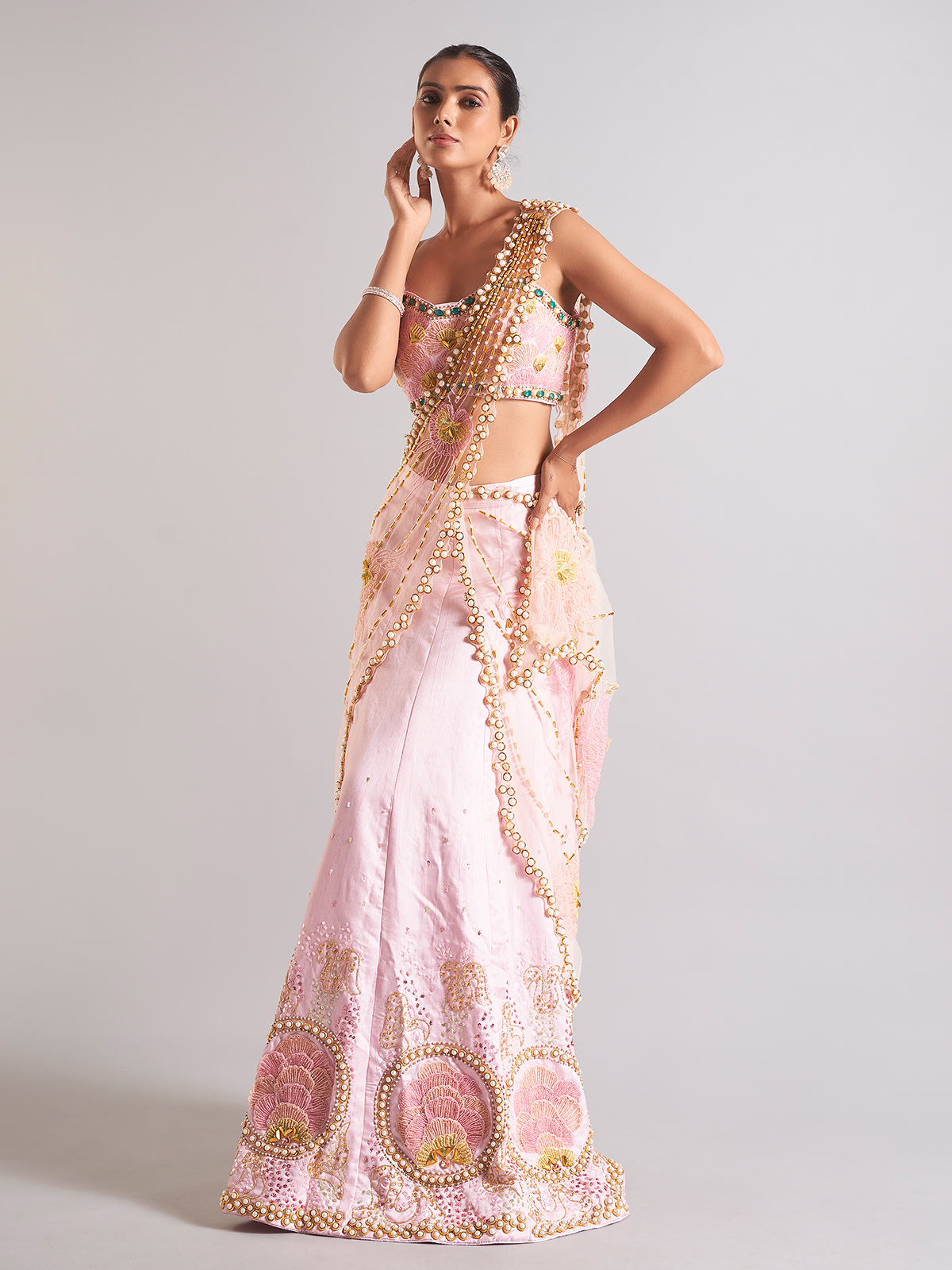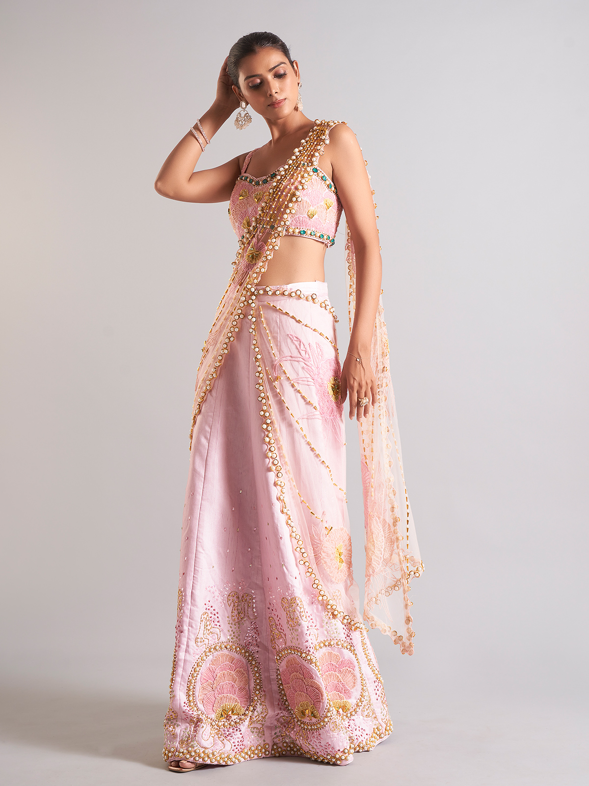 Our gorgeous pink raw silk palazzo suit, adorned with exquisite cutdana, sequins, beads, and pearl work, is sure to turn heads. This sophisticated item, which comes with a ready-made blouse for your convenience, is ideal for weddings.