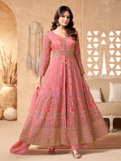 Crafted in pink silk, this anarkali carries delicate embroidery and sequins work. A sweetheart neckline and quarter sleeves elevate the look. Paired with a dupatta and palazzo, it suits weddings, festive gatherings and sangeet nights.