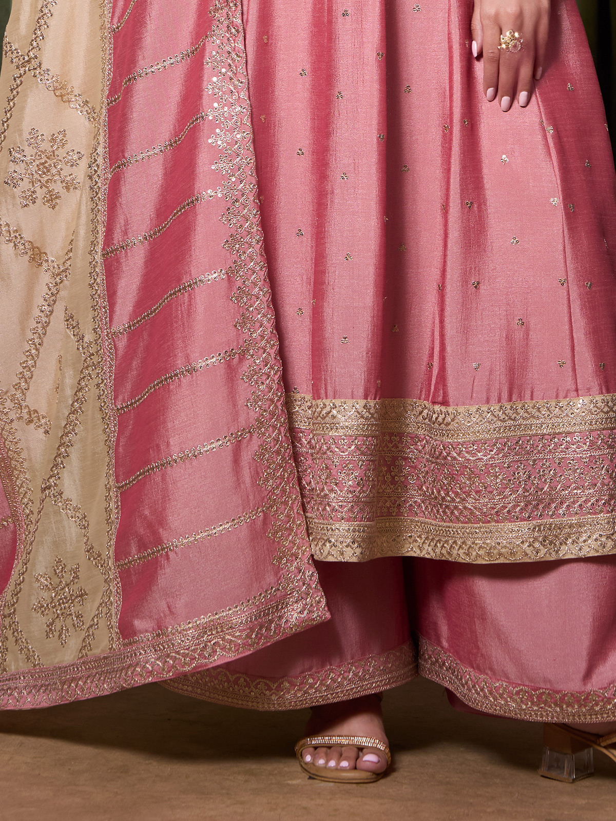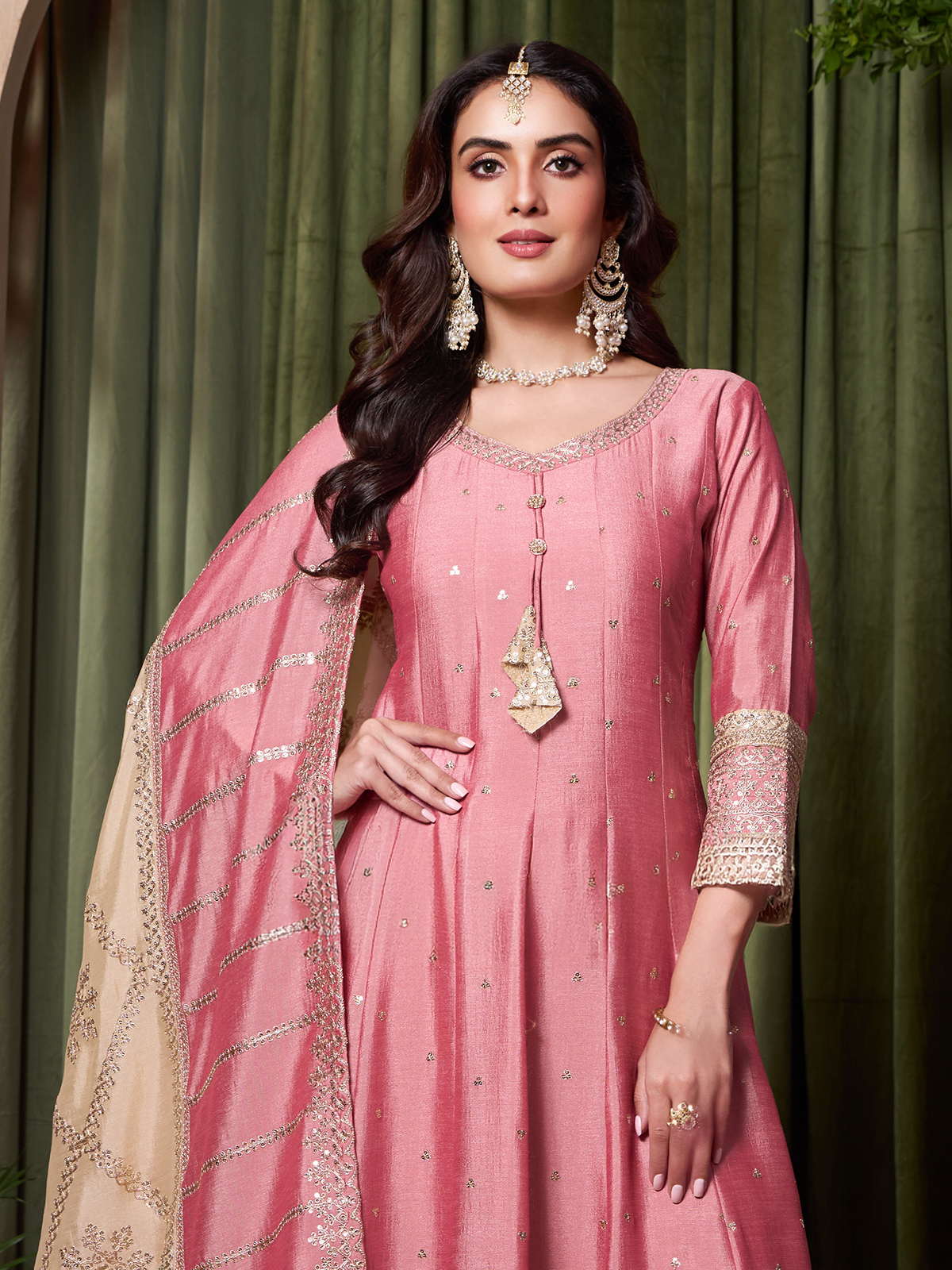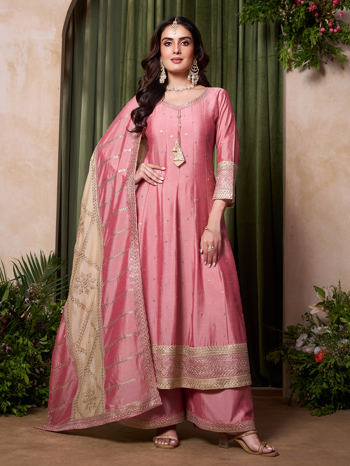 This pink silk anarkali suit. Showcases delicate embroidery and sequins for feminine charm. Styled with a sweetheart neckline and quarter sleeves, it is paired with palazzos and a dupatta, creating a graceful silhouette for weddings, sangeet and celebratory occasions.