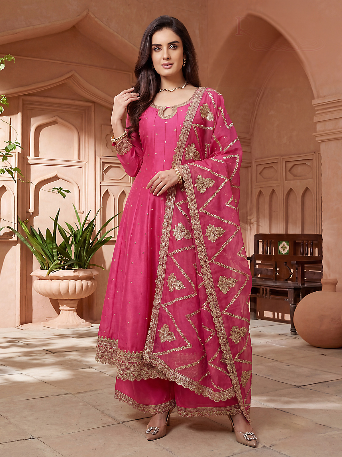 This pink silk pakistani style anarkali is beautifully embellished with resham and sequins work. Designed with a keyhole neckline and quarter sleeves, it is paired with palazzos and a dupatta, making it perfect for weddings, sangeet and festive occasions.