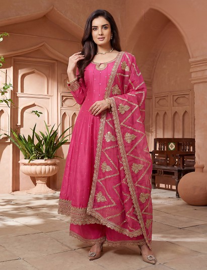 Pink Silk Pakistani Style Anarkali Palazzo Suit For Women