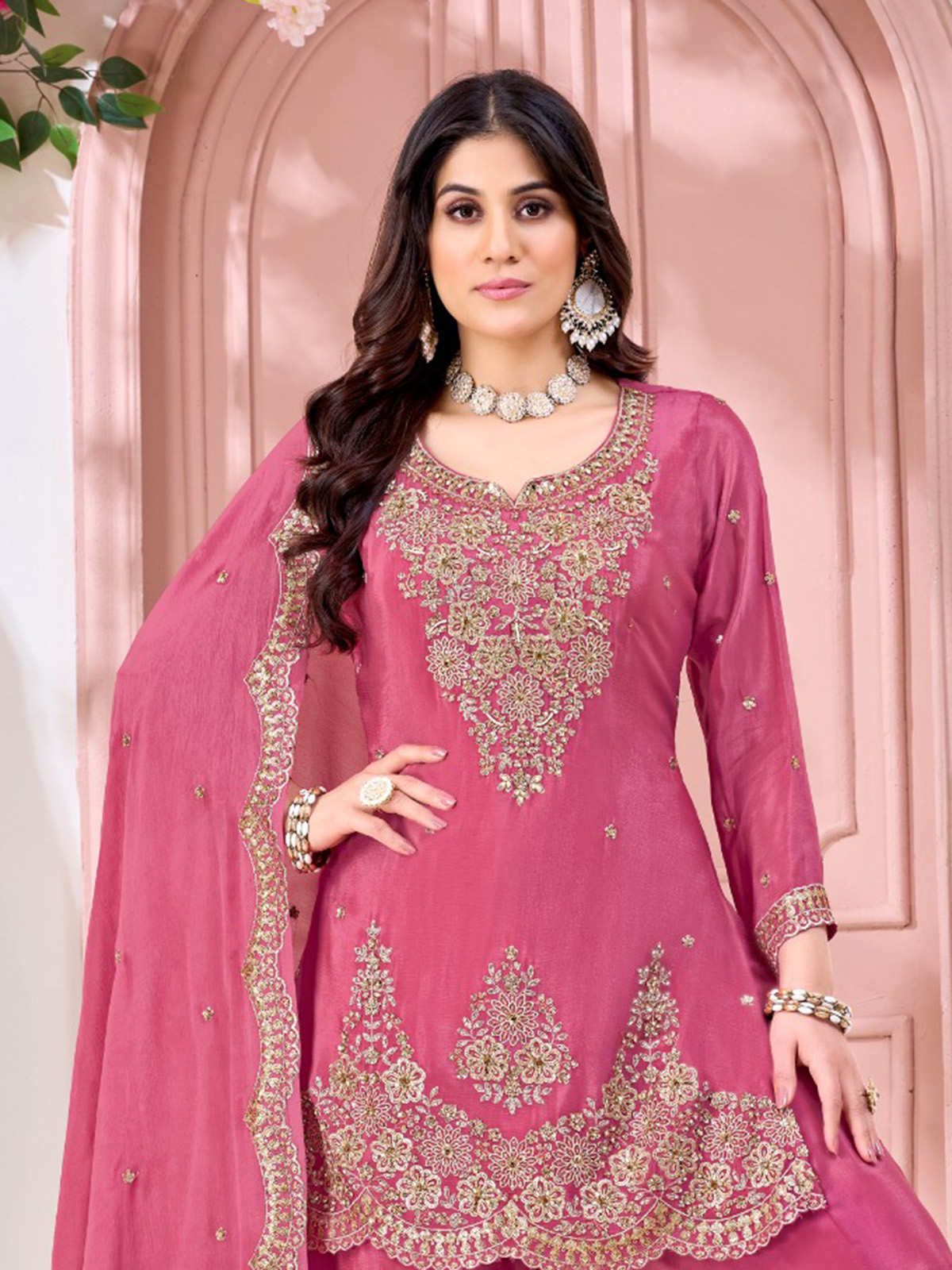 Soft pink hues bring graceful beauty to this silk pakistani style palazzo suit designed for festive occasions. The kurti features a flattering sweetheart neckline with quarter sleeves. Decorated with resham, sequins, beads and stone embellishments that add gentle sparkle. Styled with flowing palazzo bottoms and a dupatta, the ensemble forms an elegant ethnic silhouette perfect for weddings and receptions.