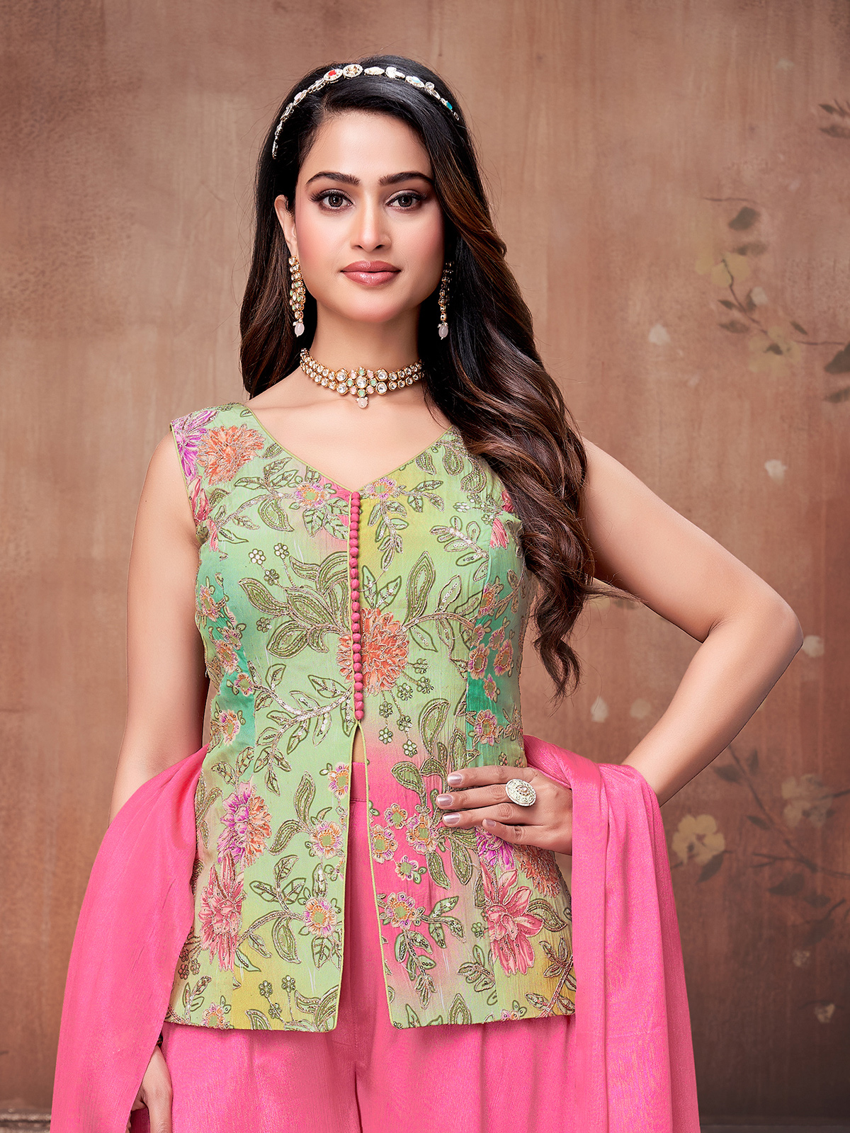 Reflecting your playful elegance, this pink printed silk palazzo suit exudes freshness and modern charm. Designed with a stylish V-neck and sleeveless cut, it is enhanced with delicate resham and sequins detailing for festive appeal. Ideal for festive gatherings, weddings and sangeet occasions, it is beautifully styled with a palazzo and dupatta.