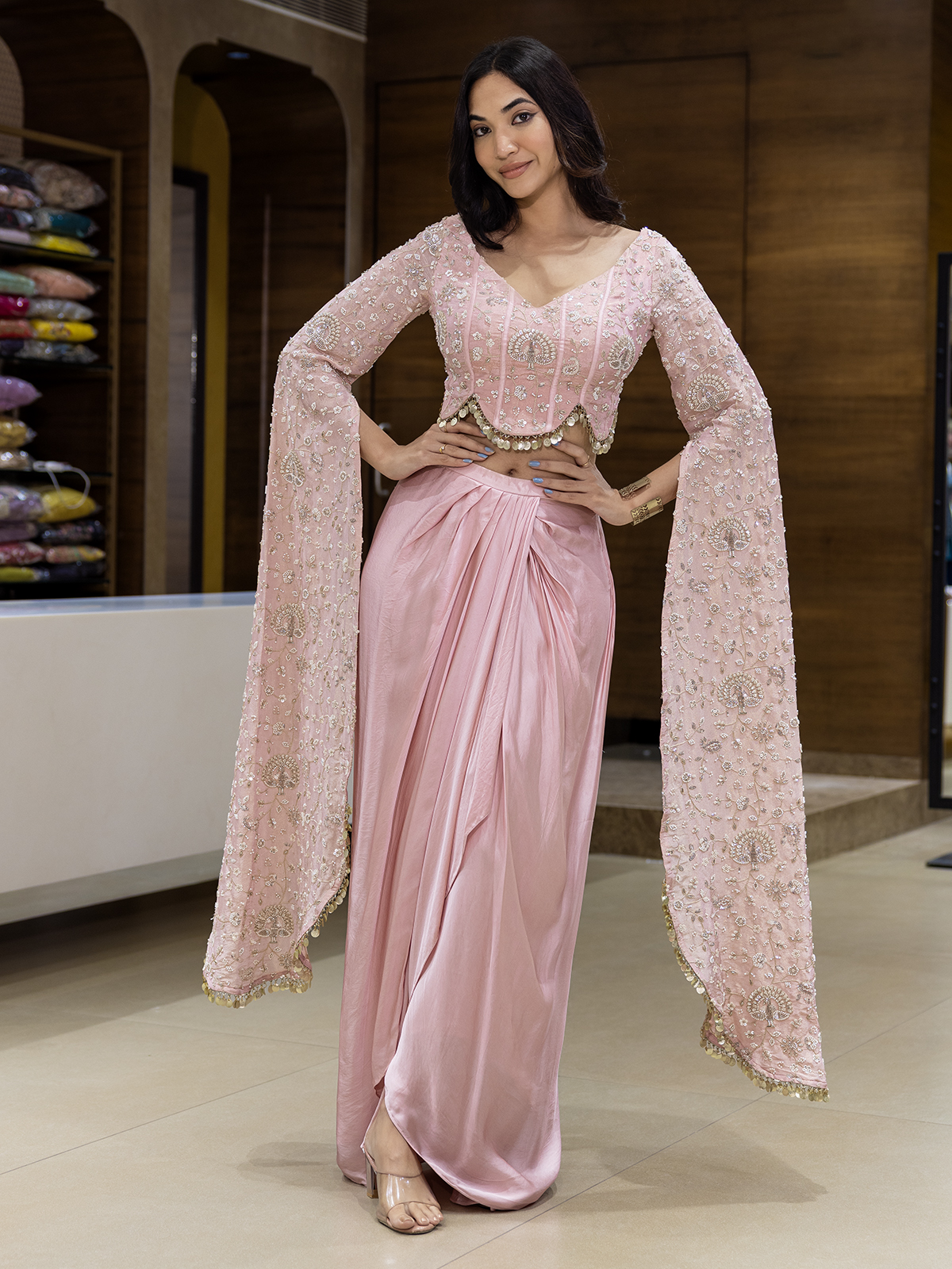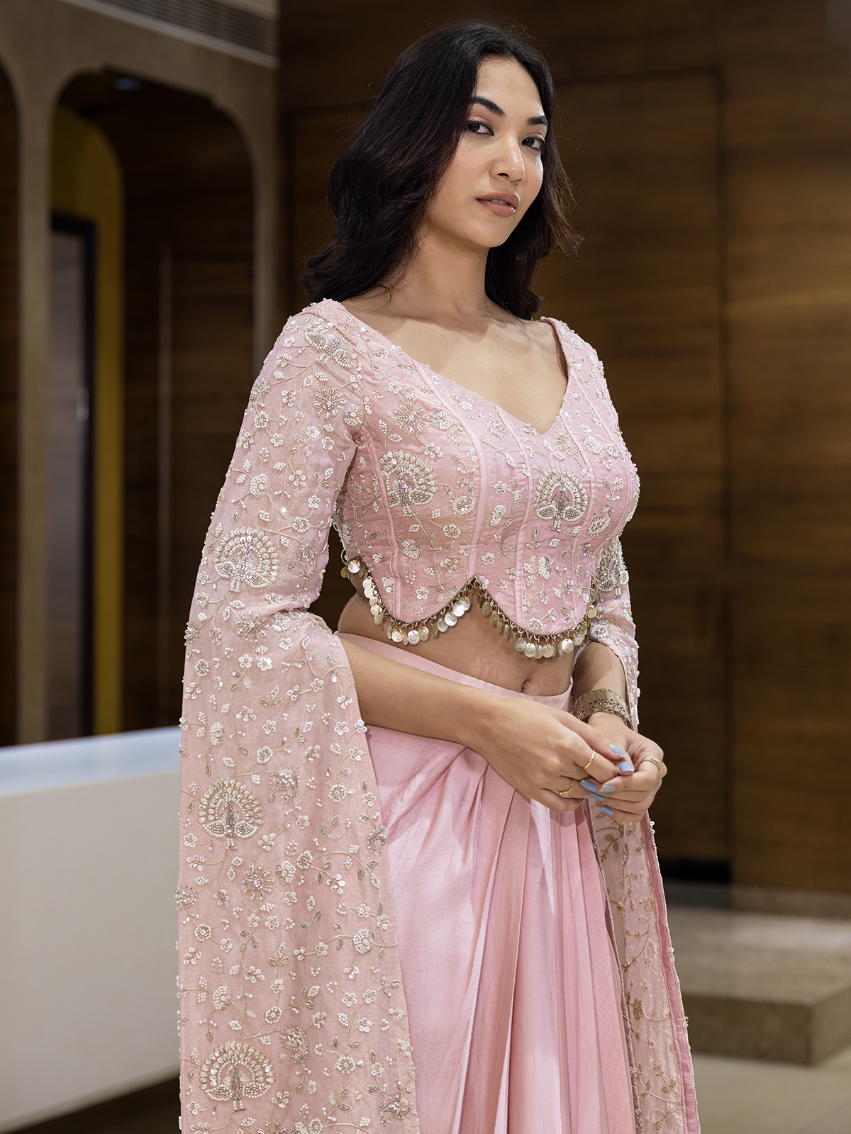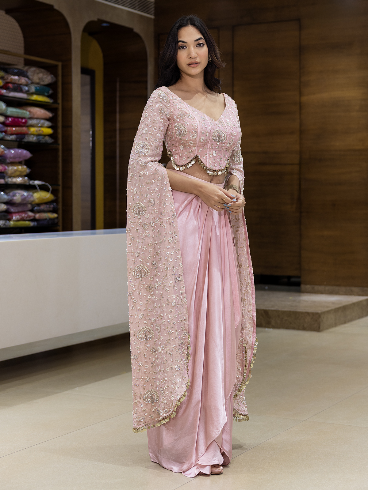 Draped in ethereal silk, this indowestern suit in soft pink beauty captures the joy of celebration. Resham, sequins, cutdana, coin, and bead accents gleam across its V-neckline, infusing every thread with festivity. The Indo-western design brings harmony of culture and charm, making your presence more elegant and stylish in party and wedding celebration.