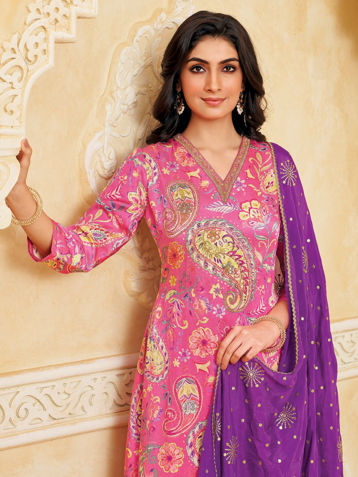 Celebrate in style with this pink silk salwar suit, where delicate thread and sequins glisten against charming printed patterns. A V-neckline and quarter sleeves add grace, while pants and a dupatta finish the ensemble. Designed to bring festive sparkle and refined elegance to special occasions.