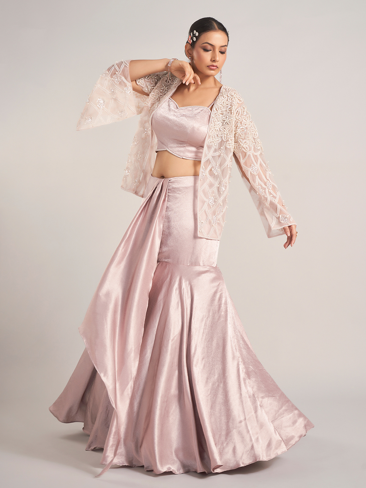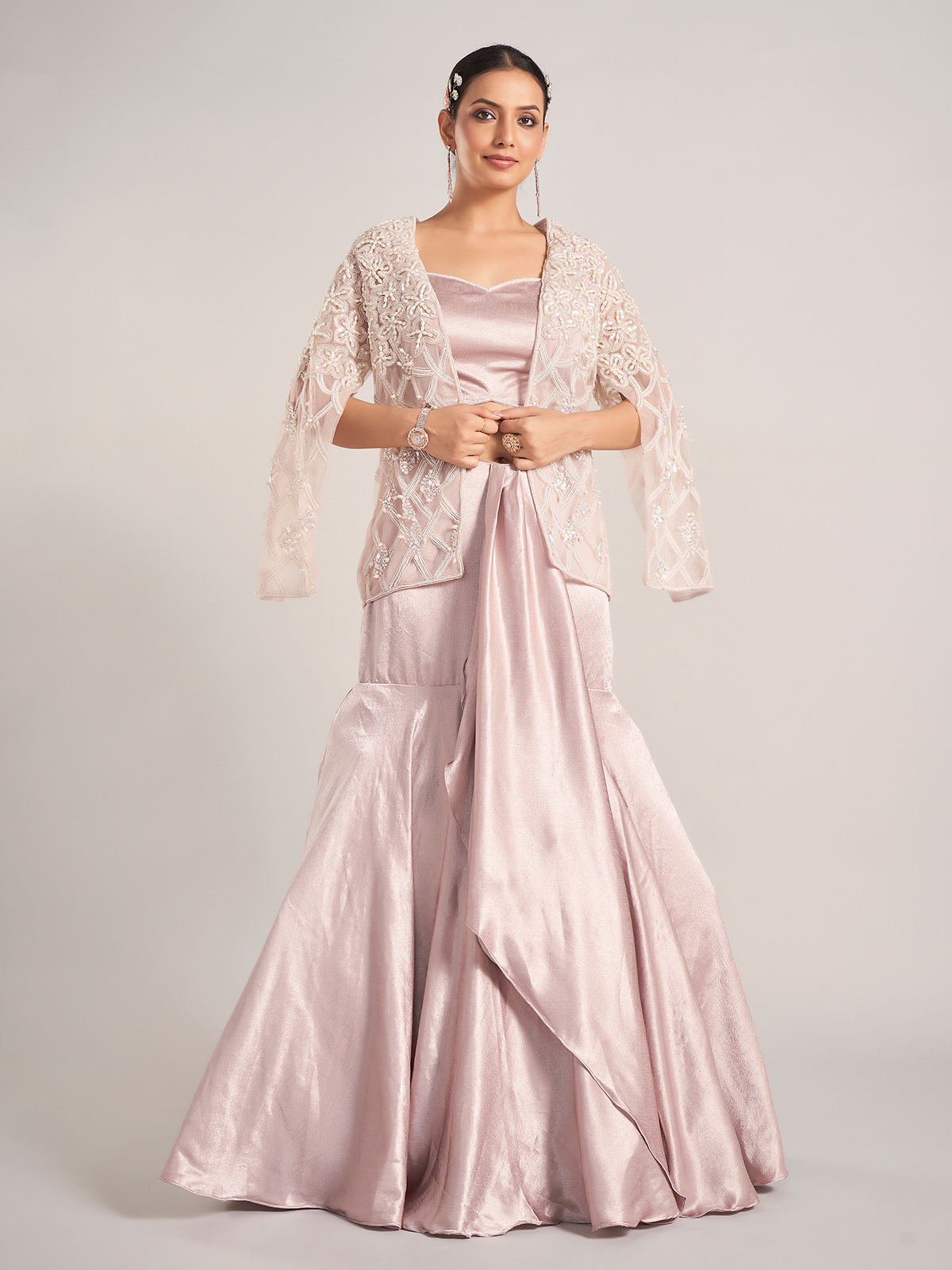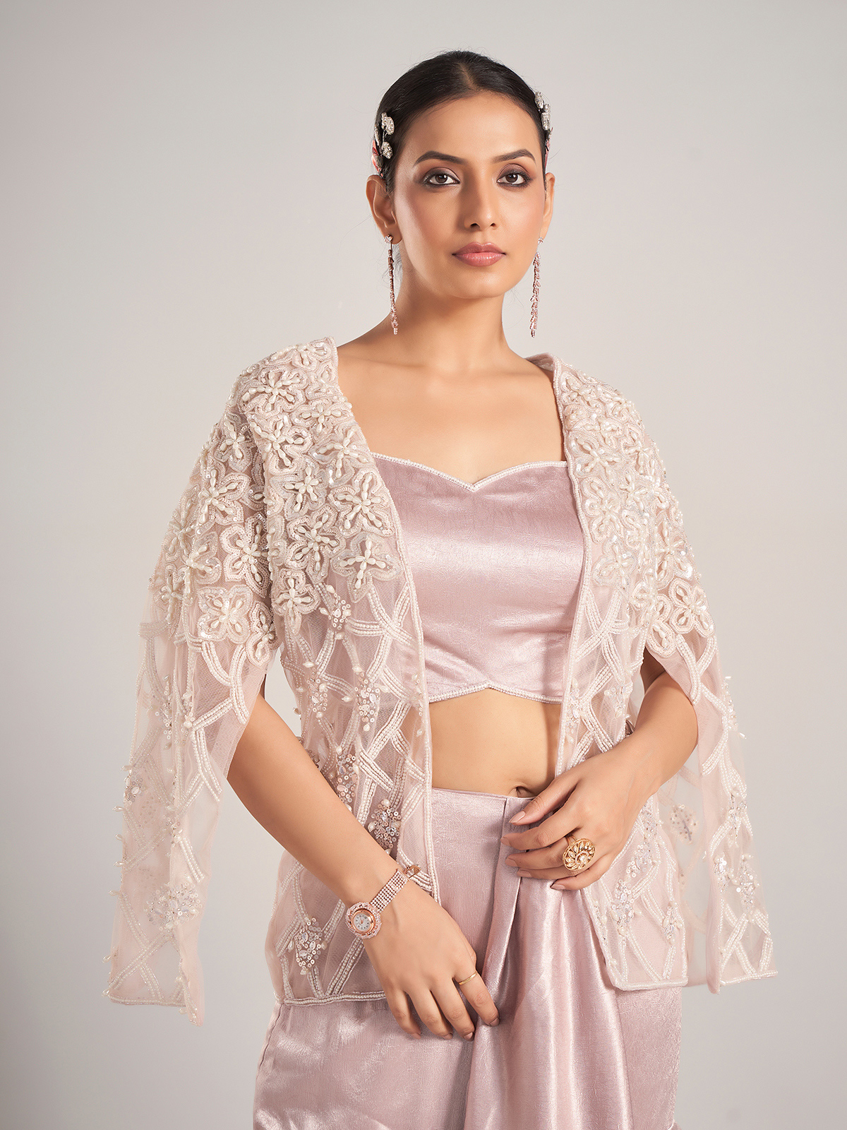 Embrace graceful allure with this pink tissue organza Indowestern, featuring a chic jacket adorned with intricate beads, sequins, and cutdana work. Perfect for weddings and receptions, it radiates festive elegance and contemporary charm, making it a stunning choice for memorable occasions.