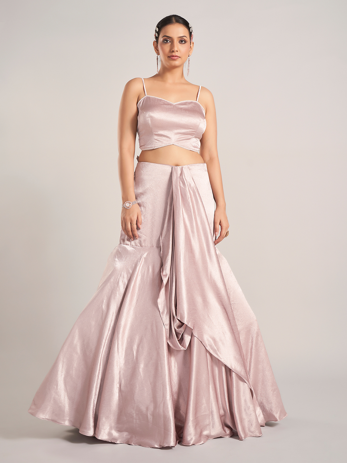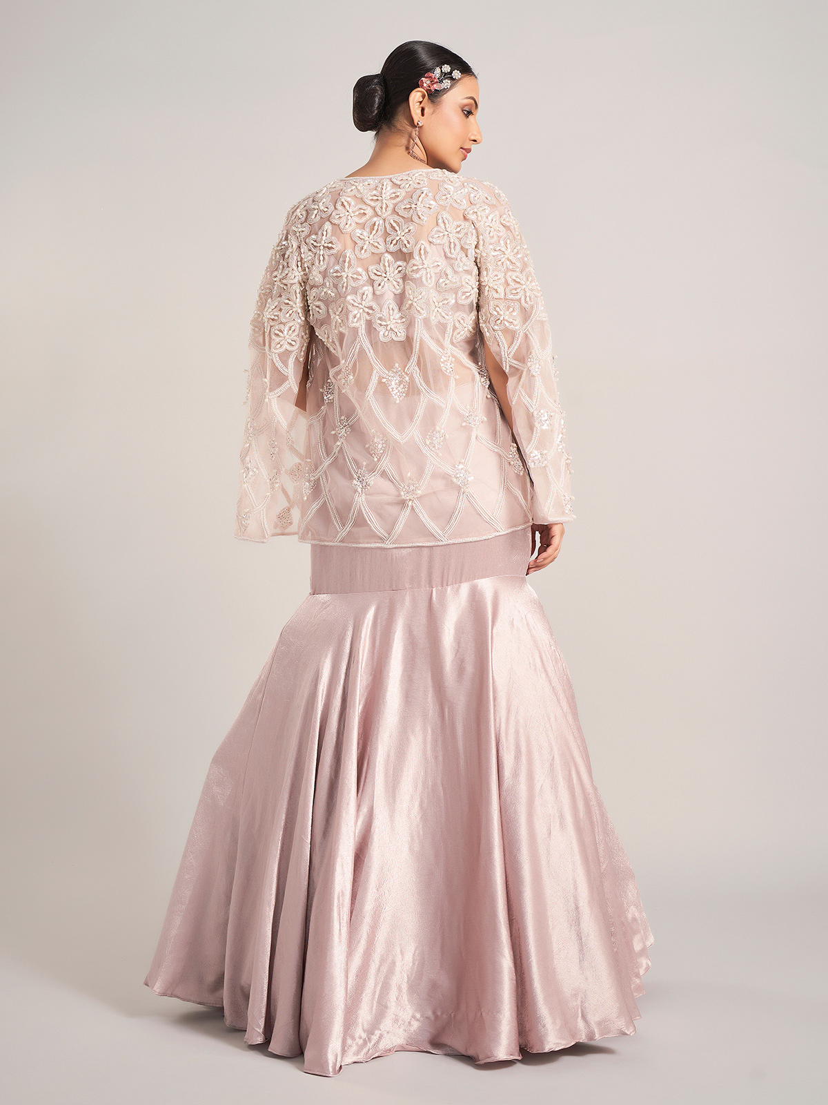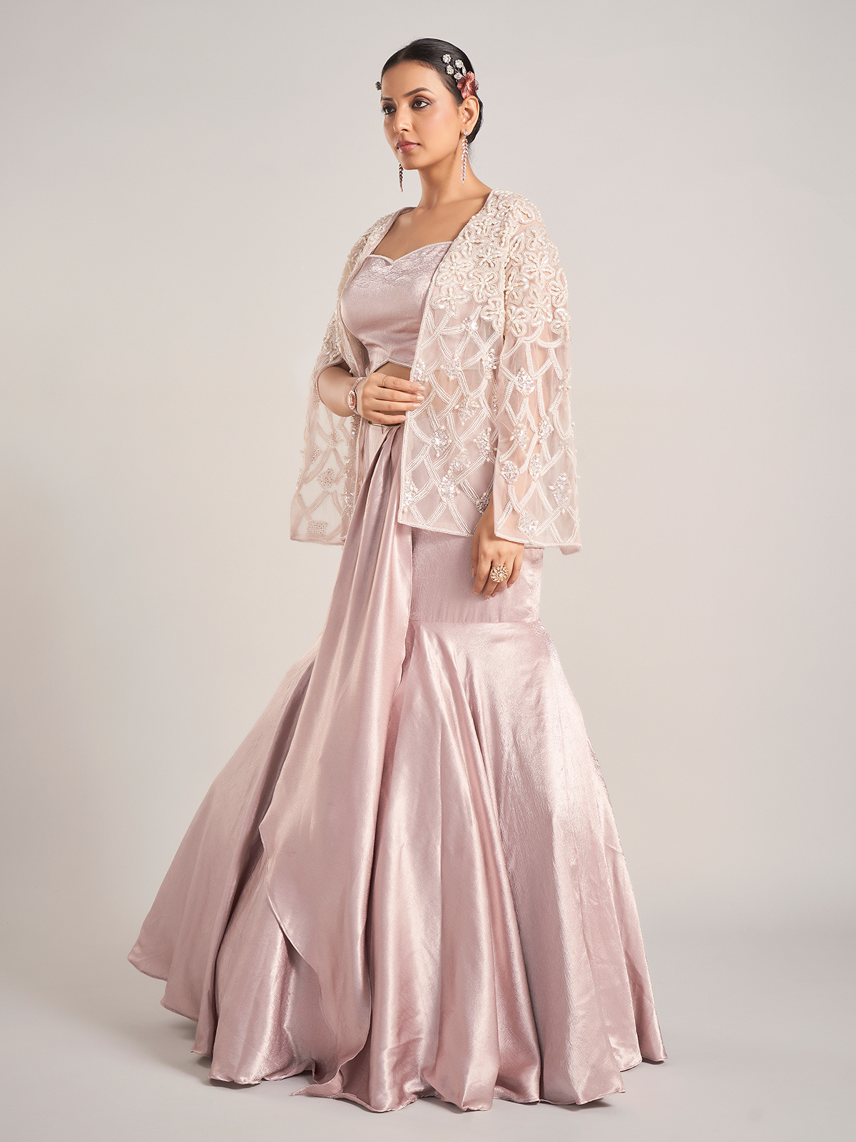Embrace graceful allure with this pink tissue organza Indowestern, featuring a chic jacket adorned with intricate beads, sequins, and cutdana work. Perfect for weddings and receptions, it radiates festive elegance and contemporary charm, making it a stunning choice for memorable occasions.