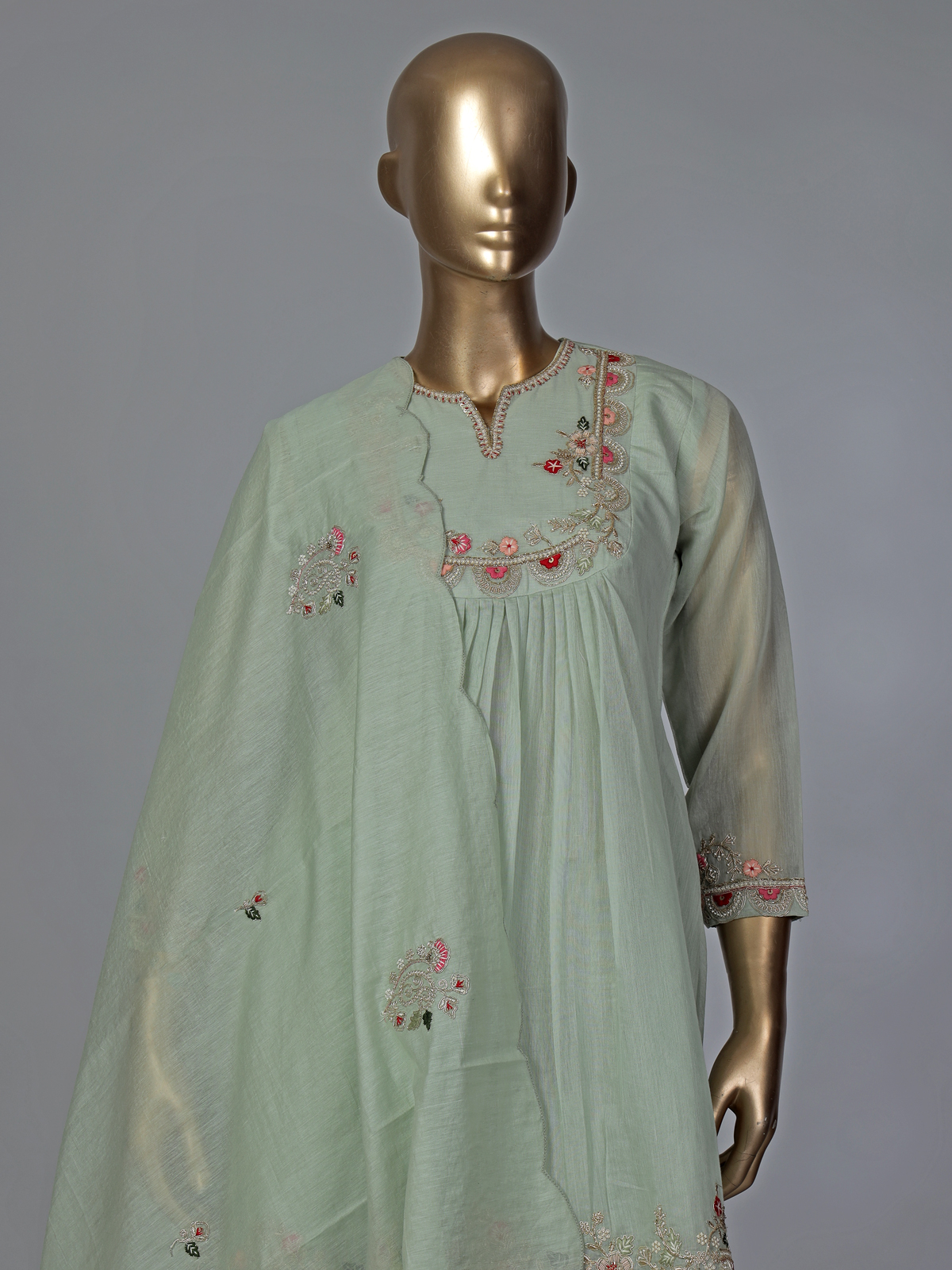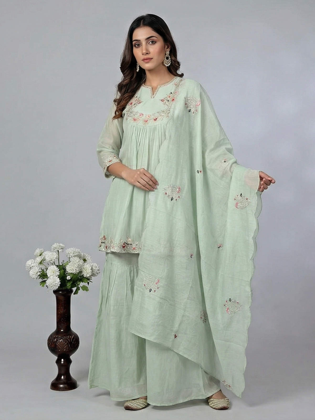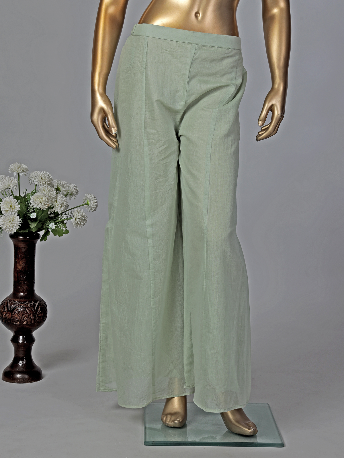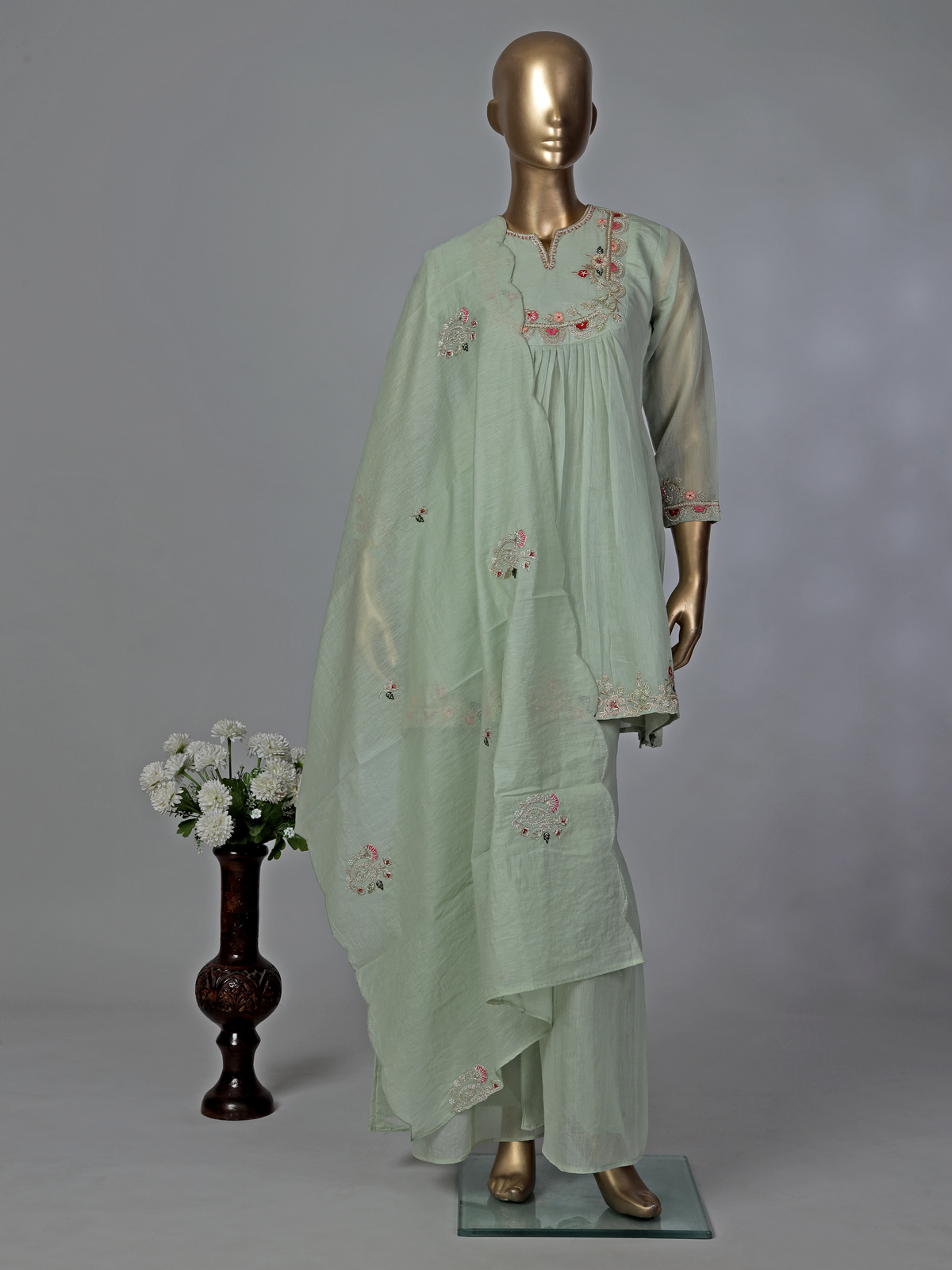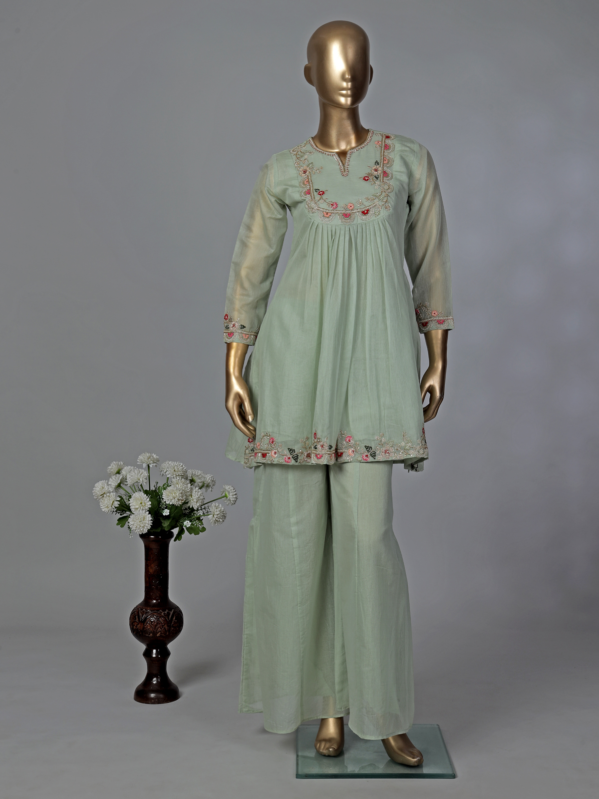 Highlight your graceful silhouette and look picture-perfect in this refreshing pista cotton palazzo suit. It offers a classic round neck and quarter sleeves, enriched with brilliant thread, cutdana, sequins, zardosi, and beads work. Tailor-made for festivals, weddings, and eid, the ensemble includes comfortable palazzos and a lovely dupatta.