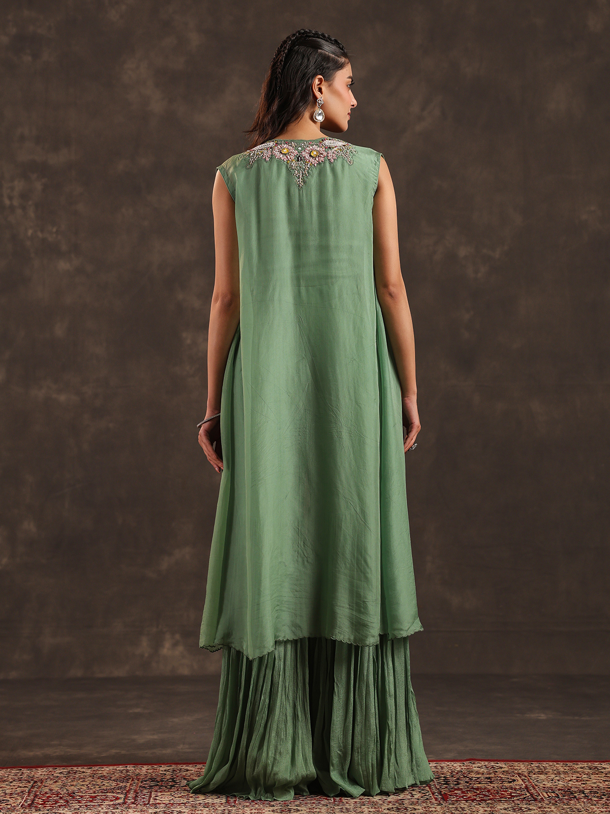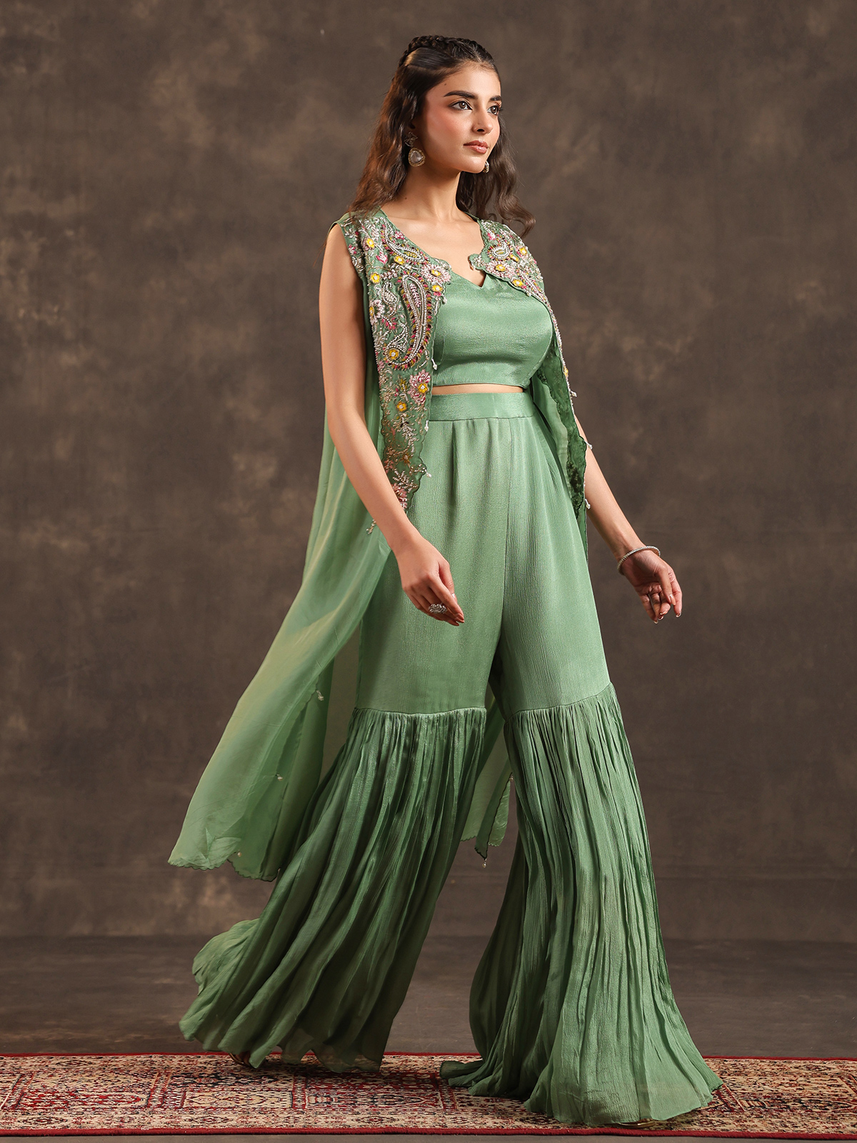 Pista Green Chinon Jacket Style Sharara Suit For Weddings
