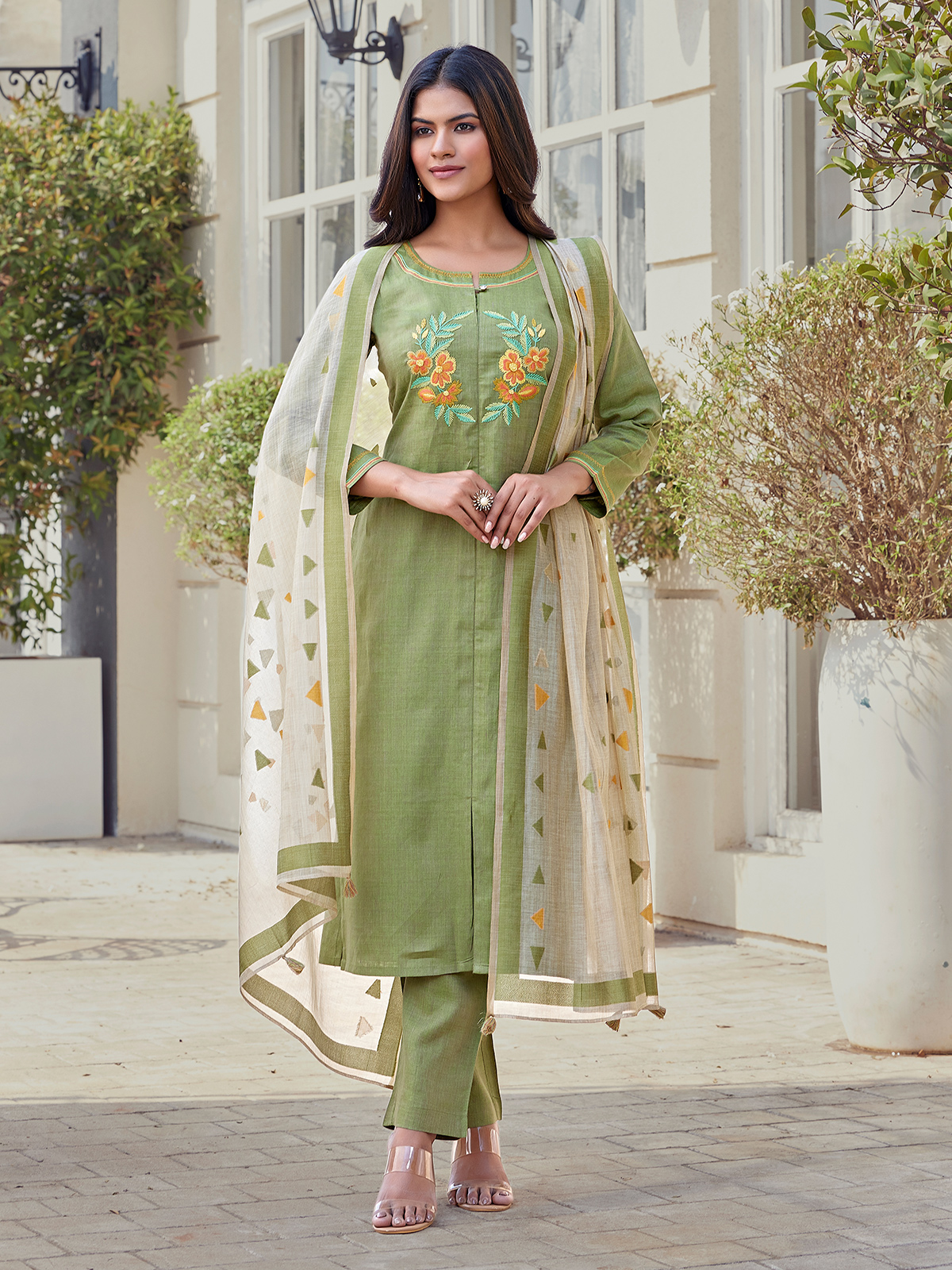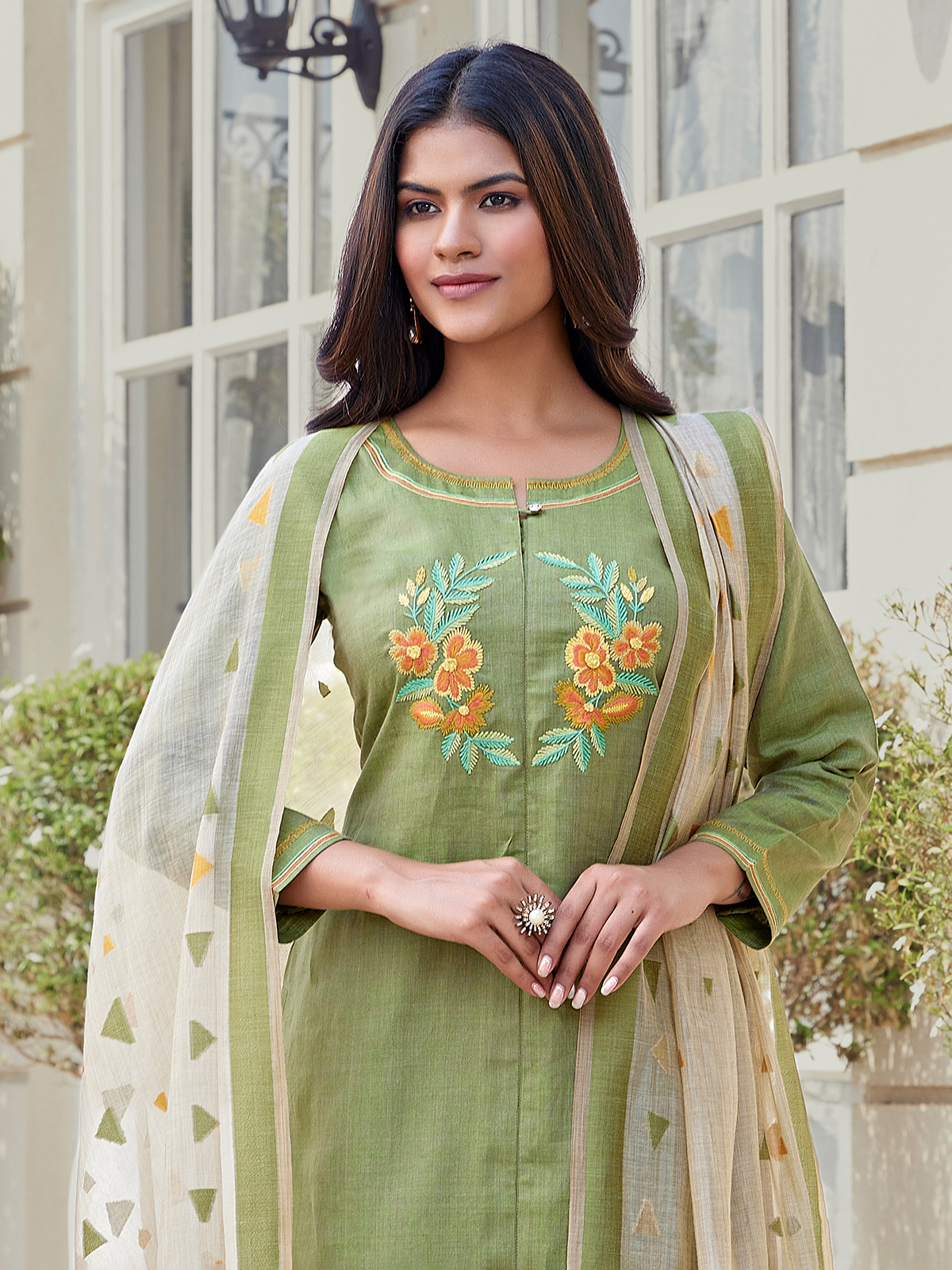 Refresh your festive wardrobe with this pista green cotton silk salwar suit, enhanced with fine thread work. Designed with a round neckline and quarter sleeves, it pairs with pant and dupatta for balanced elegance. A perfect blend of comfort and style, it is an ideal choice for celebrations and family occasions.