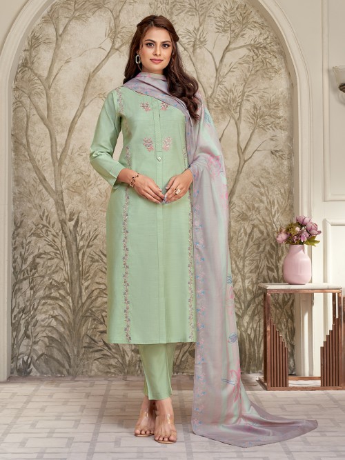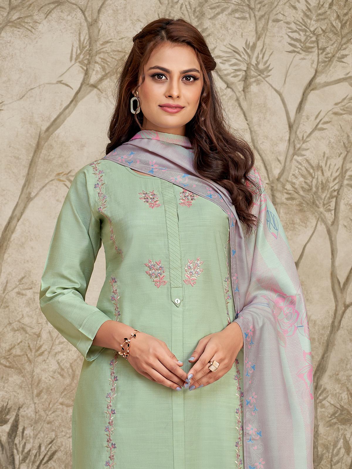 This pista green cotton silk suit exudes calm elegance, graced with embroidery blooming like artistic patterns on the surface. Crafted with a round neckline and quarter sleeves, it is accompanied by pant and a printed dupatta, shaping a serene festive look filled with gentle charm.