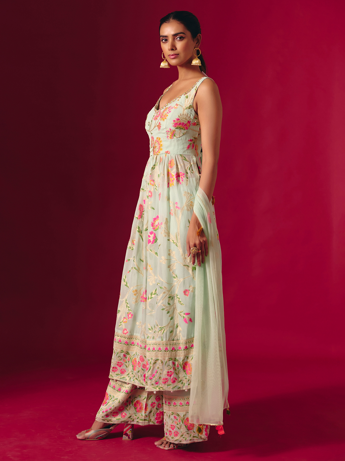 Delicate yet divine, this pista green georgette Pakistani-style palazzo suit glows with cutdana, beads, zari and sequins. The sweetheart neckline and sleeveless design create a graceful charm perfect for weddings and sangeet evenings.