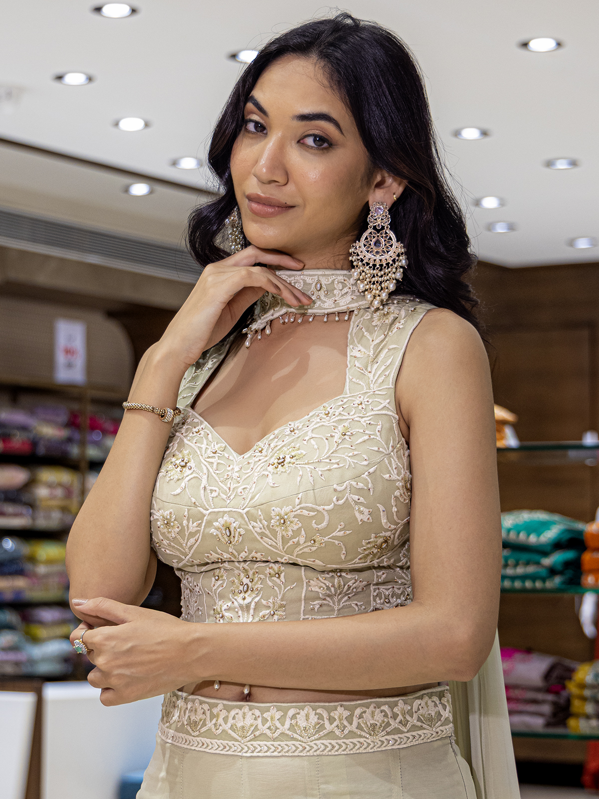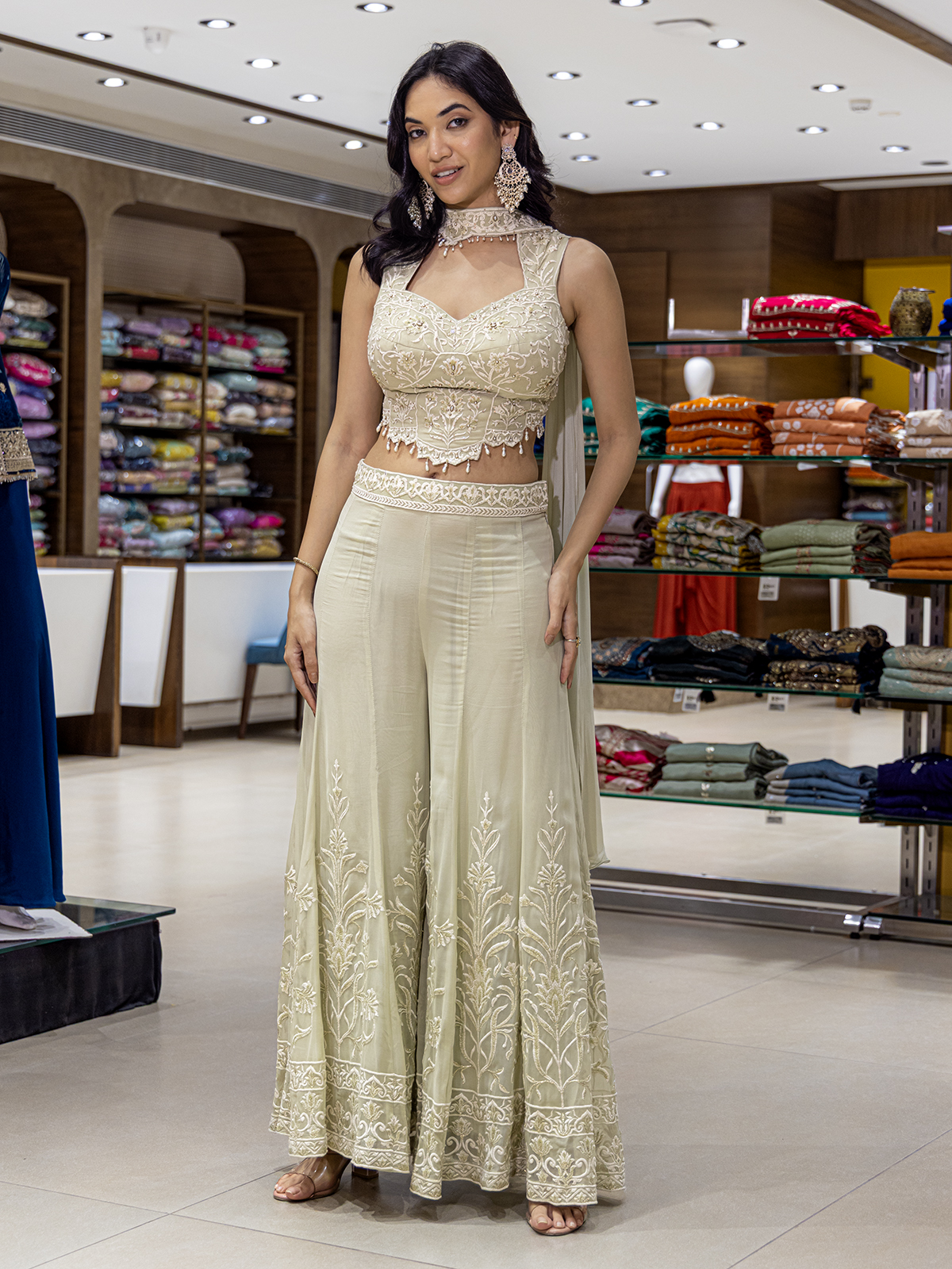 Delicate pista green georgette forms this palazzo suit, embellished with pearls, zardosi, resham, and stone work. Styled with a sweetheart neckline and sleeveless cut, it offers modern elegance with festive artistry. Ideal for weddings, its soft pastel shade pairs beautifully with intricate detailing for an ethereal ensemble.
