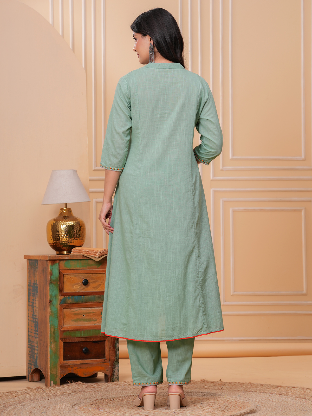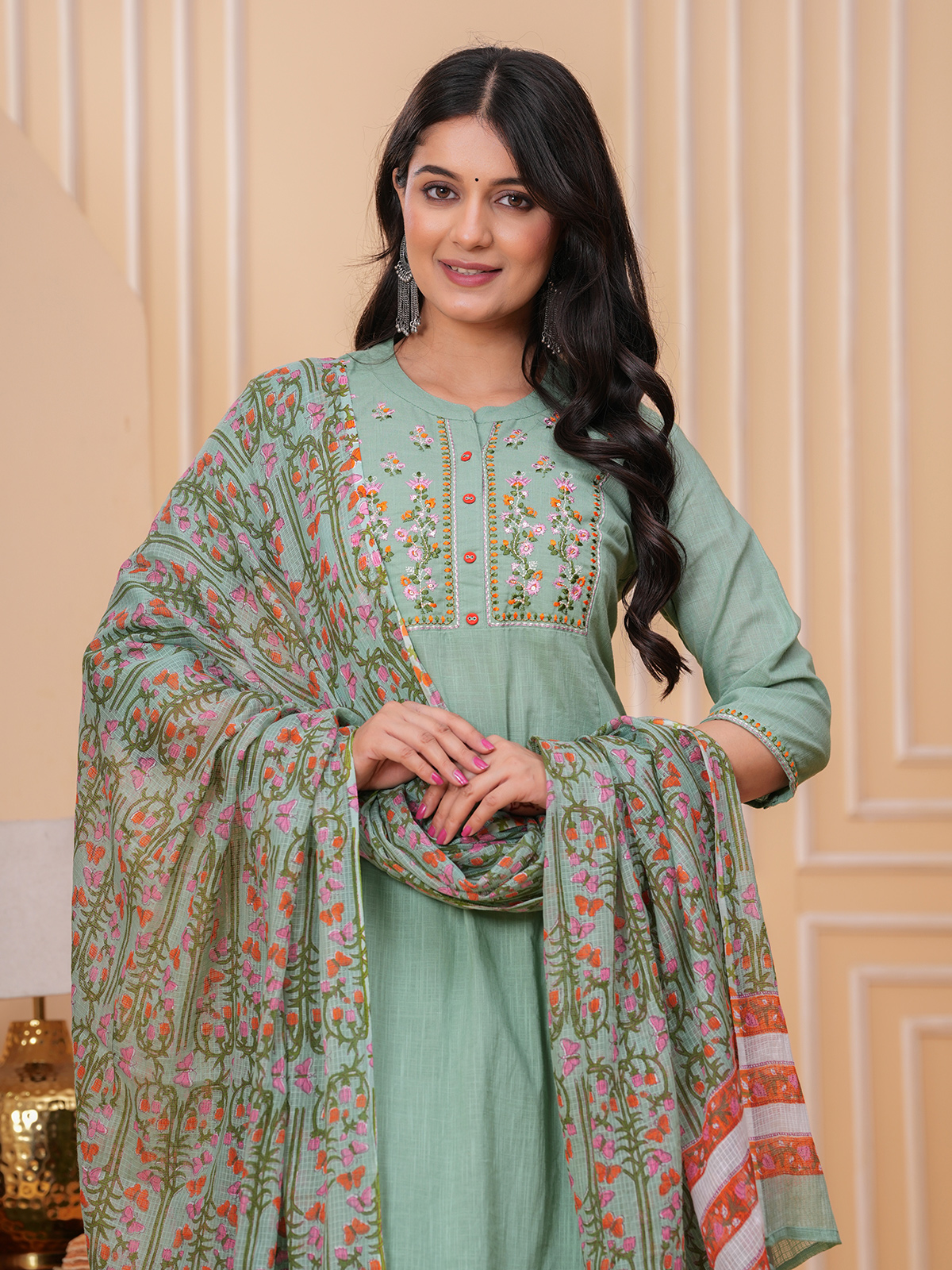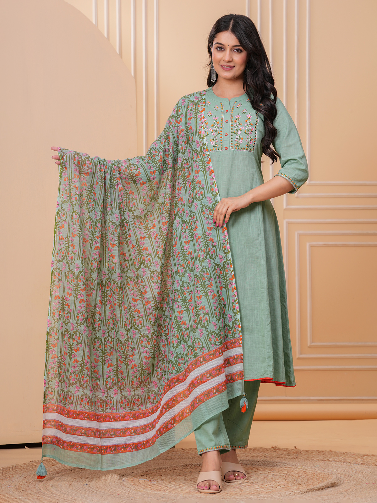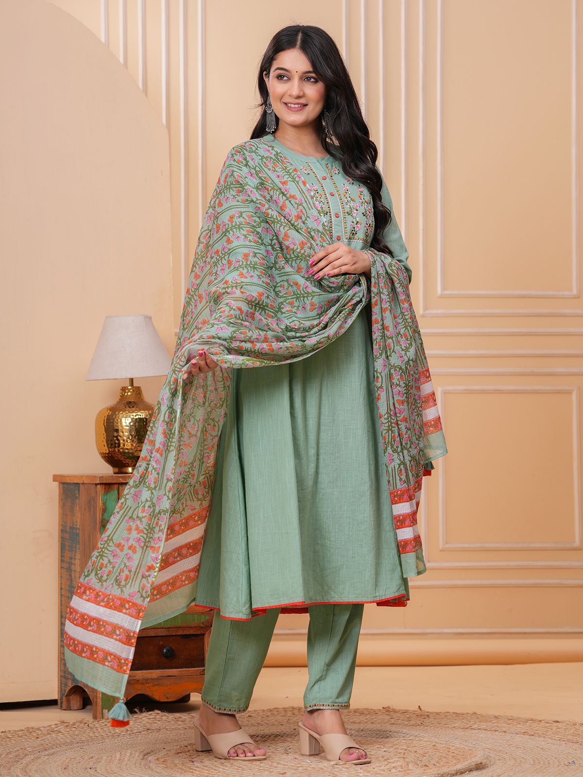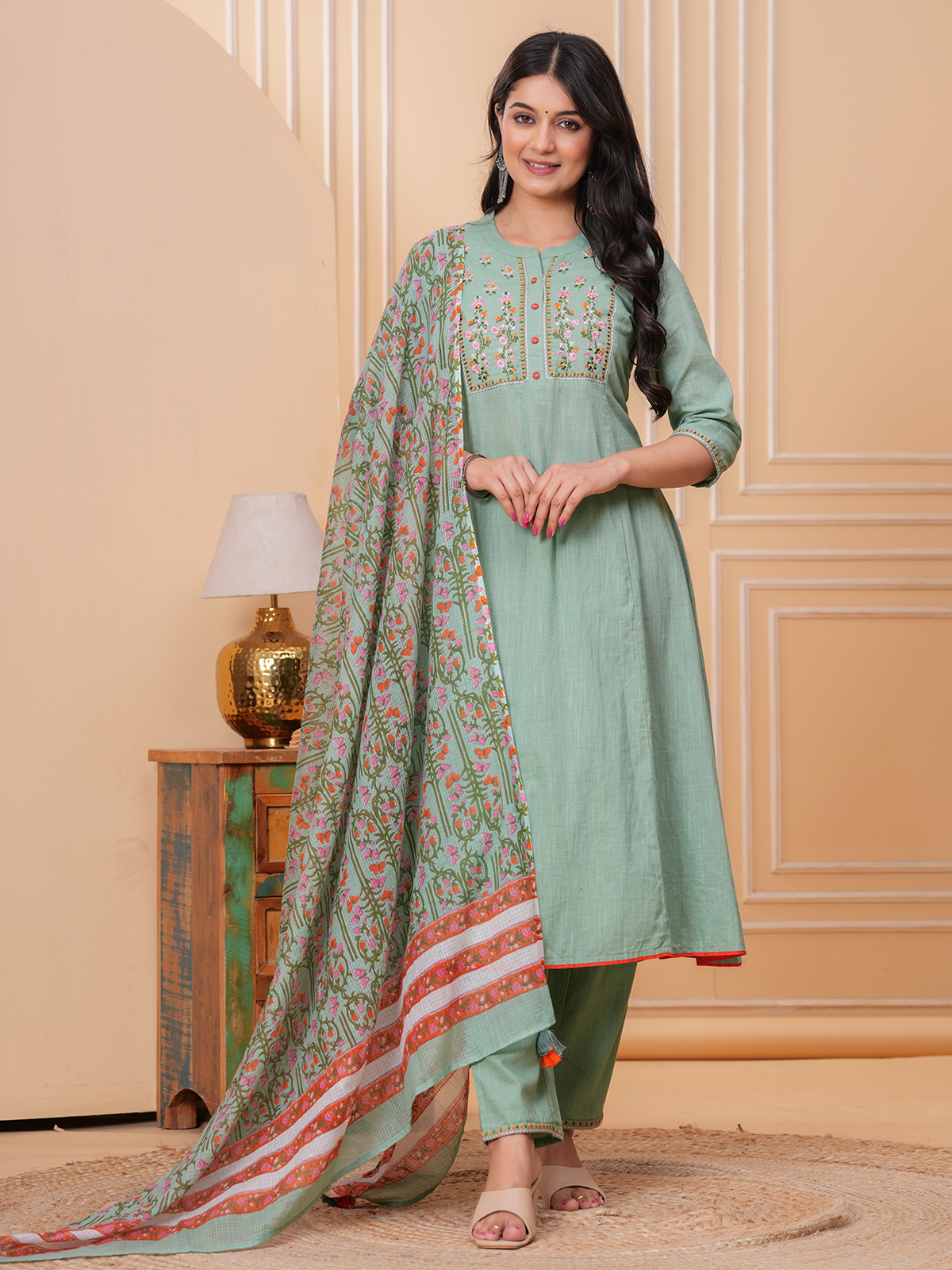 Pista Green Linen Sequined Embroidered Yoke Suit With Dupatta