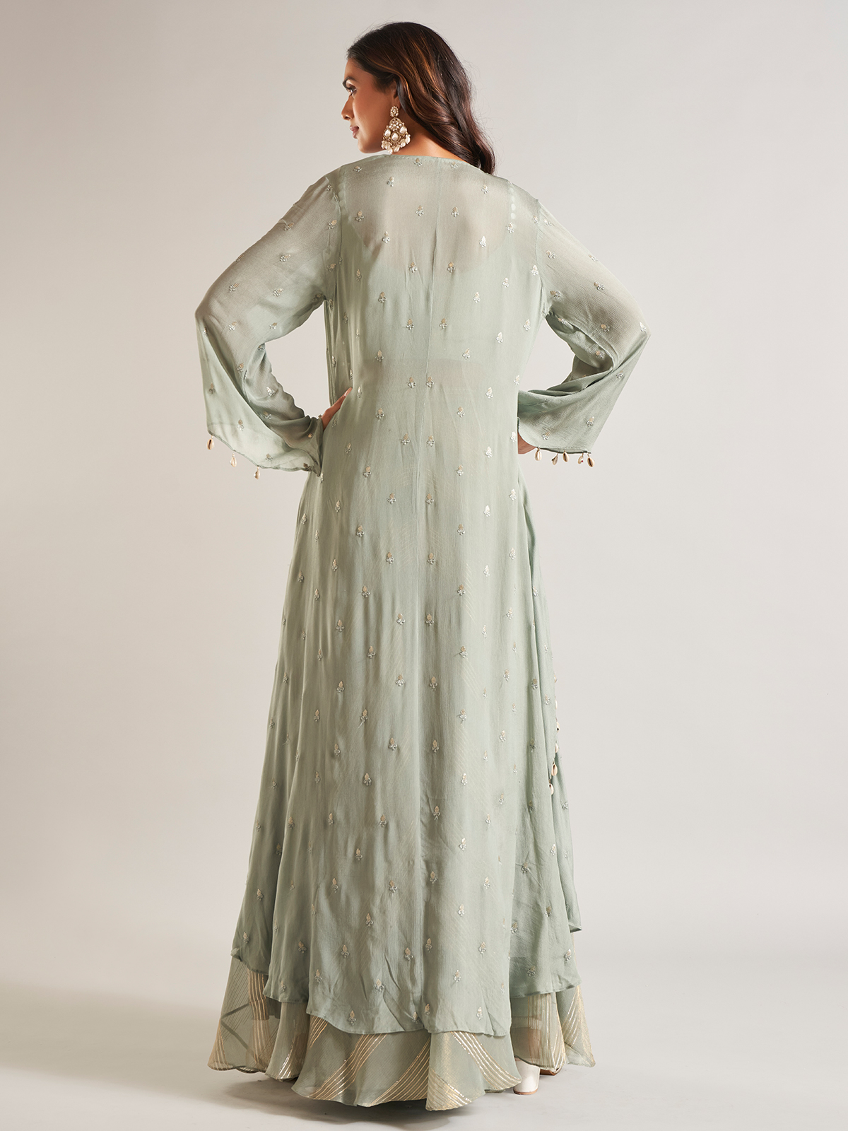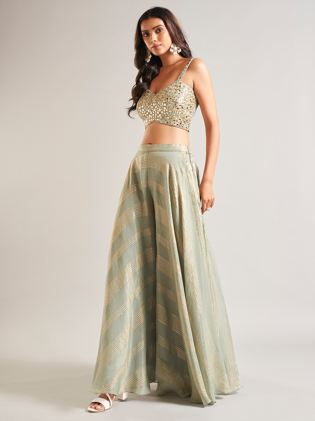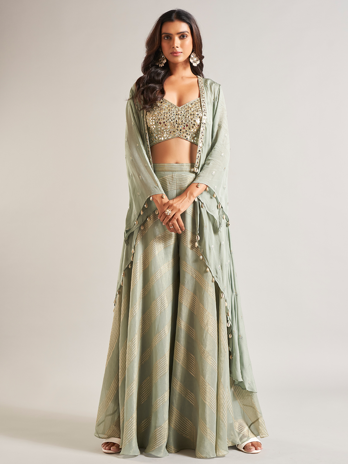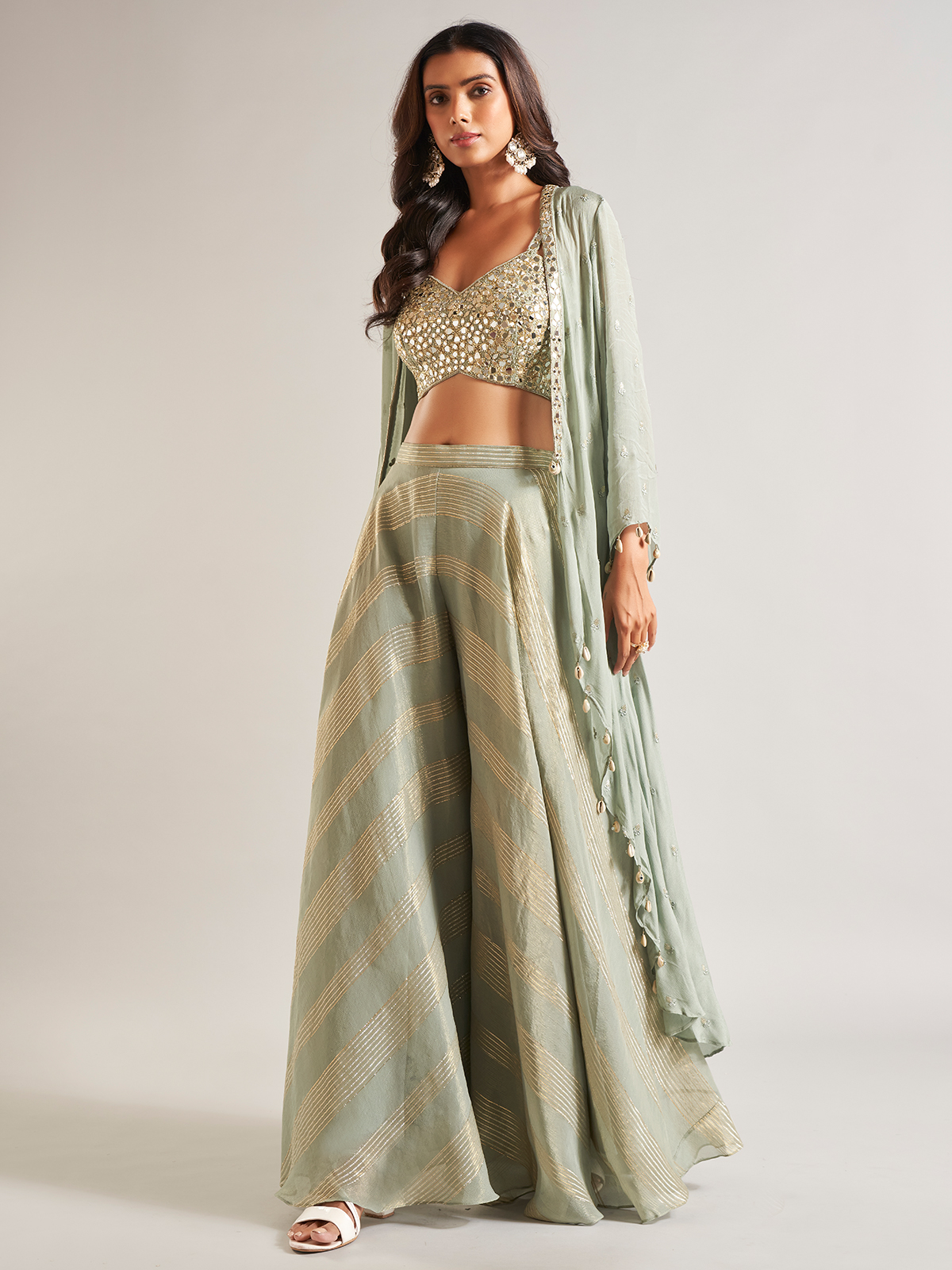 This pista green georgette jacket style palazzo salwar suit is designed for timeless style. Crafted in sequins, beads, mirror, cowrie shells and gota work.