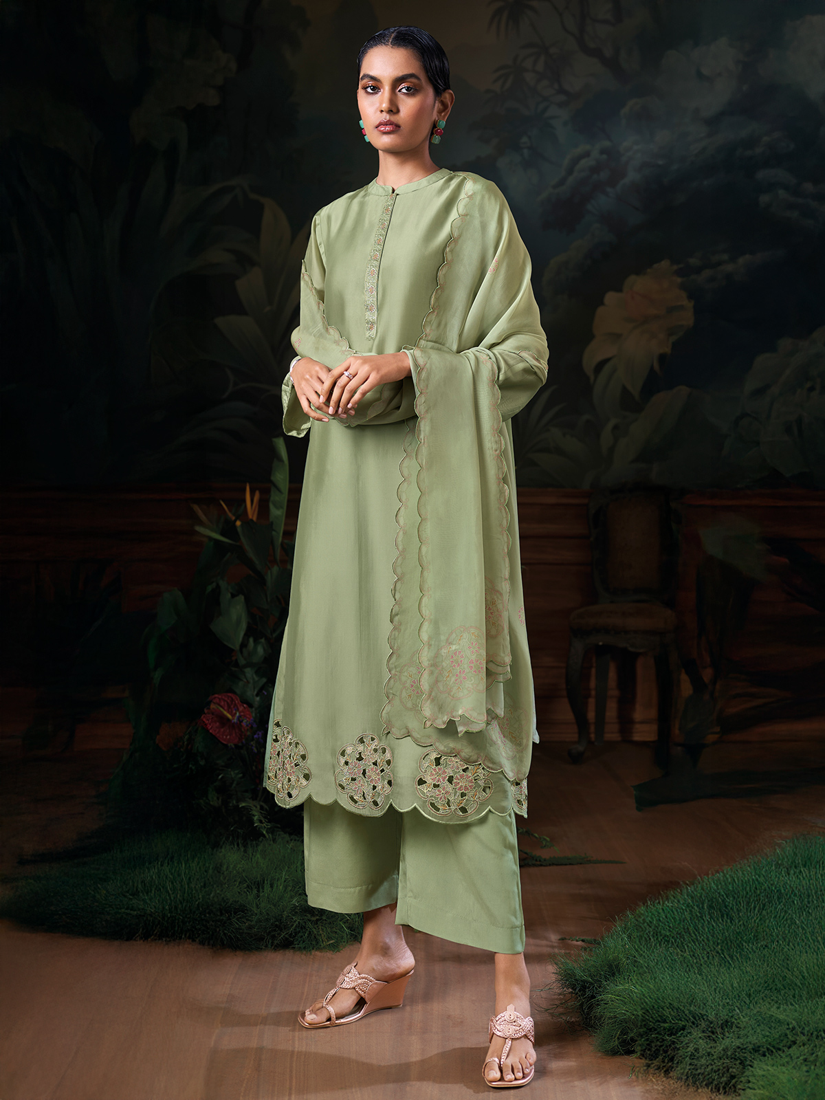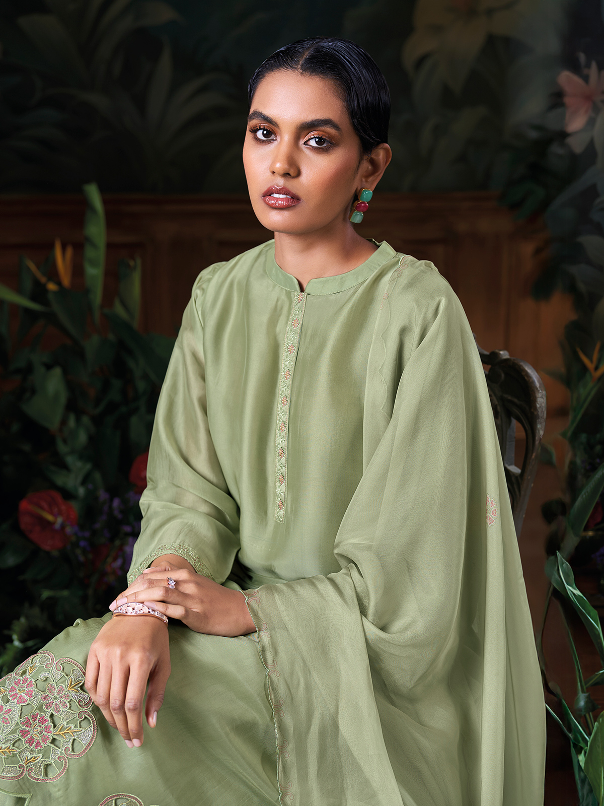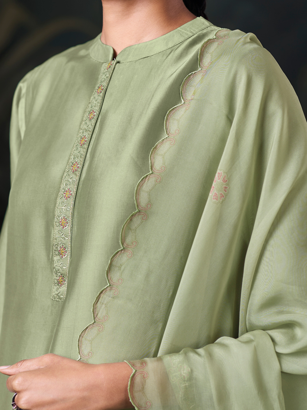 Turn heads with this pista green silk palazzo set, artistically enhanced with refined threadwork. The set includes a flowing dupatta, structured palazzo, stand collar neckline, and quarter sleeves making it an eye catching pick for weddings or festive functions.