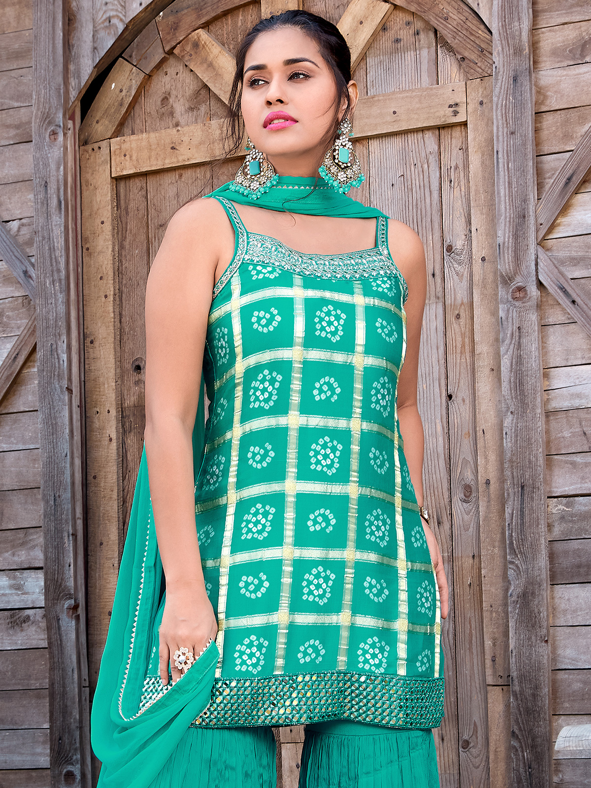 This gorgeous pista green patterned silk palazzo suit, embellished with exquisite zari work, pearls, beads, cutdana, sequins, and aabla, exudes sophistication. When paired with a dupatta, the sleeveless style and round neckline make it a stylish option.