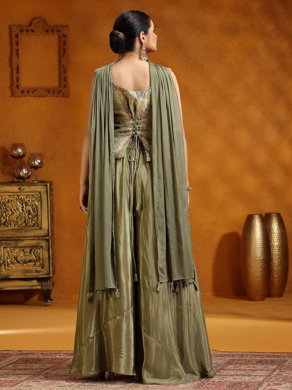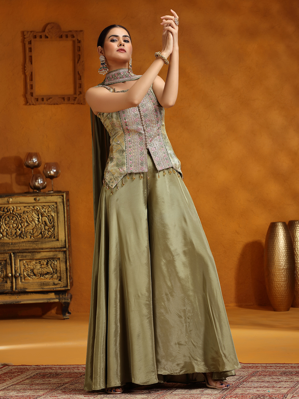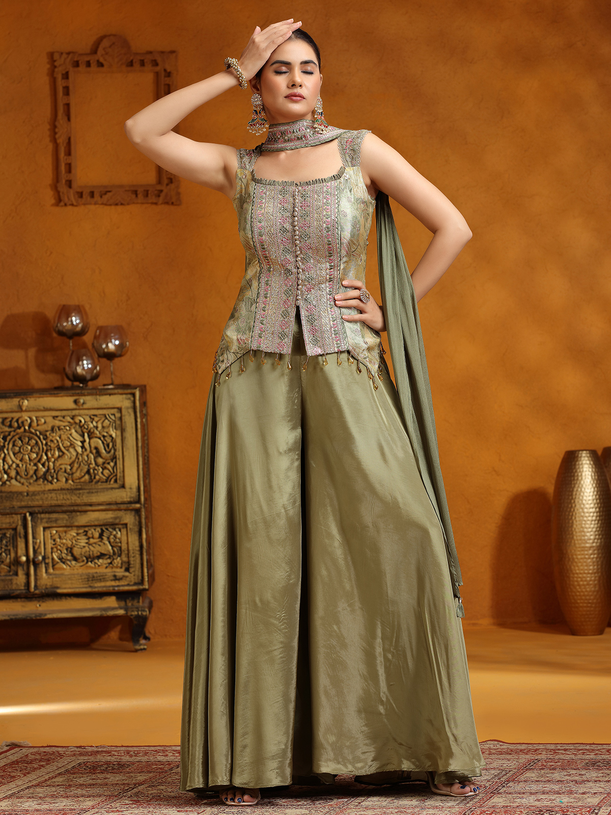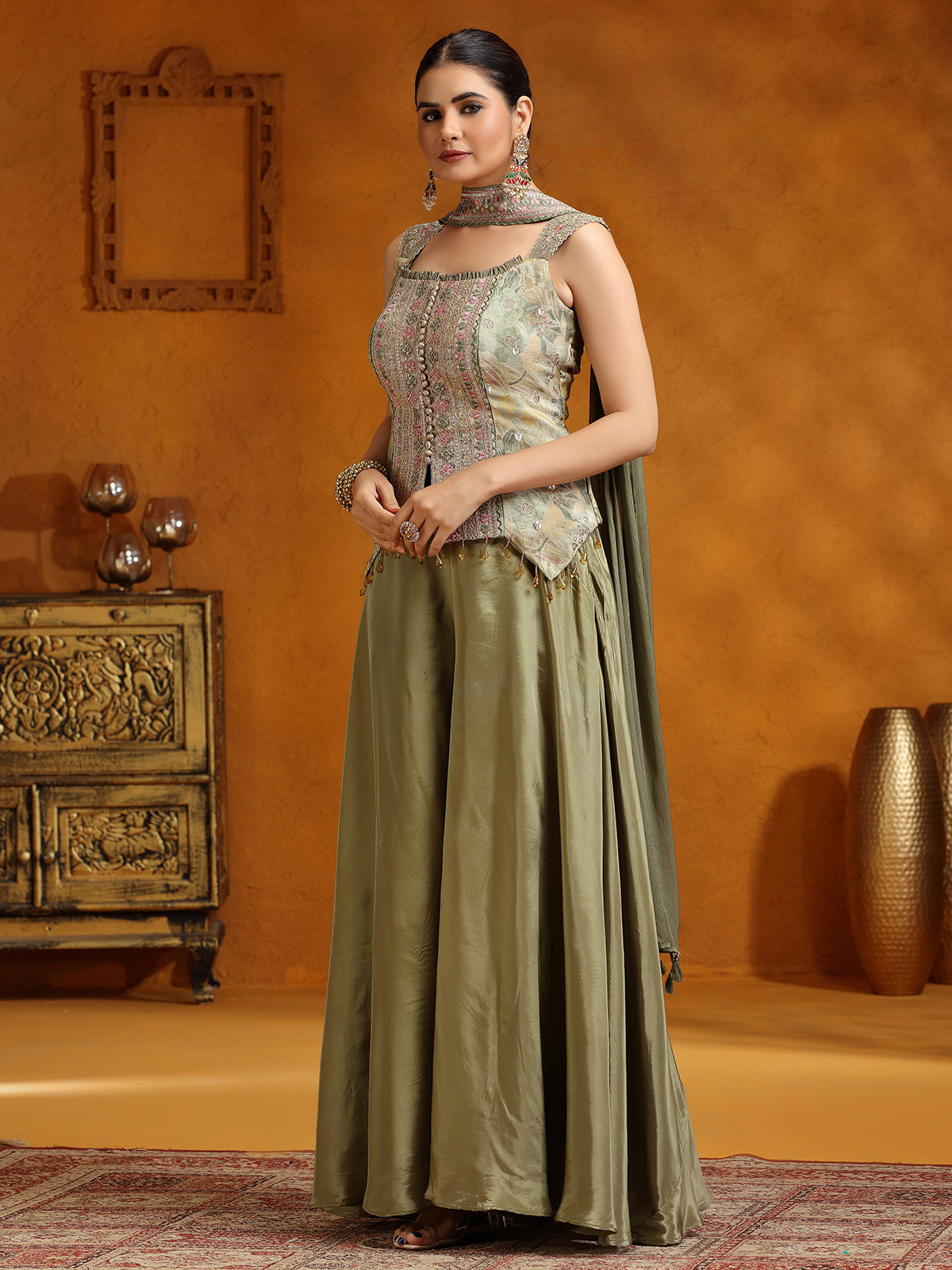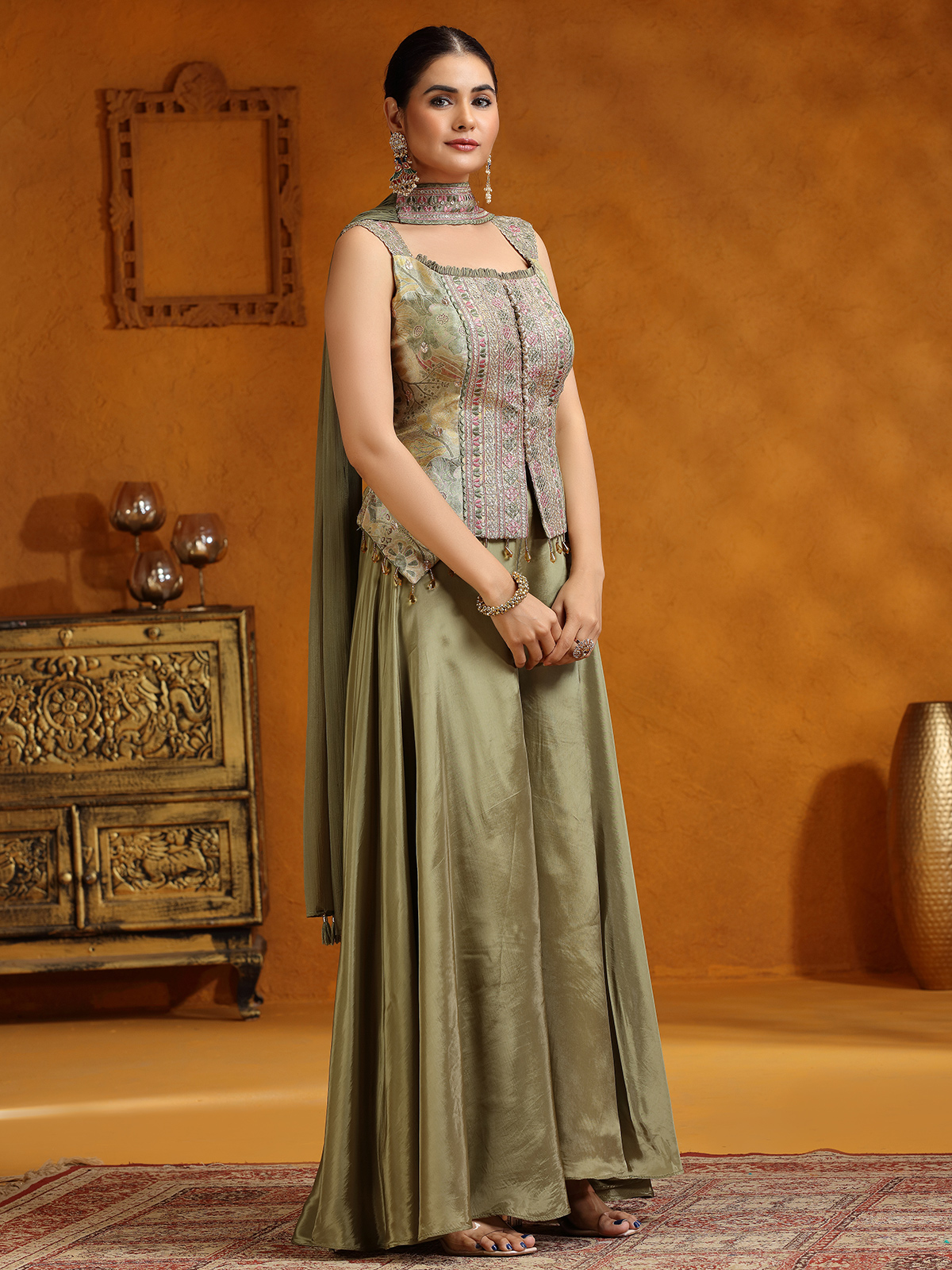Designed for timeless elegance, this pista green sarib silk salwar suit features exquisite embroidery with resham, sequins, and beads work. It includes a round neck and sleeveless pattern.