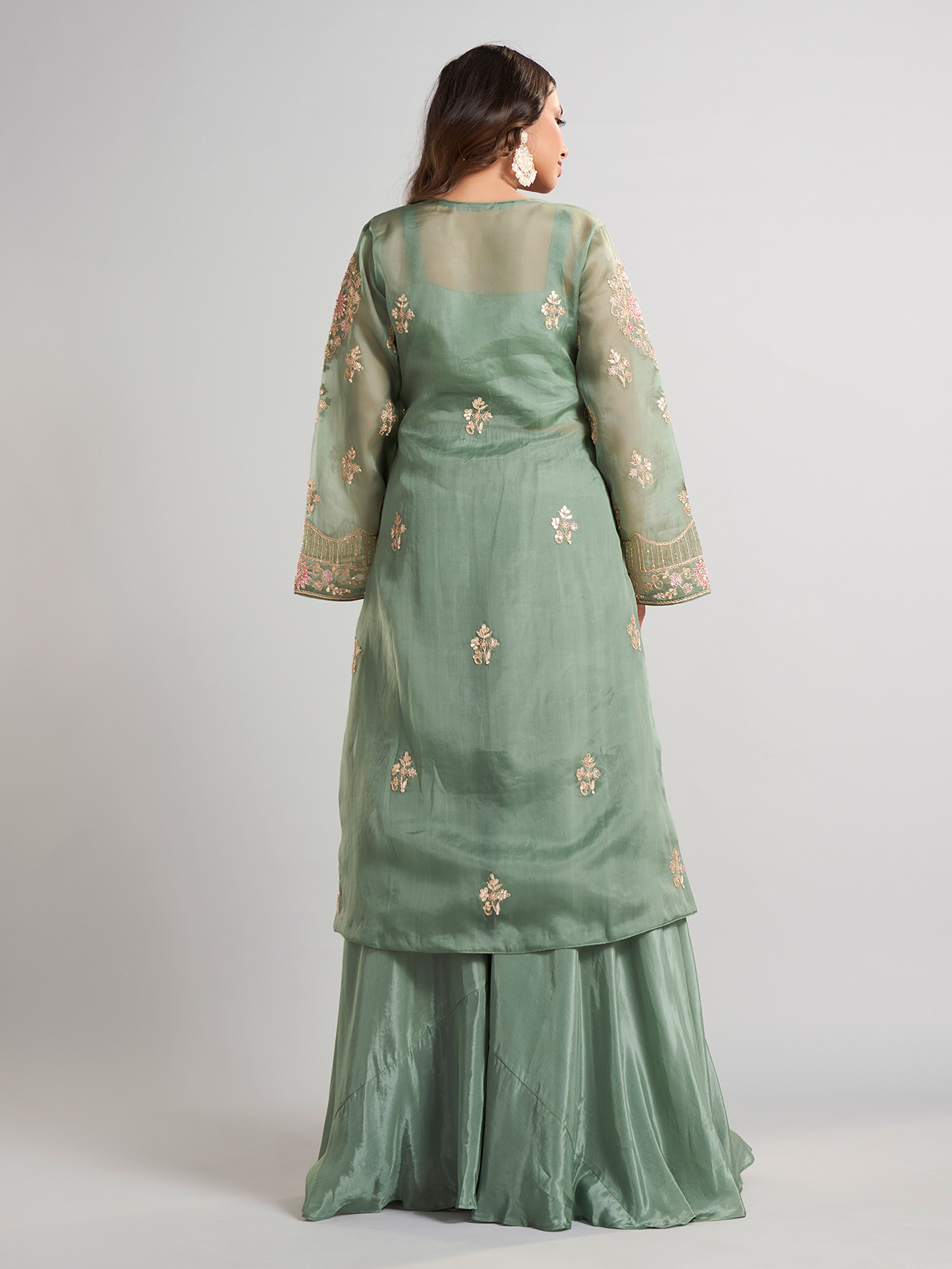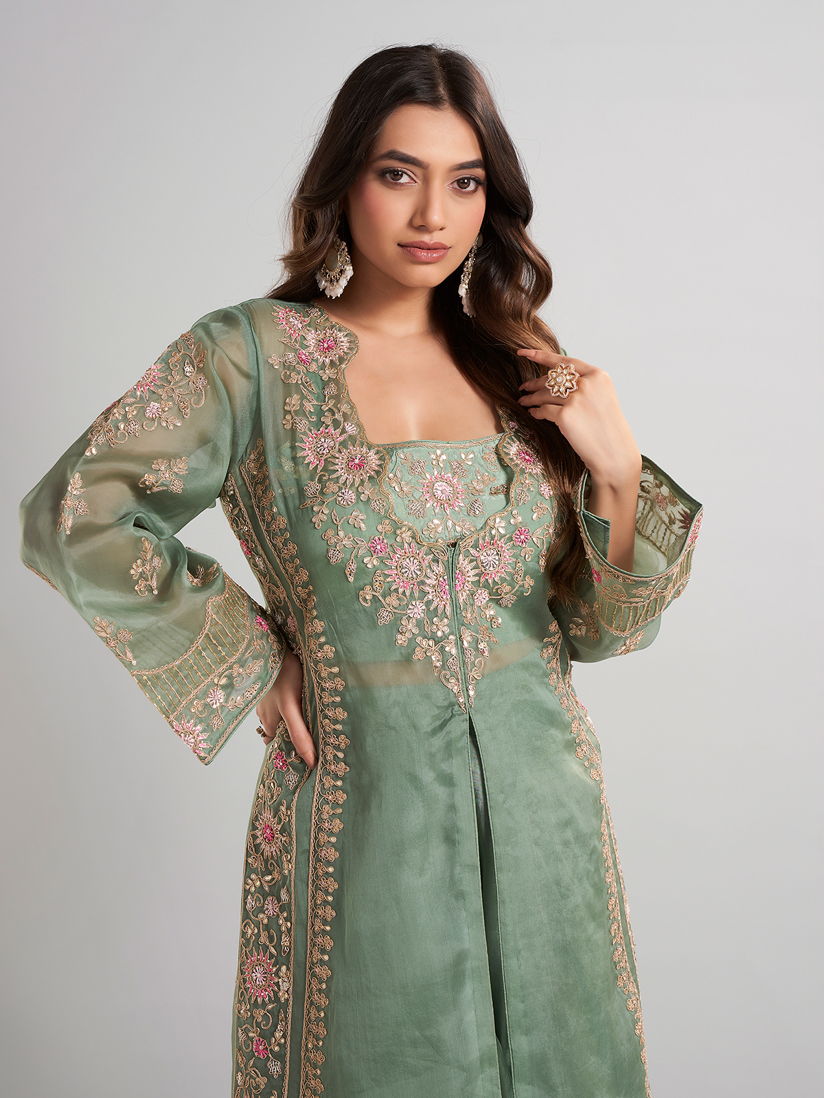 Charming in pista green, this Pakistani palazzo suit in tissue and satin silk is adorned with sequins, thread, zardosi, resham, beads, and gota. A luxurious ensemble designed for weddings and festive gatherings, fusing classic finesse with modern refinement.