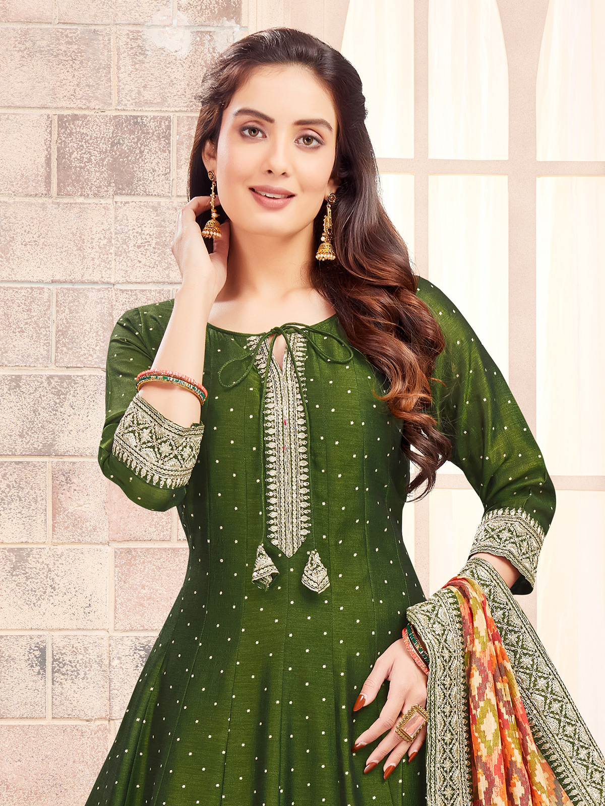 Shine in the exquisite green silk salwar suit, a truly unique piece. Its distinct charm is highlighted by the intricate sequins and resham work. Featuring a keyhole neckline and quarter sleeves, it’s complemented with a matching dupatta to complete the look.