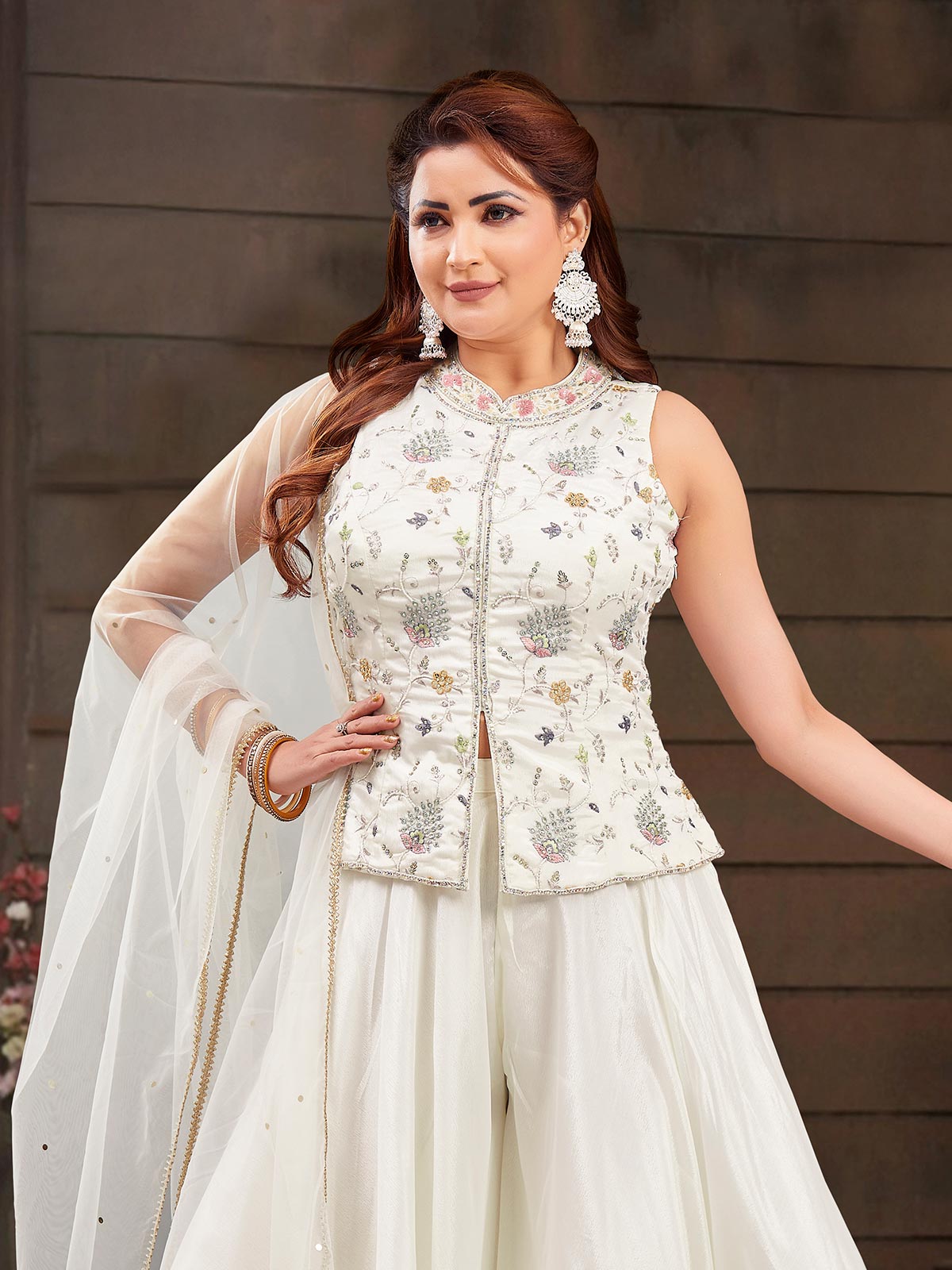 This white silk palazzo suit beautifully blends tradition and modern style, making it sure to captivate all eyes. It is intricately adorned with embroidery, resham, sequins, stones, and cutdana work. The suit features a flattering stand collar neck and a sleeveless design for a contemporary touch. Paired with matching bottoms and a dupatta, this ensemble is perfect for any celebration.