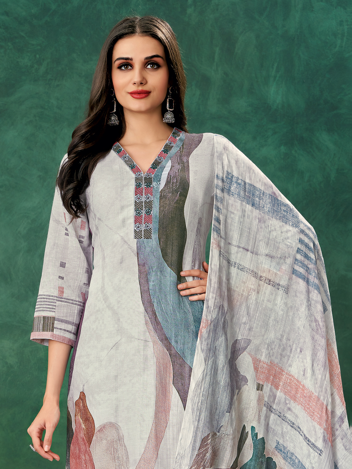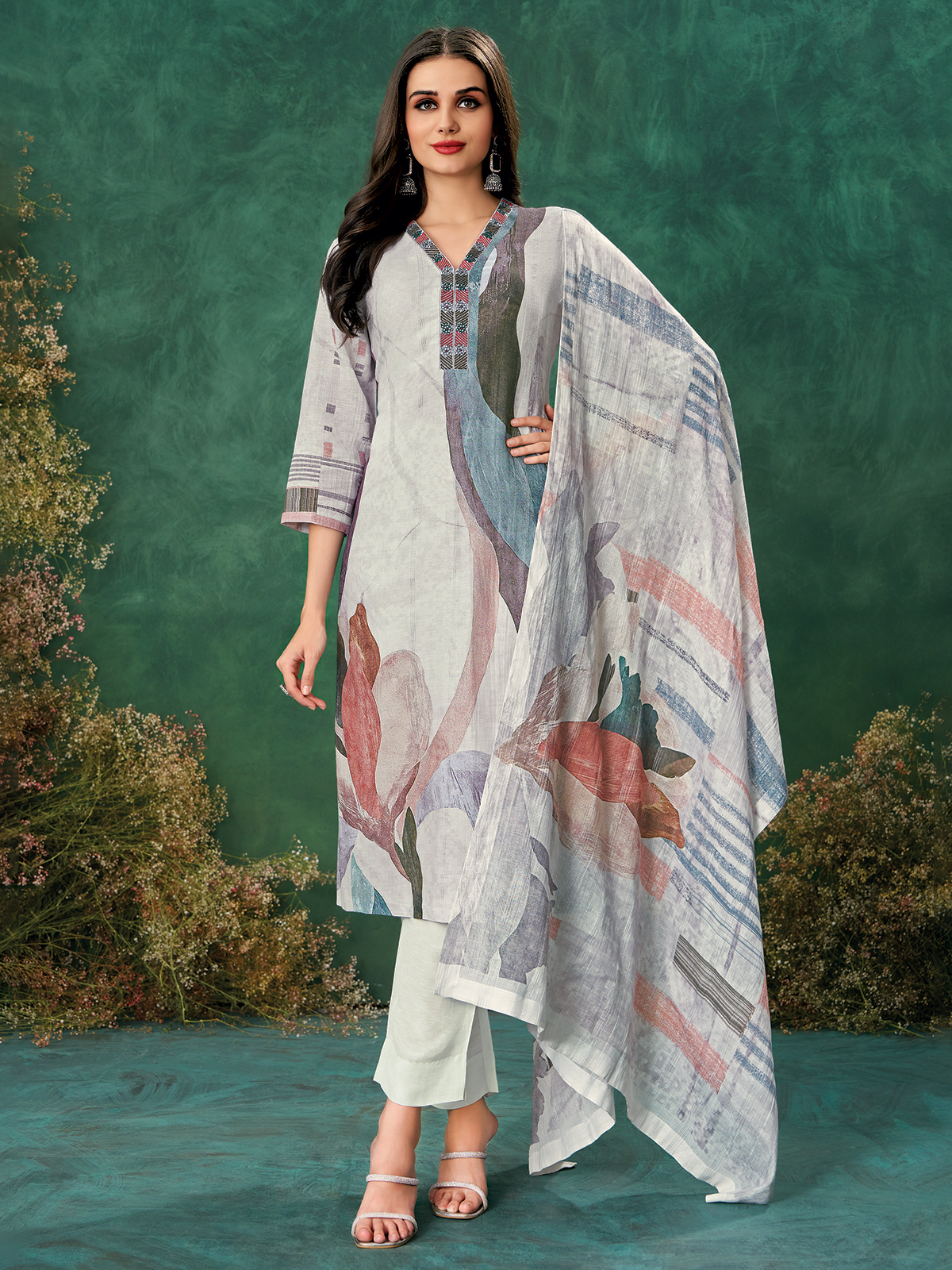 Understated and elegant, this grey salwar suit combines simplicity with sophistication. Crafted from breathable linen fabric, it is detailed with graceful printed motifs and subtle thread and bead embellishments. The V-neckline and quarter sleeves add a modern touch. Complete with coordinating pants and dupatta.