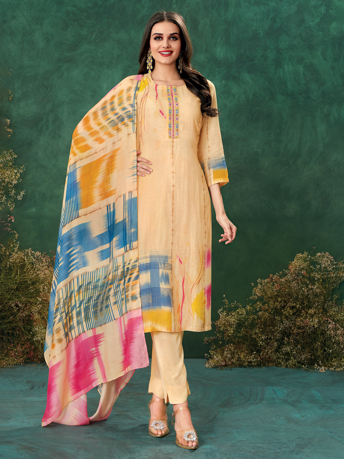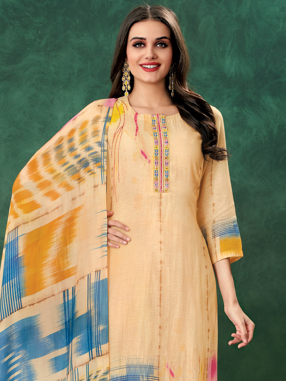 Add a charming twist to your everyday look with this peach salwar suit, made from soft linen fabric. The delicate thread and bead work complements the playful printed patterns beautifully. Featuring a round neckline and quarter sleeves, it offers the perfect blend of comfort and style. Comes with matching pants and dupatta for a ready-to-wear outfit.