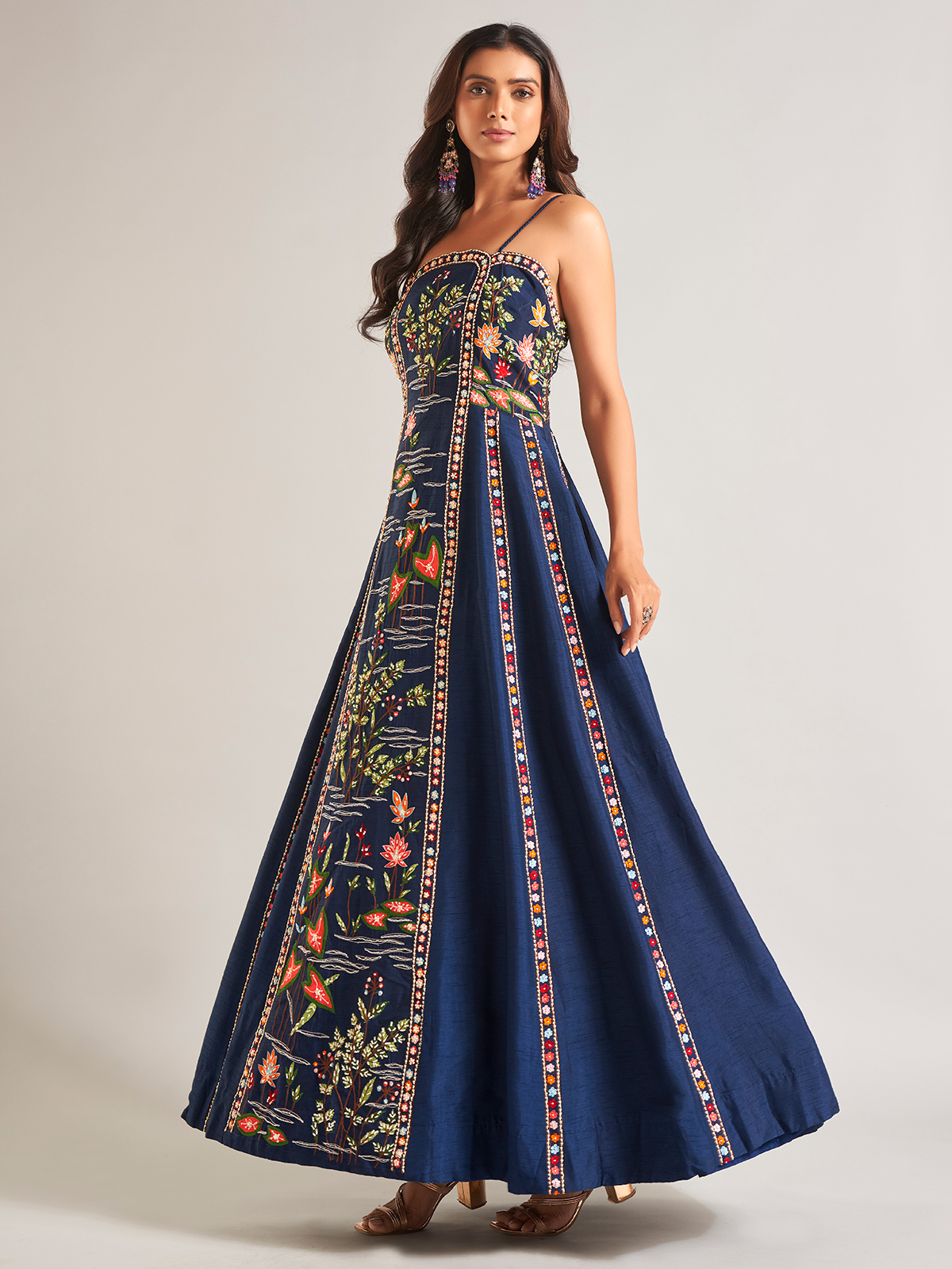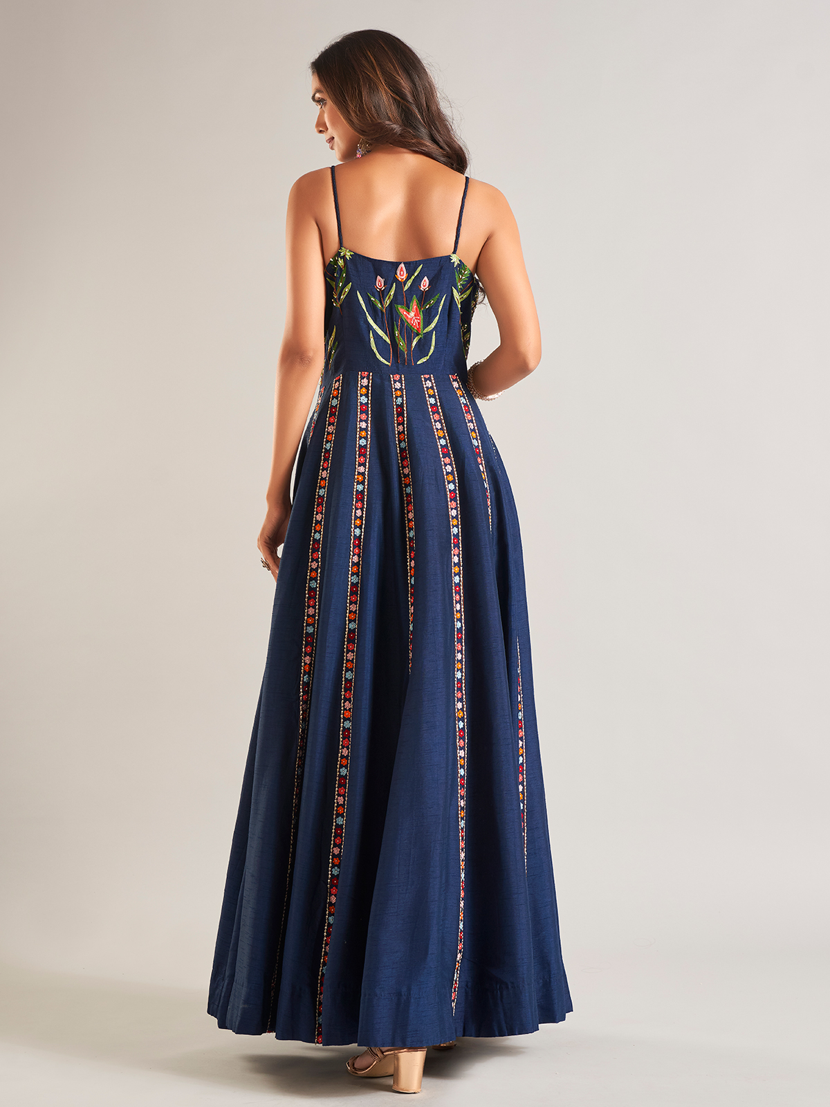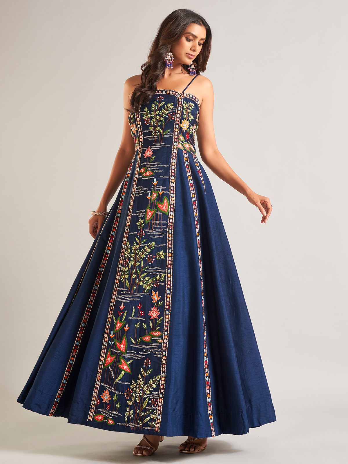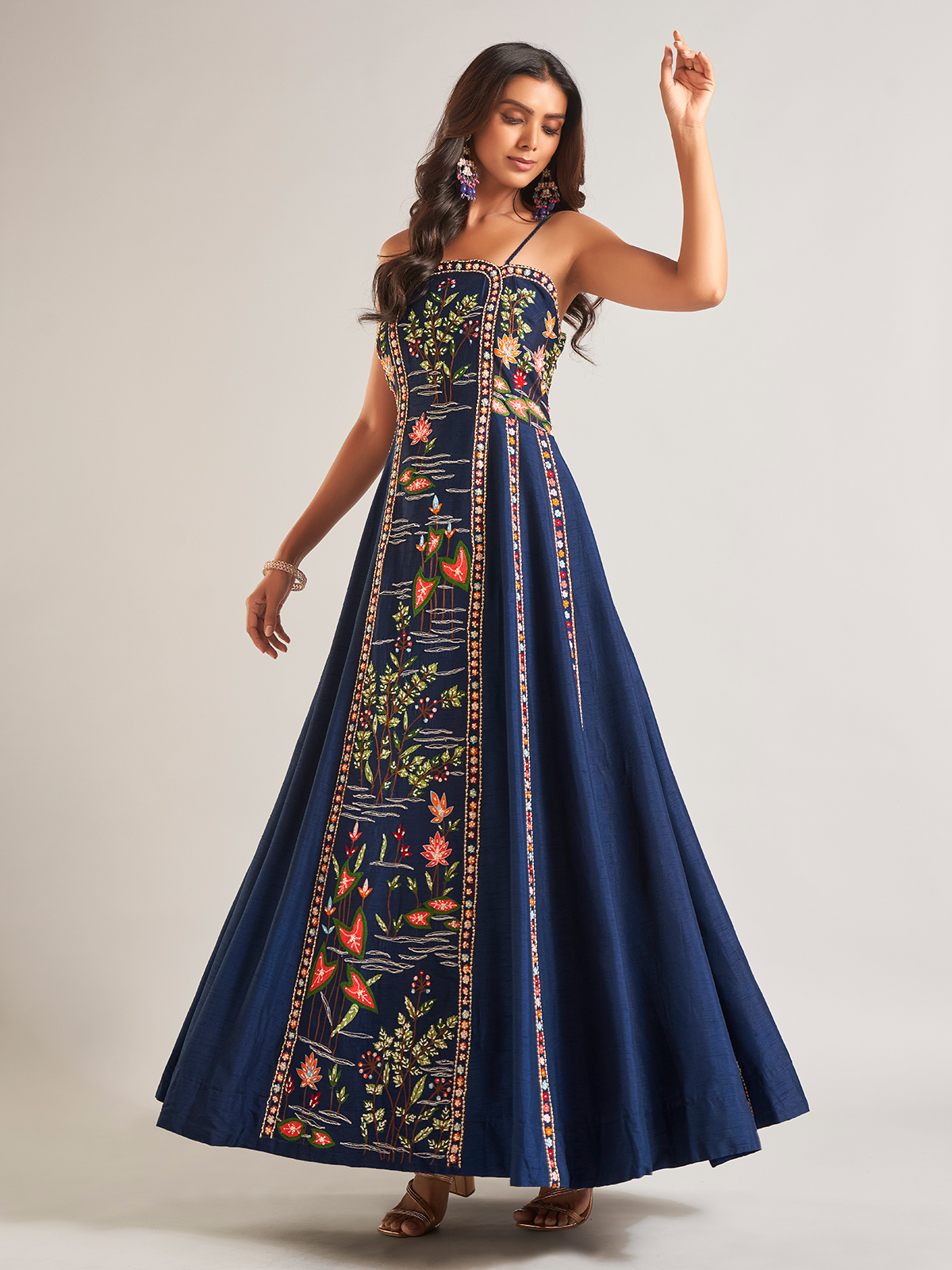 This prussian navy raw silk salwar suit is ideal for parties. Adorned with intricate beads, sequins, thread, and resham work, it features a sophisticated sleeveless design.