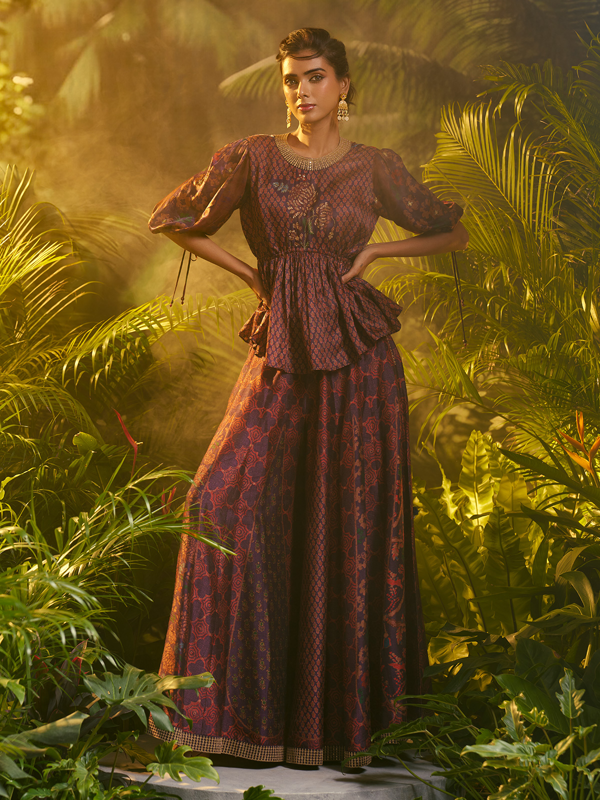 A vibrant interplay of tones graces this purple and red silk palazzo suit. Printed detailing adorned with resham and sequins enriches its festive elegance. With a round neckline, elbow sleeves, and palazzo pants, it creates a radiant look for celebrations steeped in cultural charm.