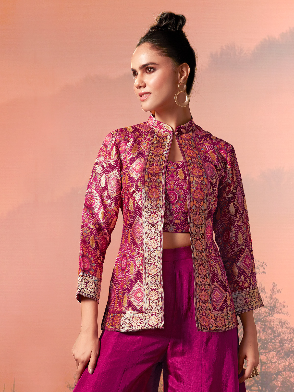 Purple Bandhej Printed Silk Jacket Style Palazzo Suit