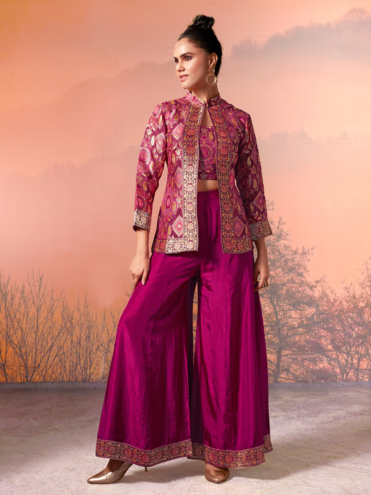 This purple silk palazzo suit. Showcases traditional bandhej prints enhanced with classic zari detailing. Styled in a jacket pattern, it blends heritage charm with modern structure. The palazzo adds fluid elegance, making it a distinctive pick for weddings, festive occasions and reception celebrations with ethnic flair.