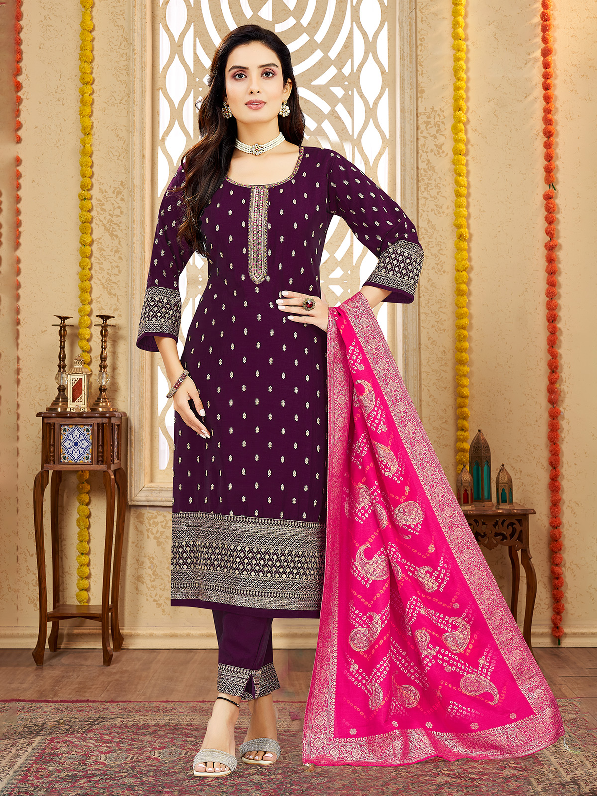 Traditional beauty meets comfort in this purple cotton silk salwar suit, featuring intricate zari, zardosi and sequin accents. The quarter sleeves and round neck lend a classic appeal, while the dupatta and pants ensure a poised festive look for cultural events.