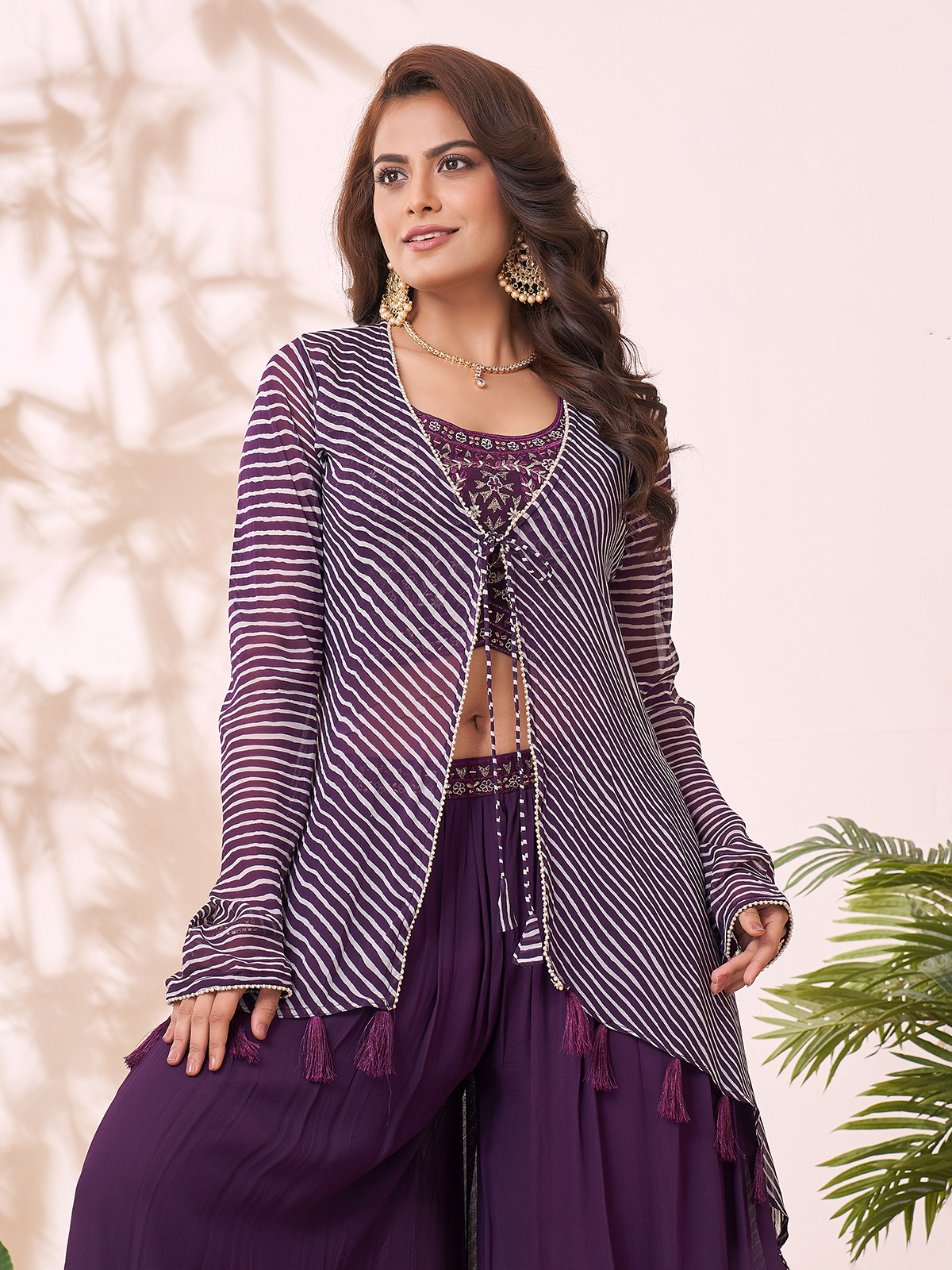 Light and striking, this purple georgette palazzo suit is designed in a jacket style with resham, aabla, and stone work—perfect for Raksha Bandhan or ethnic gatherings.