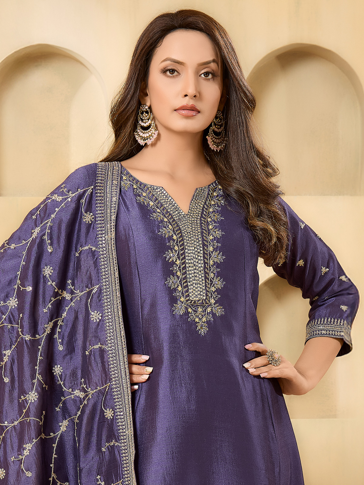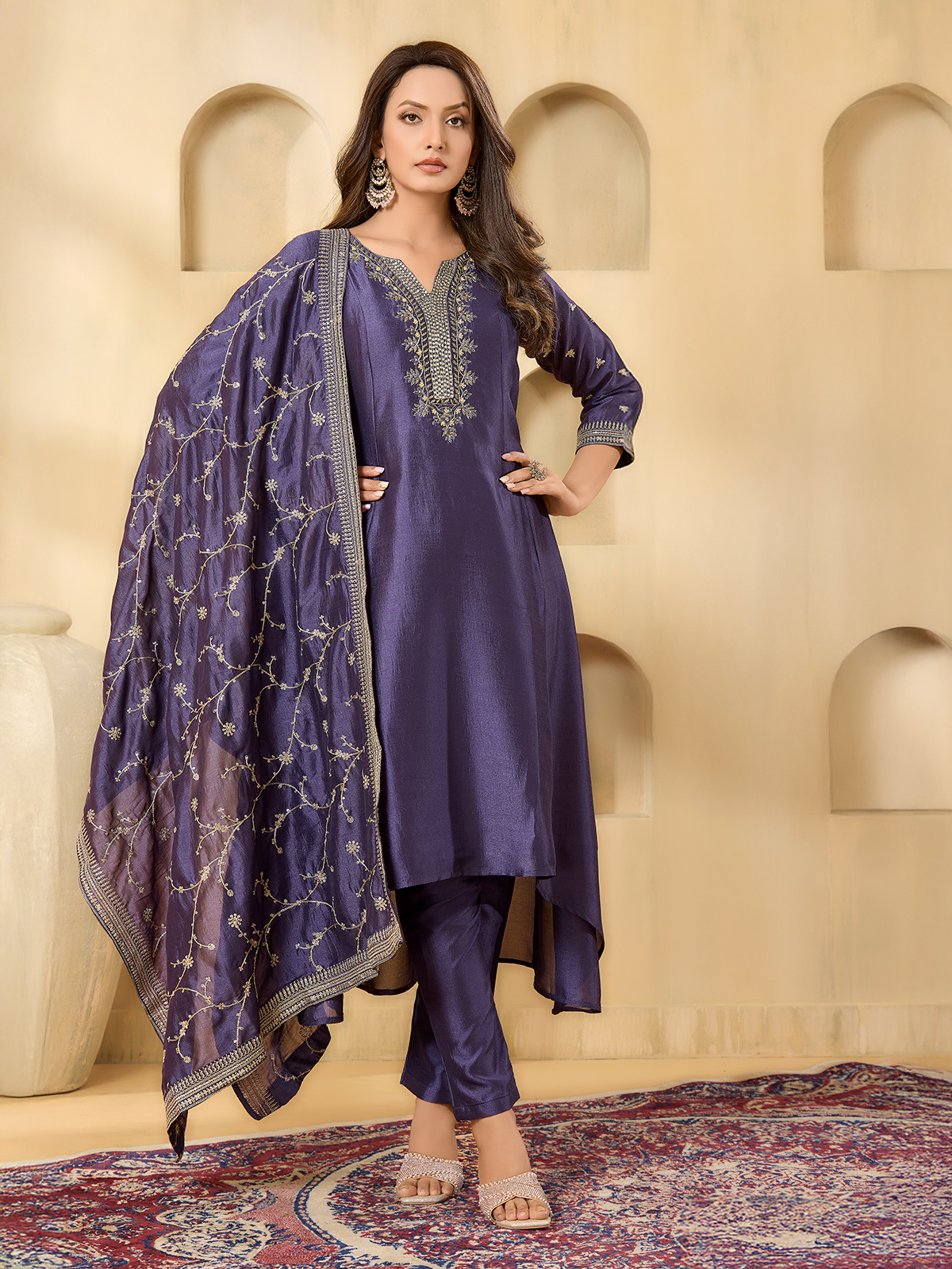 Rich purple silk salwar suit. Highlighted with embroidery, sequins, cutdana, mirror, beads and thread detailing. Featuring quarter sleeves, it is paired with a pant and dupatta, making it a graceful choice for wedding festivities.