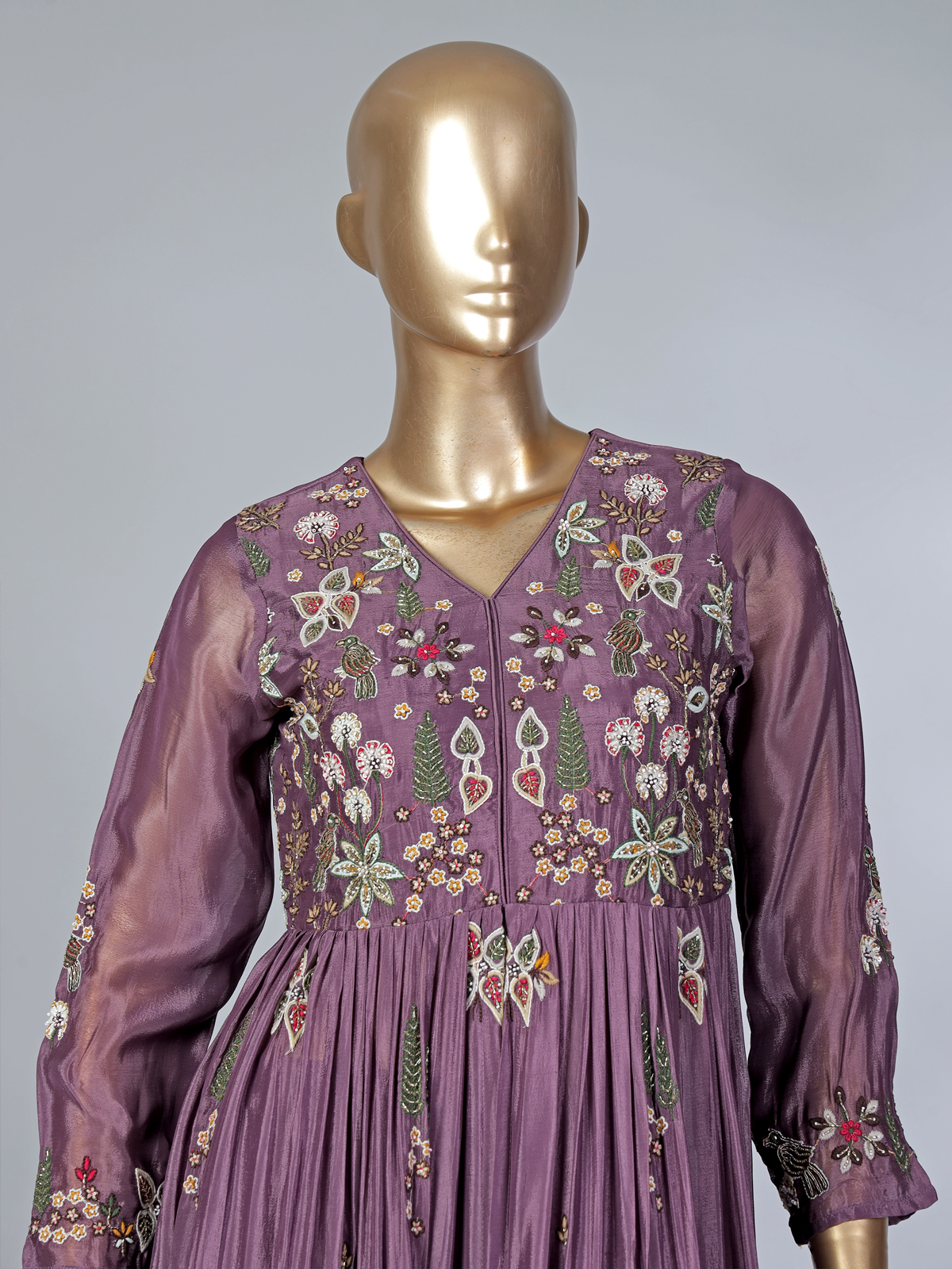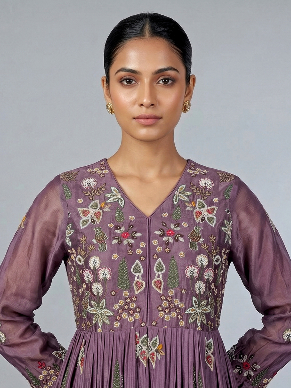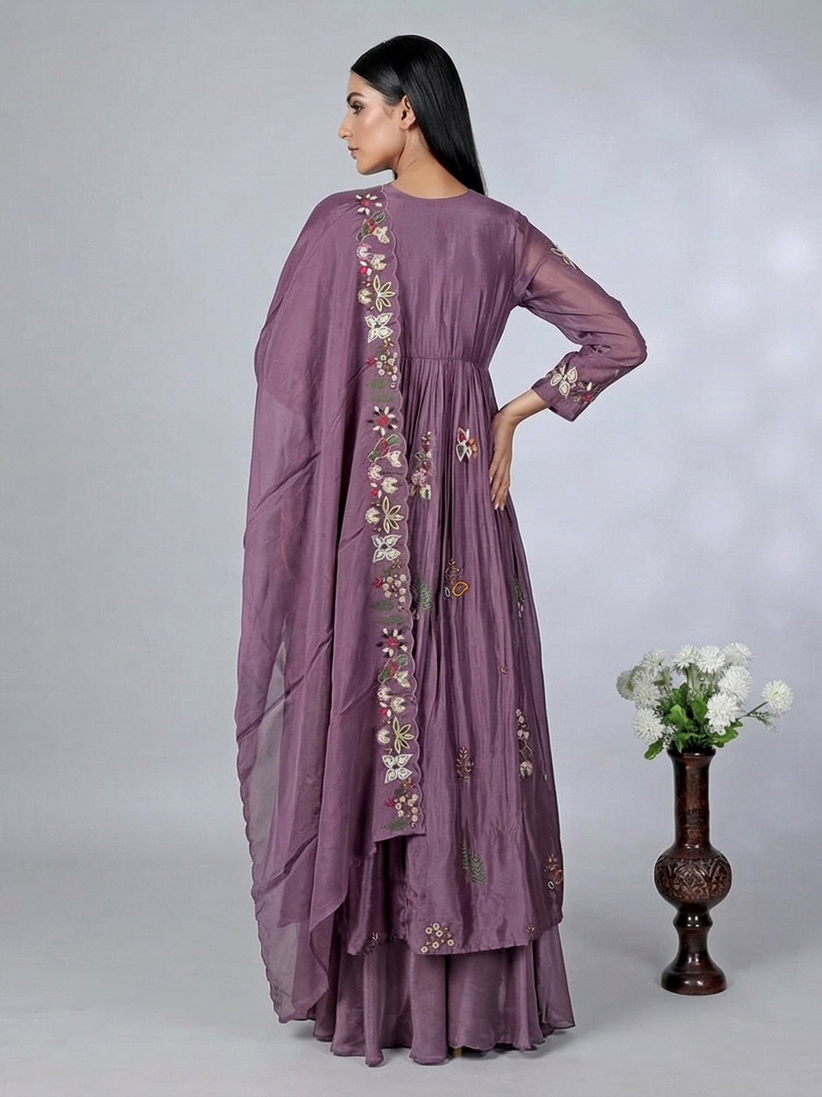 Inspired by classic pakistani silhouettes, this purple silk palazzo suit exudes refined festive elegance. Detailed with cutdana, beads, zardosi and thread work, the outfit glows with artistic charm. A V neckline and quarter sleeves enhance its grace, while the flowing palazzo and dupatta complete this sophisticated festive look.